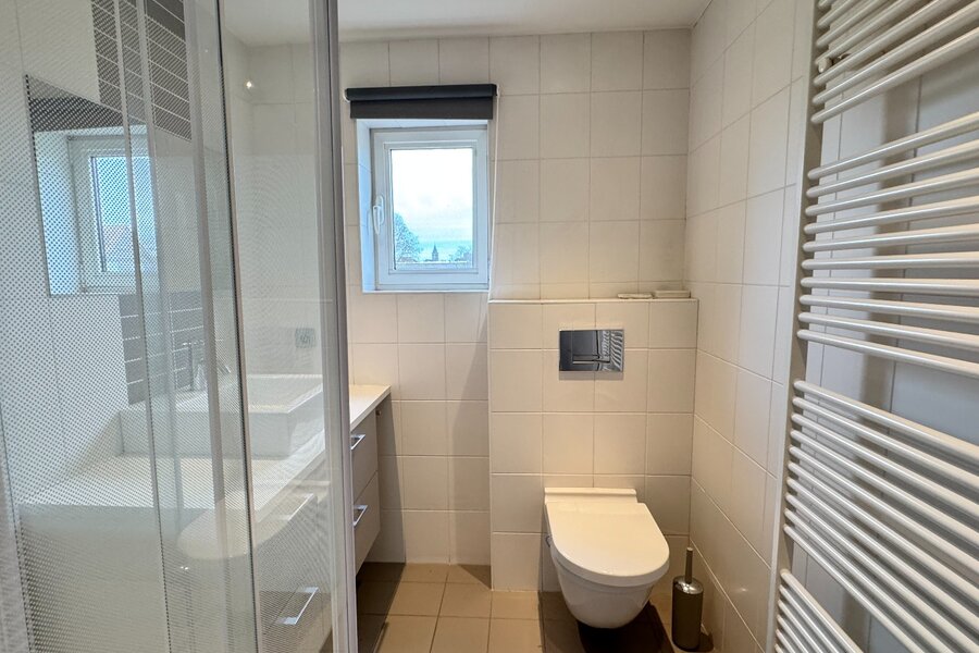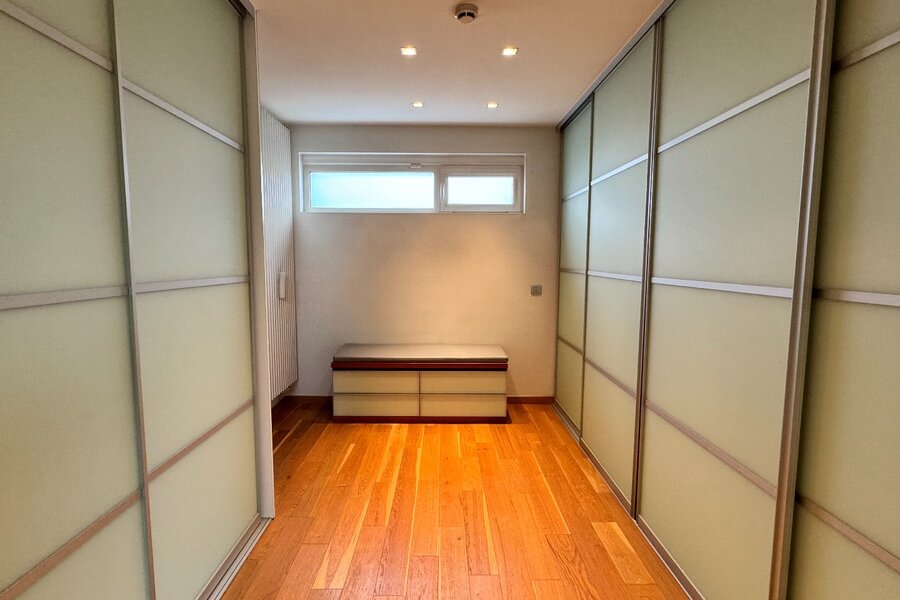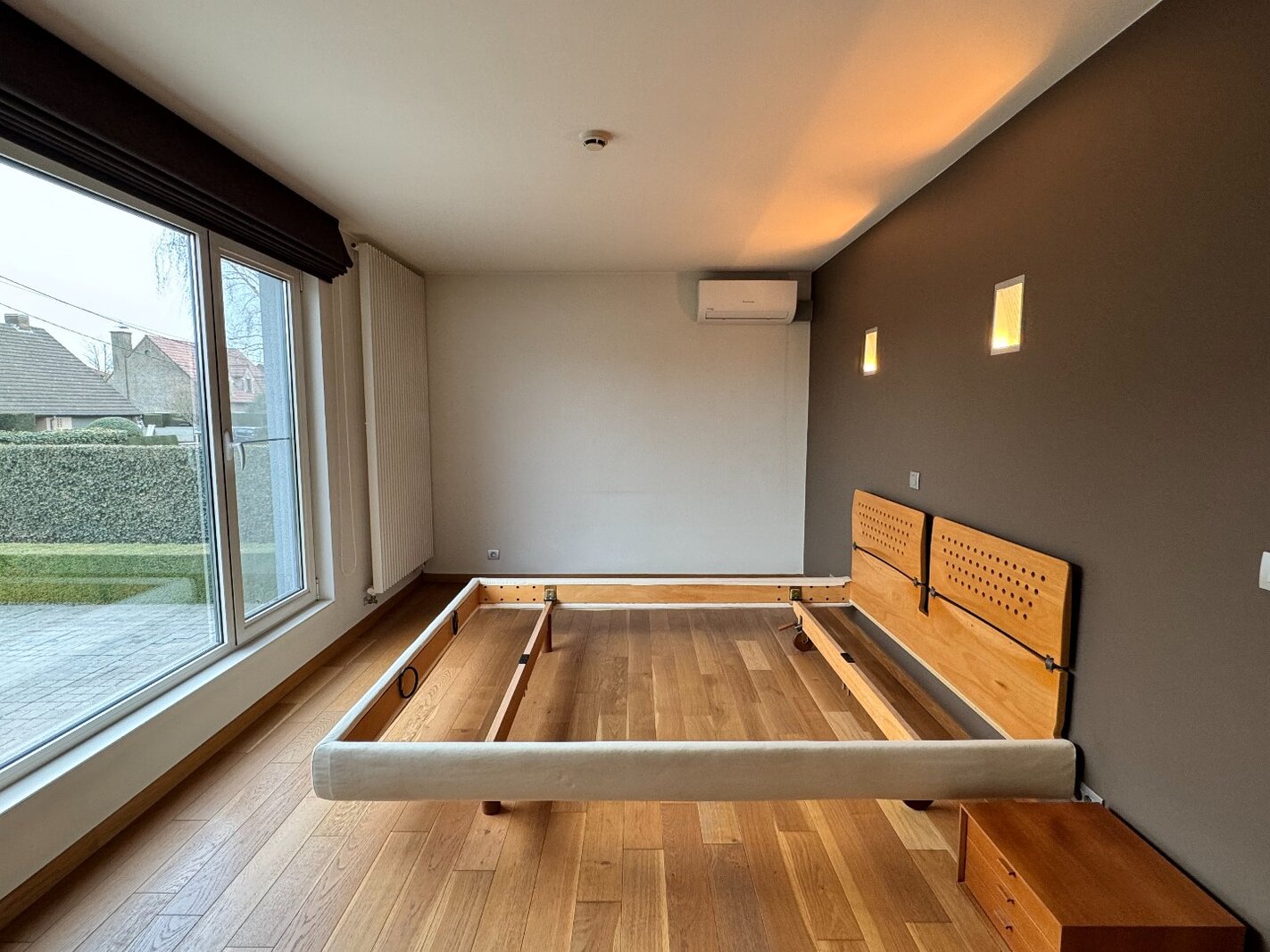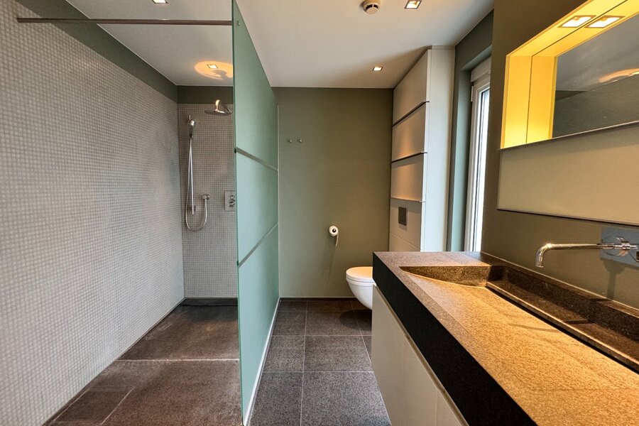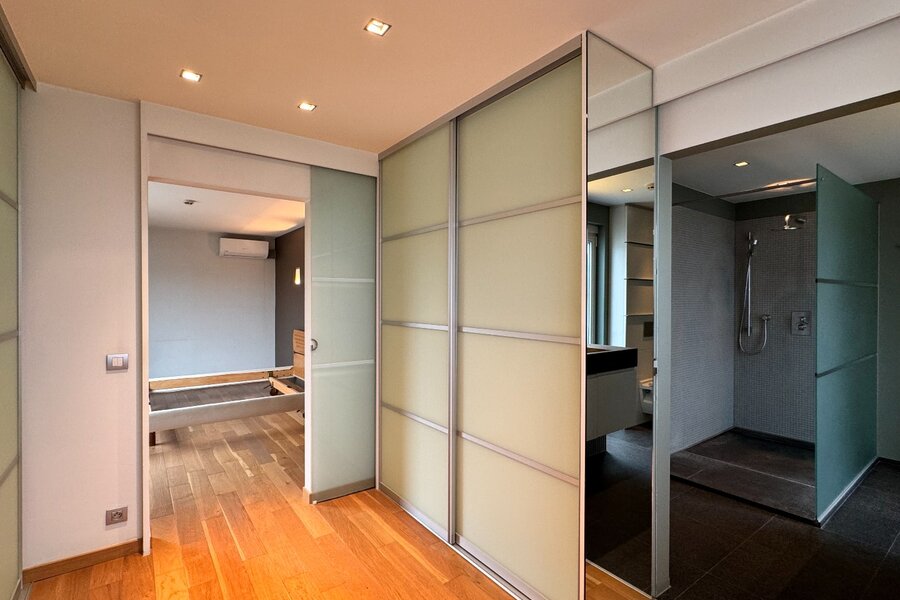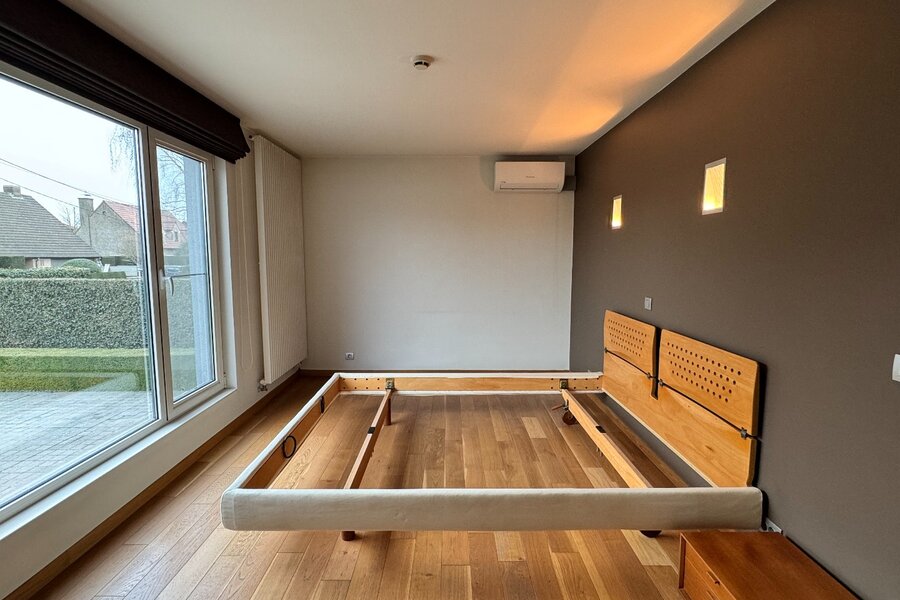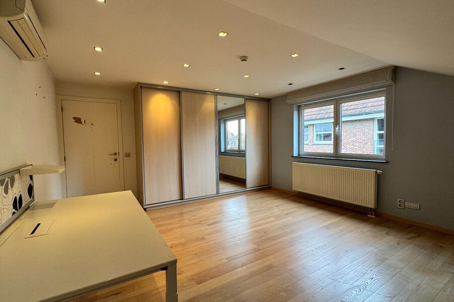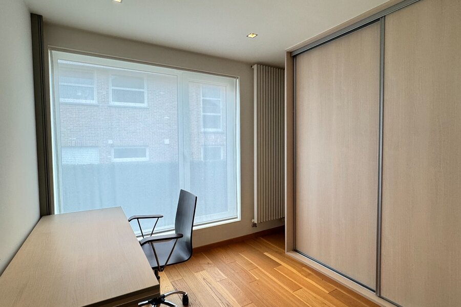 Op het tussenniveau bevindt zich de masterbedroom met ensuite dressing en een eerste badkamer, uitgerust met toilet, inloopdouche en lavabo. Op dit niveau is eveneens een bureauruimte voorzien, die ook als extra slaapkamer kan worden ingericht.