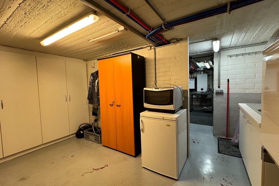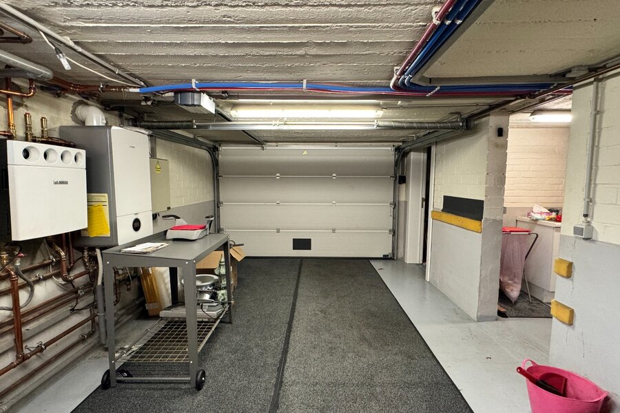 De kelderverdieping omvat de garage met geautomatiseerde poort, een vorstvrije oprit en twee extra bergruimtes.