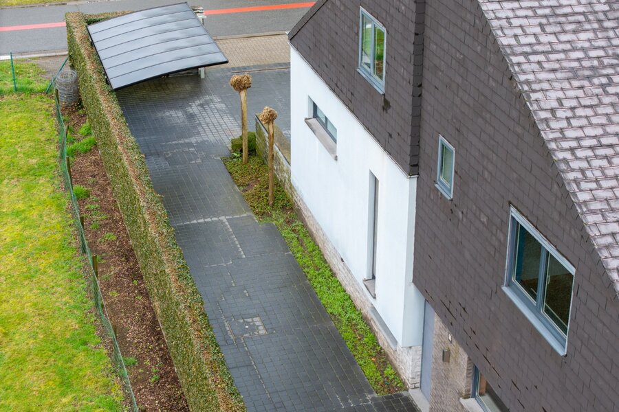De woning is volledig afgesloten via een geautomatiseerde poort aan de straatzijde. Vooraan zijn meerdere parkeerplaatsen voorzien en achteraan geniet u van een zeer aangename, onderhoudsvriendelijke tuin.