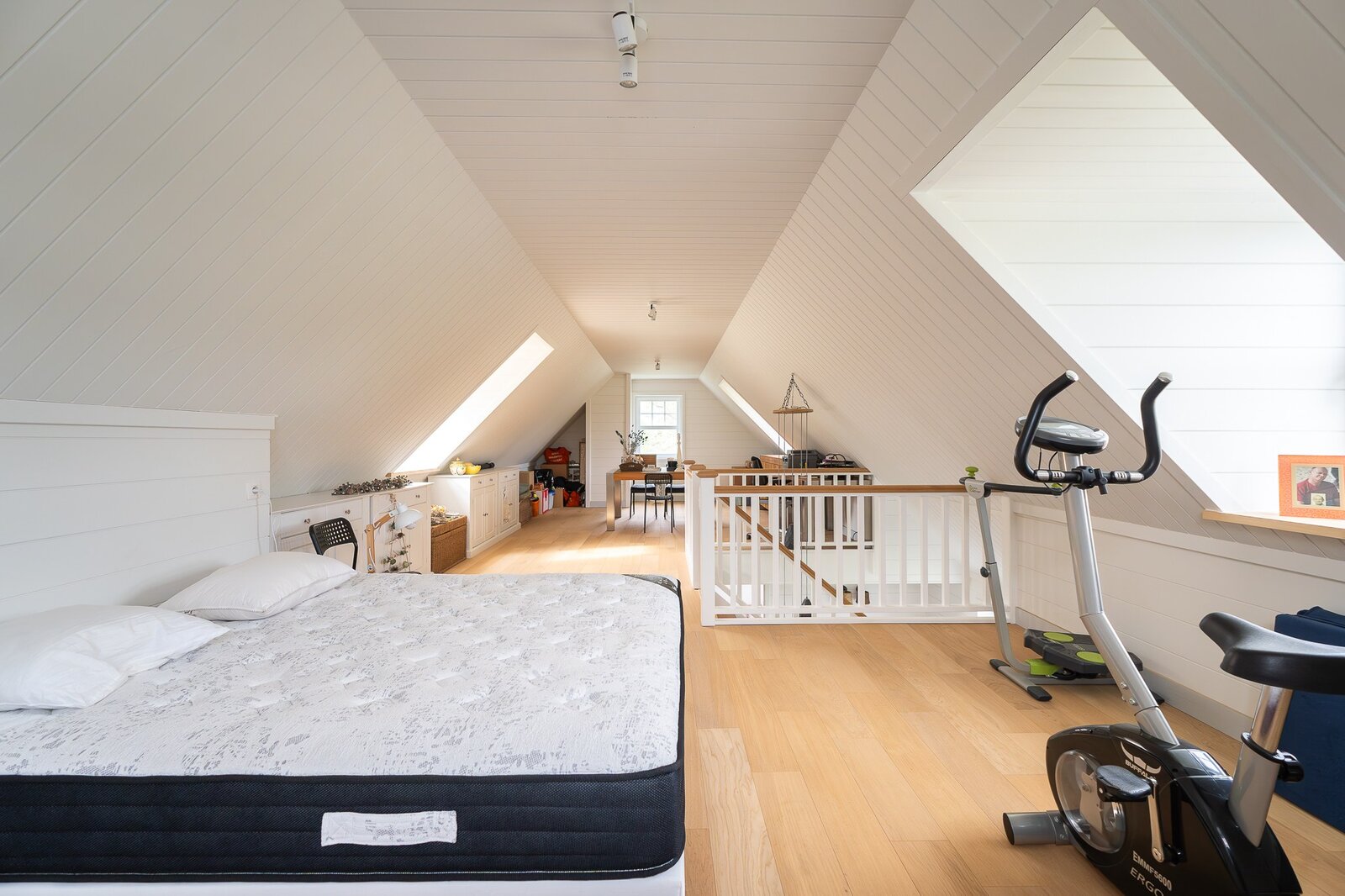 Het gelijkvloers bestaat uit een inkomhal met vestiaire en apart toilet, een ingerichte keuken met bijkeuken, een eetkamer die uitkomt op het terras en de tuin, en een gezellige woonkamer met open haard. Op de verdieping geeft de nachthal toegang tot twee slaapkamers, een badkamer, een wasruimte (mogelijk badkamer of slaapkamer) en een apart toilet. De tweede verdieping is momenteel ingericht als een grote multifunctionele ruimte met de mogelijkheid om twee extra slaapkamers te creëren. De buitenkant bestaat uit een zorgvuldig aangelegde tuin met een moestuin.