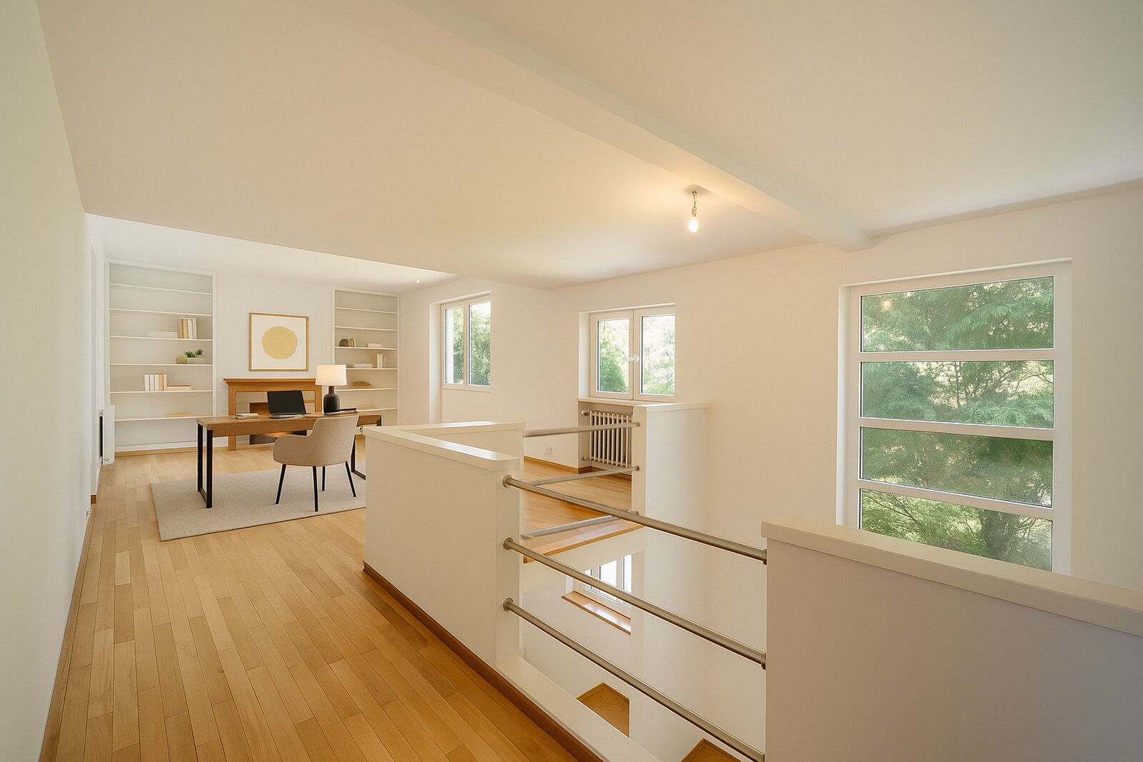 De woning bestaat op het gelijkvloers uit een ruime inkomhal met vestiaire en gastentoilet, een woon- en eetkamer die uitgeeft op het terras en de bosrijke tuin, een ruime aparte en volledig uitgeruste keuken met kookeiland en ontbijthoek. Op de eerste verdieping bevindt zich een mezzanine die gebruikt kan worden als kantoorruimte of speelkamer, twee andere slaapkamers delen een badkamer. Op de tweede verdieping bevindt zich de hoofdslaapkamer met kleedkamer en eigen, complete badkamer. Op de bovenste verdieping bevindt zich de vierde slaapkamer, met een eigen doucheruimte, kleedkamer en terras. In de kelder bevinden zich diverse kelders en een garage.