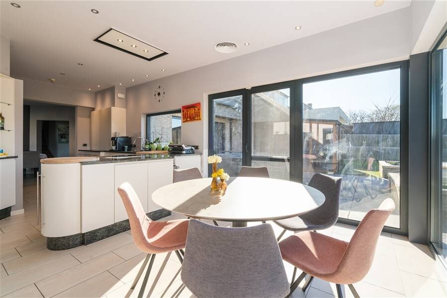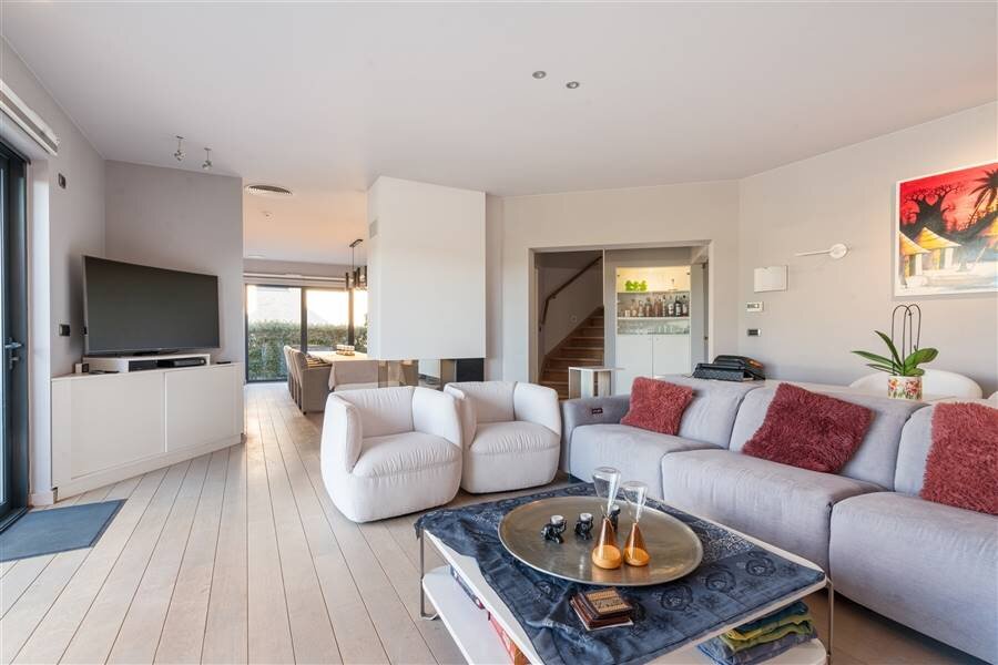 De woning verwelkomt u met een ruime inkomhal en leidt u naar een lichtrijke leefruimte waar grote raampartijen zorgen voor een open en aangenaam gevoel. De gezellige leef- en eetruimte sluit naadloos aan op de keuken, ideaal voor zowel dagelijks comfort als sfeervolle momenten met familie en vrienden. Via de leefruimte bereikt u het zonnige terras en de uitgestrekte tuin; een ware groene oase met uitzonderlijk zicht achteraan.