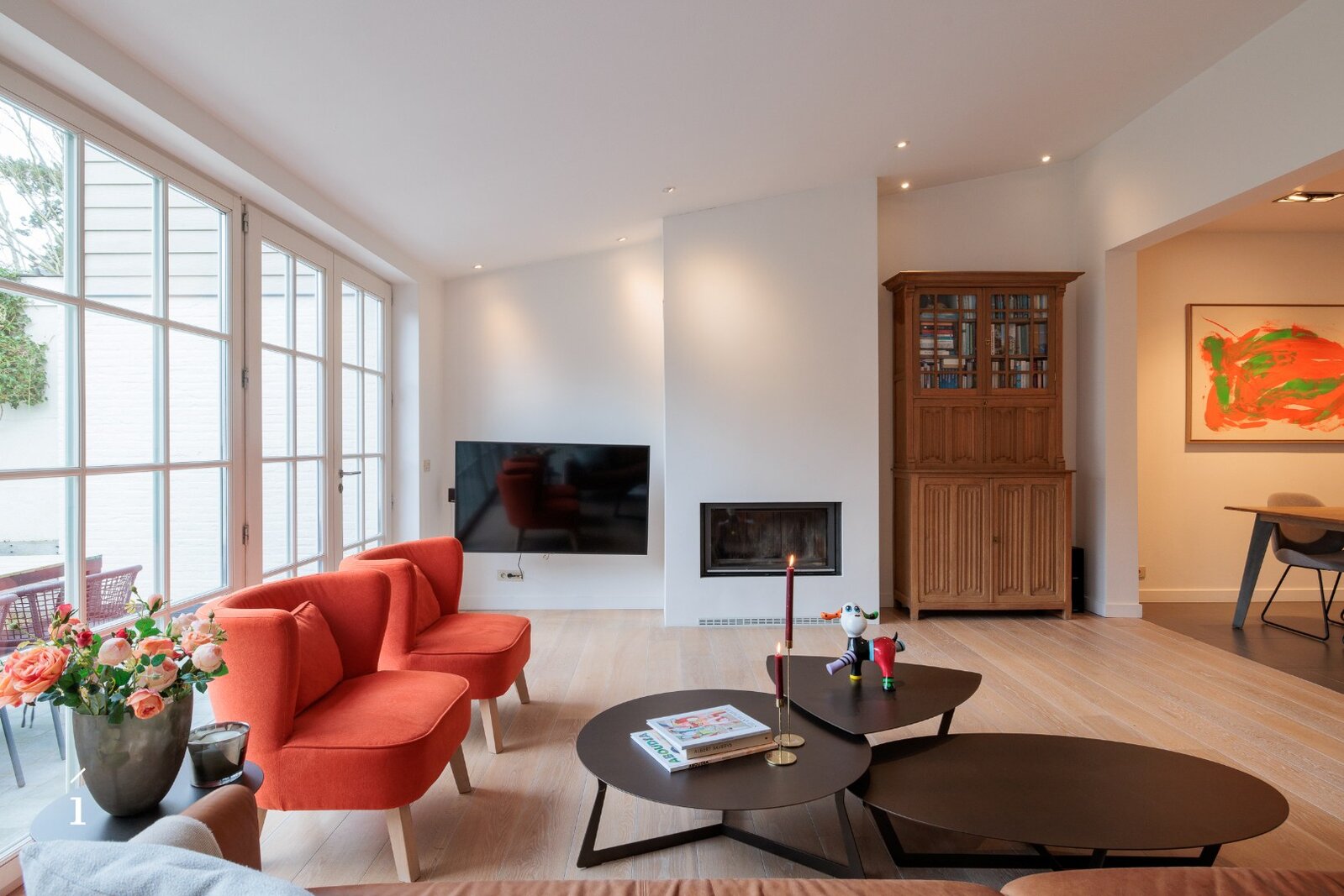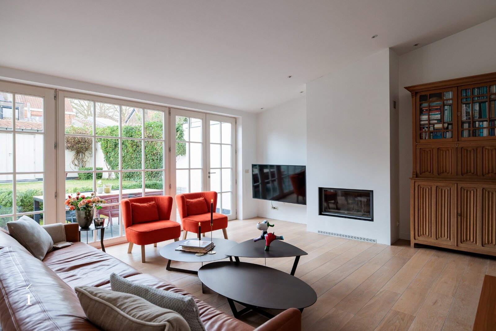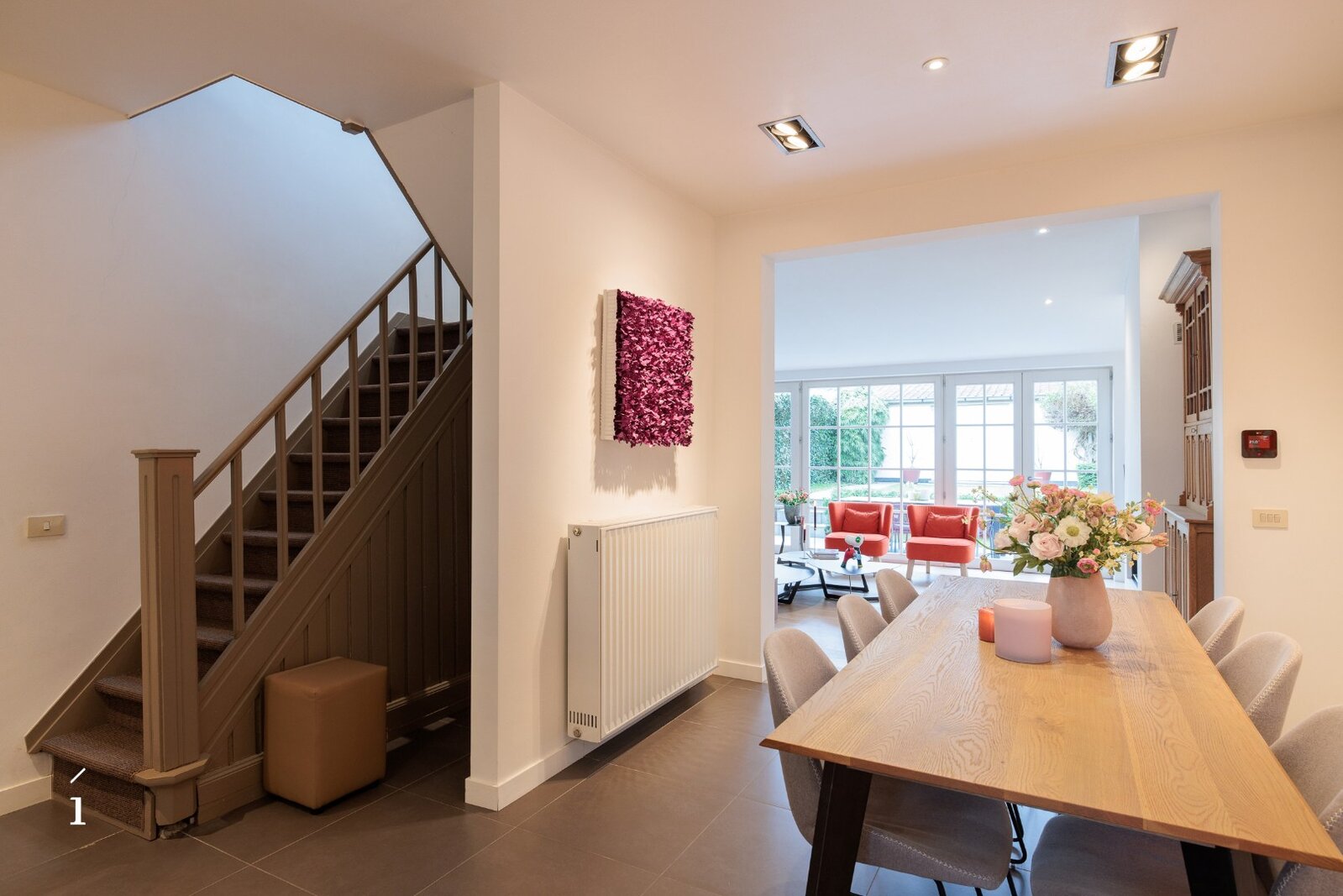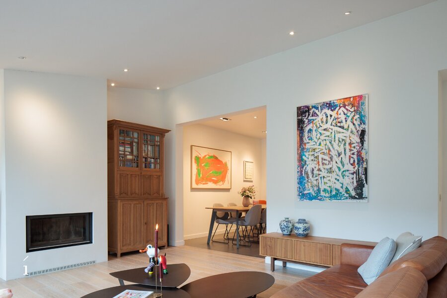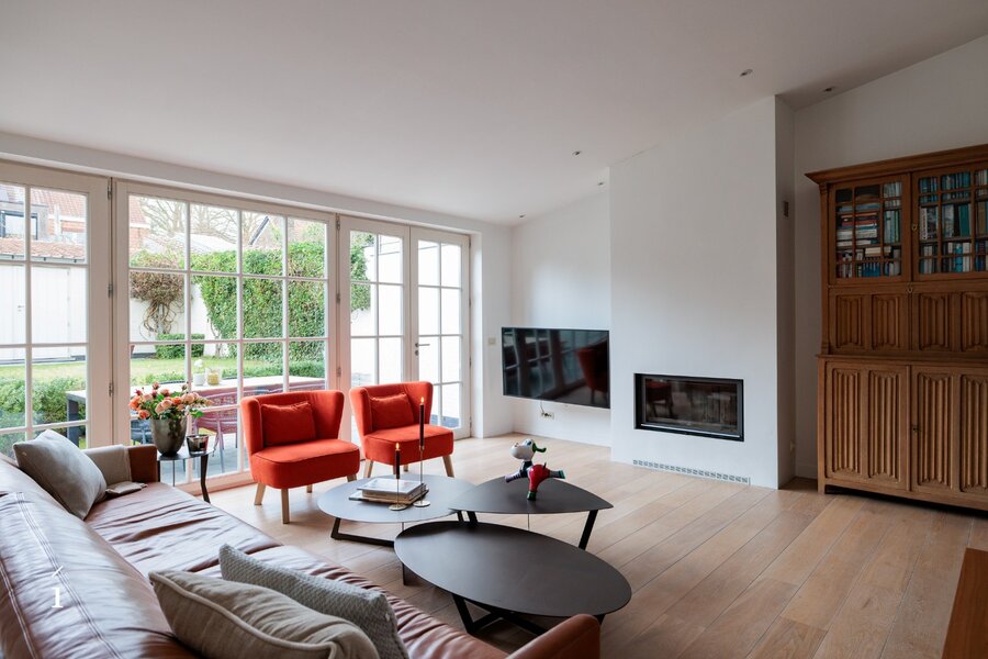 Bij het betreden van de woning komt u binnen in een verzorgde inkomhal met vestiaire en gastentoilet. De keuken sluit mooi aan op de eetkamer en loopt harmonieus over in de leefruimte. Deze leefruimte straalt warmte en gezelligheid uit dankzij de open haard, die een centrale plaats inneemt en zorgt voor een aangename sfeer doorheen de woning. Grote raampartijen bieden een mooi zicht op de privatieve tuin, die smaakvol werd aangelegd en uitnodigt tot rust en ontspanning. Achteraan bevindt zich een praktische berging of tuinhuis, dat ook perfect kan worden ingericht als polyvalente ruimte of poolhouse.