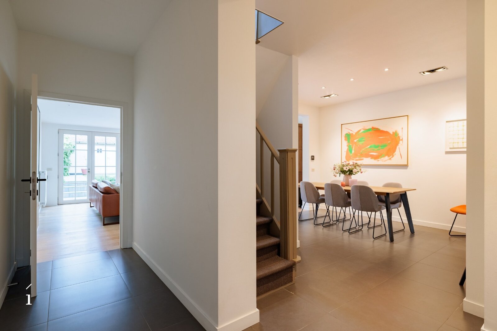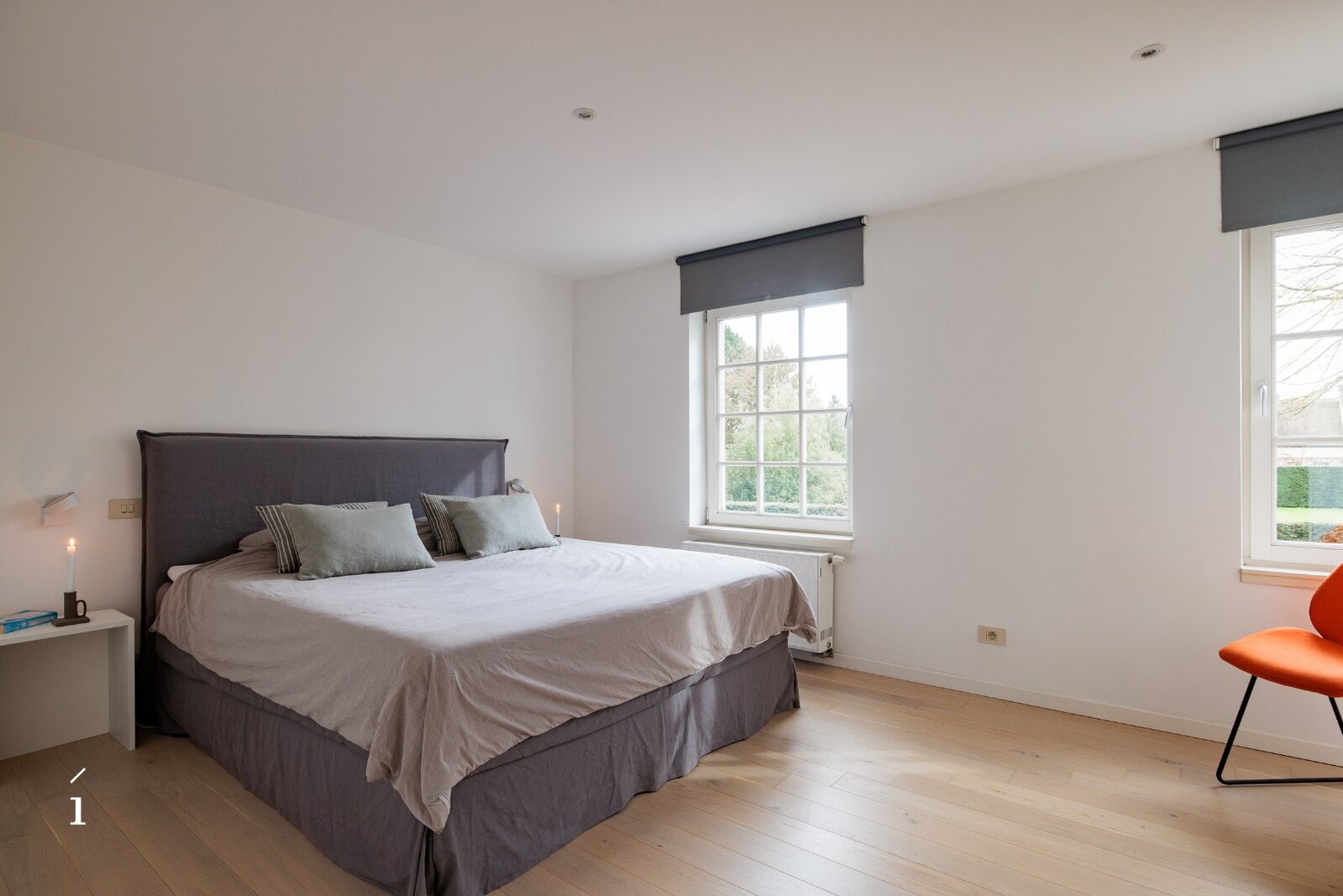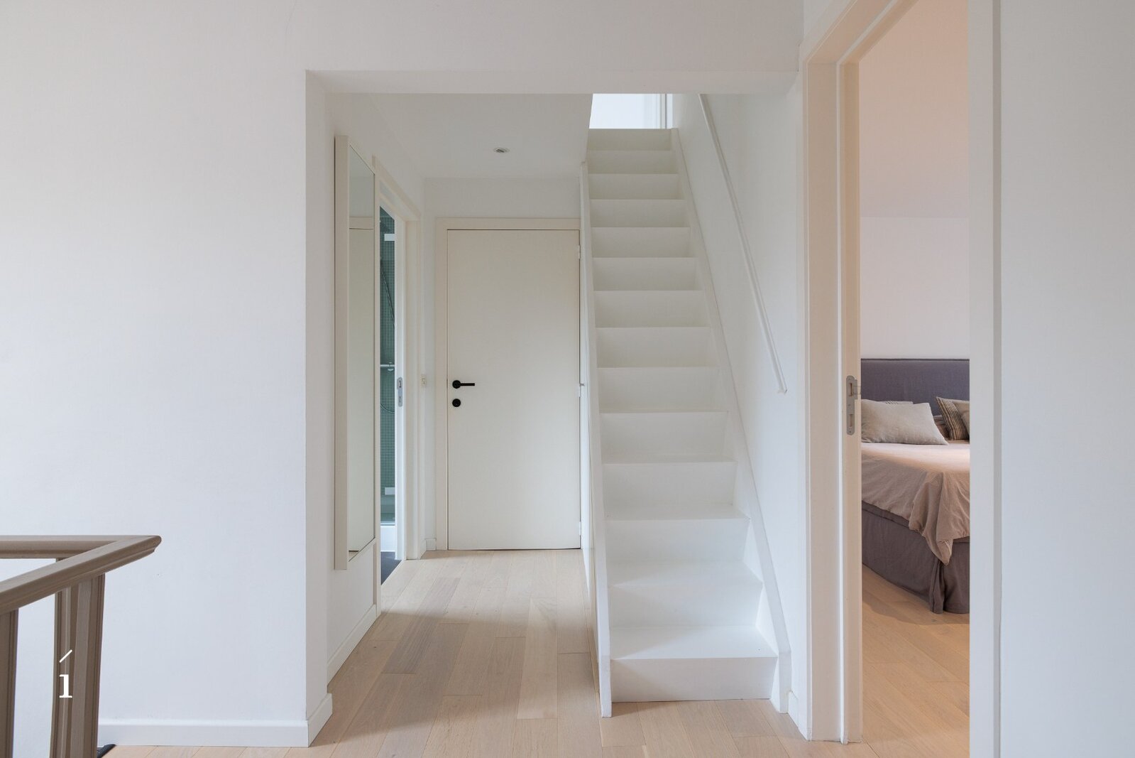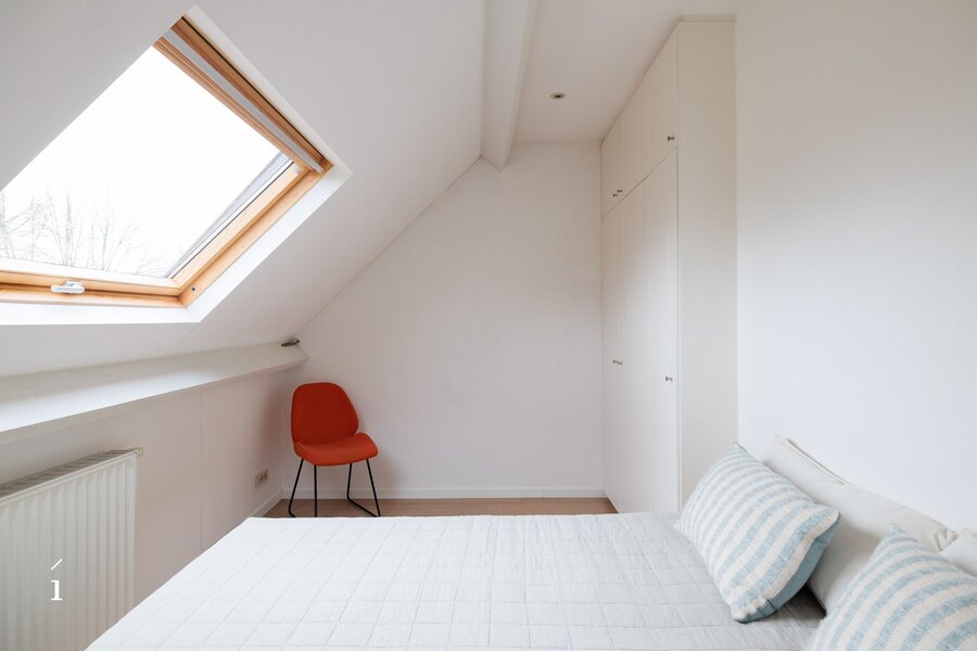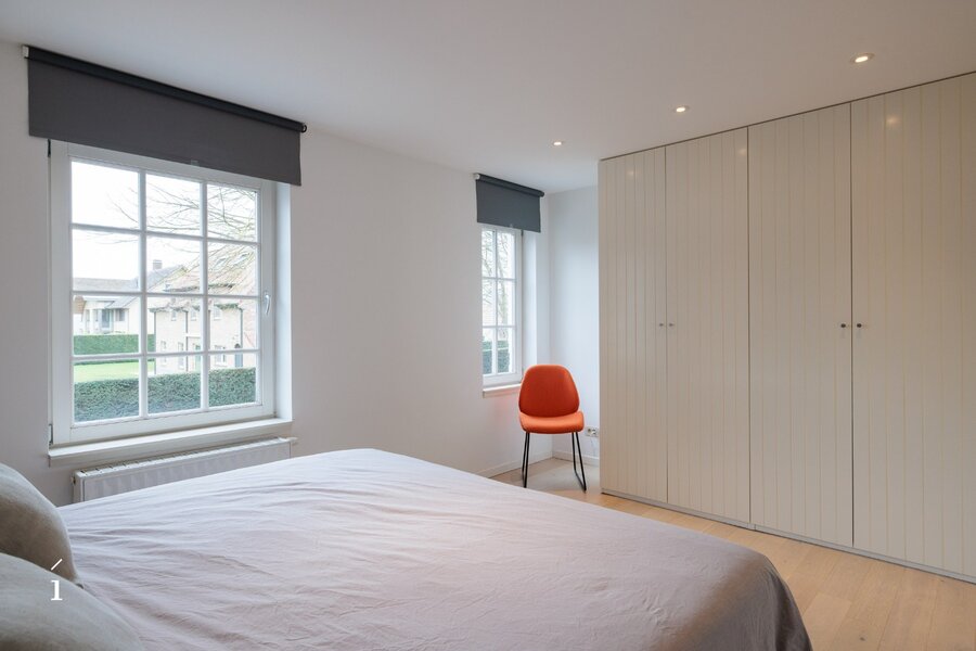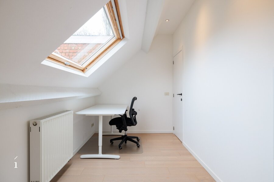 Op de eerste verdieping vindt u een ruime slaapkamer met ingebouwde kasten, met aansluitend een comfortabele badkamer voorzien van ligbad, douche en dubbele lavabo. Het toilet is hier afzonderlijk voorzien. Daarnaast is er op deze verdieping een bureauruimte in mezzanine boven de inkomhal, die een open gevoel combineert met voldoende privacy, ideaal voor thuiswerk of studie.