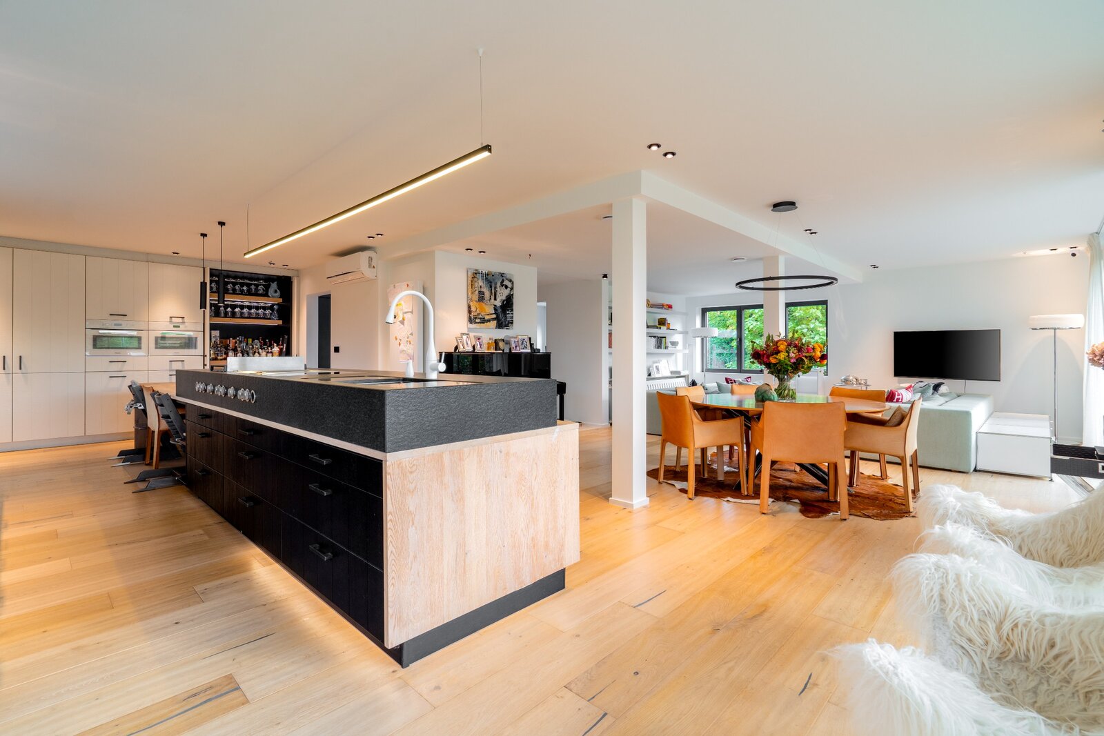 Het is als volgt ingedeeld: inkomhal met vestiaire, dubbele garage, logeerkamer met en-suite badkamer, wasruimte en technische ruimte. De begane grond biedt een ruime woonkamer van ongeveer 80 m², een kantoor en een volledig uitgeruste open keuken. De bovenverdieping biedt een ouderlijke suite met een badkamer in mortex, twee extra slaapkamers, waarvan één in duplex met toegang tot een terras op het zuiden van ongeveer 30 m², evenals een extra badkamer en apart toilet.