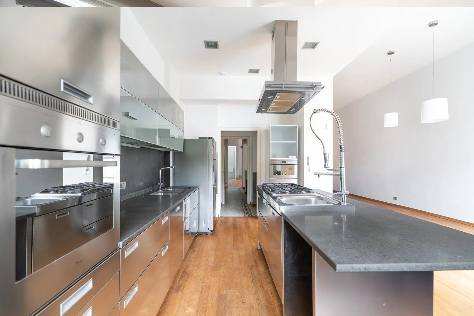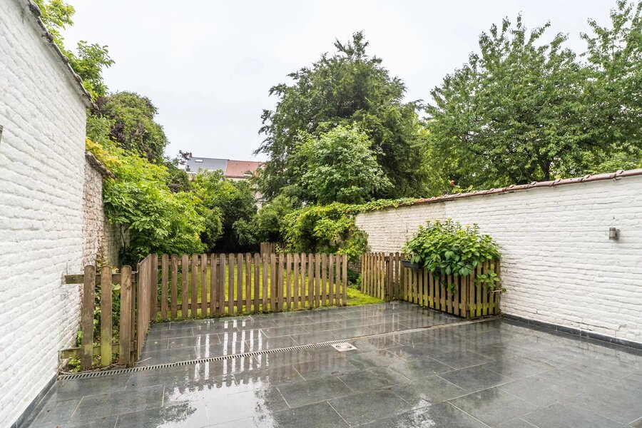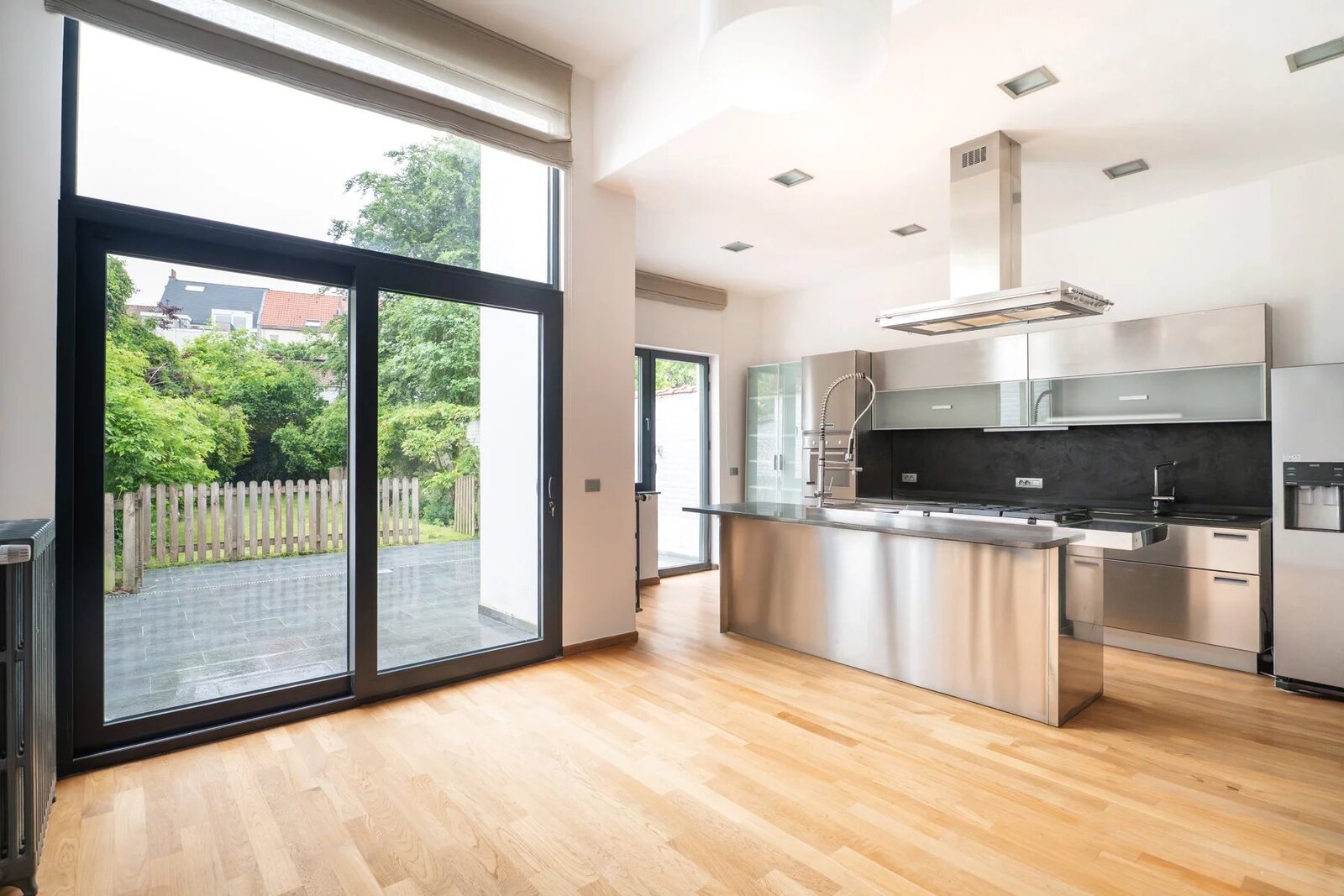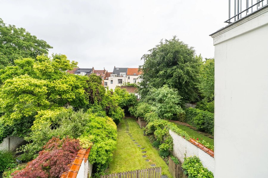 Gelijkvloers: Ruime ontvangstruimtes van ± 60 m², volledig uitgeruste open keuken, alles met toegang tot de prachtige stadstuin. Er is ook een gastentoilet.
