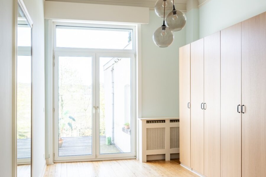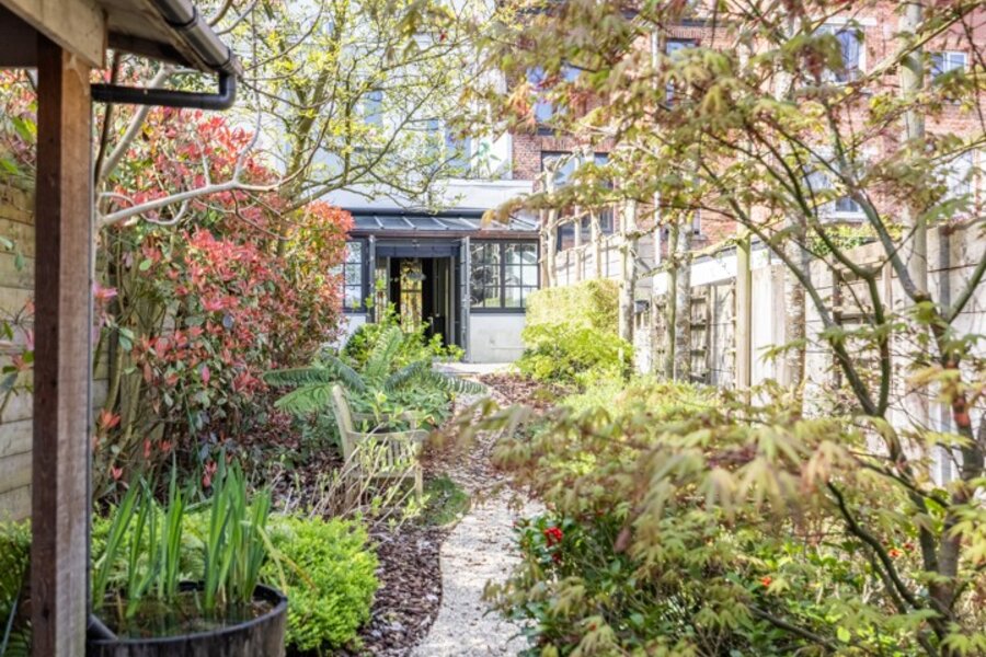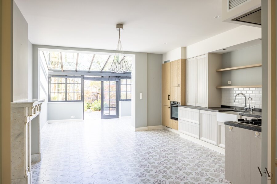 De doorlopende leefruimte verbindt een gezellig salon vooraan met een lichtrijke zithoek achteraan. De ruime keuken is kwalitatief afgewerkt en sluit via de veranda aan op het terras en de zonnige stadstuin met praktische achter uitgang voor fietsen.