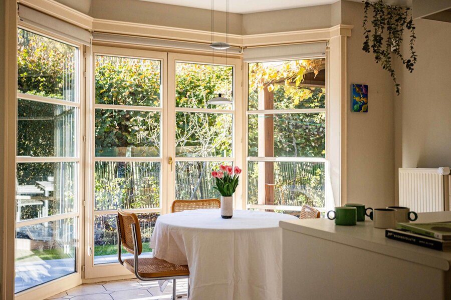 Binnenin verwelkomt de villa je met een ruime inkomhal, gastentoilet en vestiaire. De lichte leefruimte met salon en zithoek geniet van grote ramen met uitzicht op de tuin.