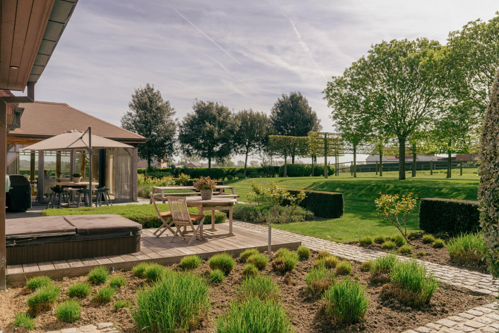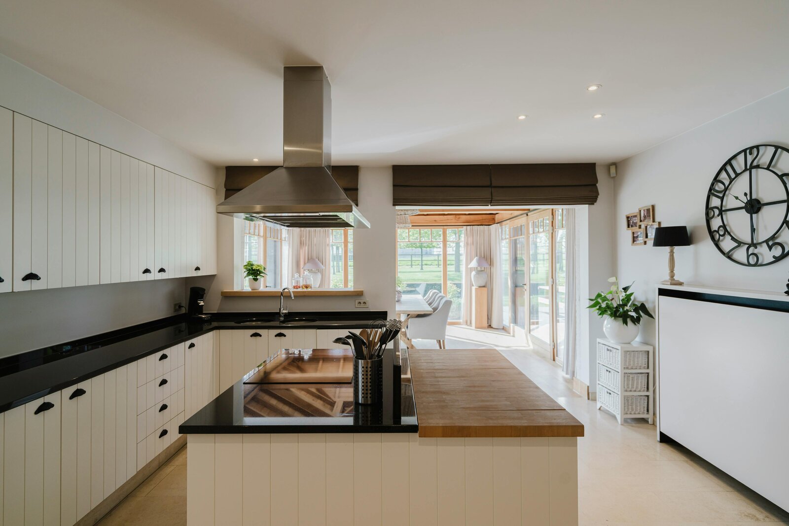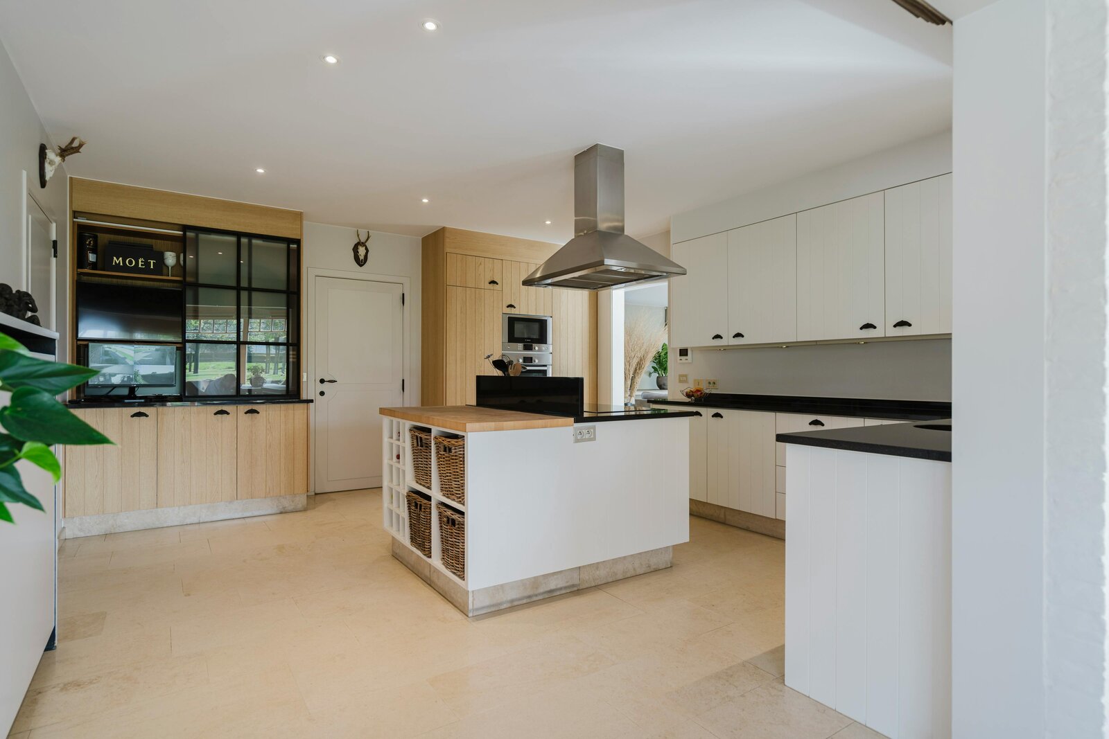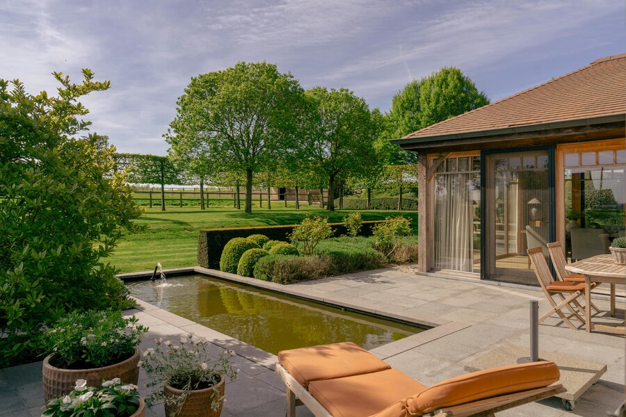De inkomhal leidt naar de lichtrijke woonkamer met maatwerkkasten en een ingewerkte houthaard, die via grote schuiframen aansluit op het zonneterras en de tuin. De landelijke leefkeuken met eiland en kwalitatieve toestellen loopt over in een prachtige veranda met eiken gebinte en zicht op vijver en weides. Op het gelijkvloers bevindt zich tevens een aparte bureau- en wasruimte.