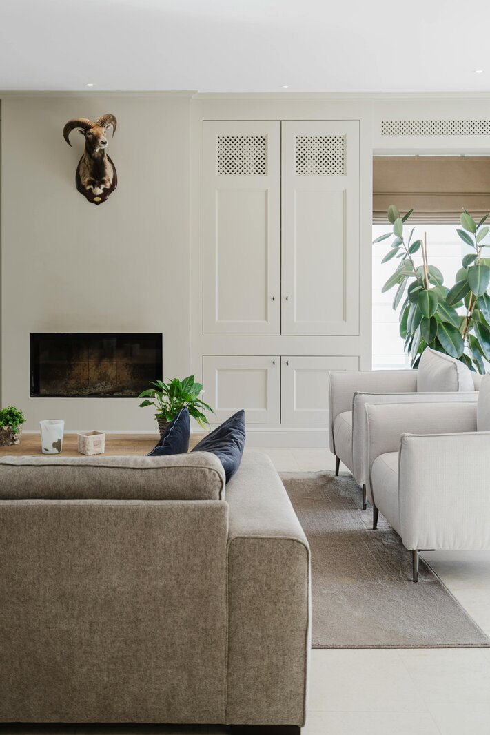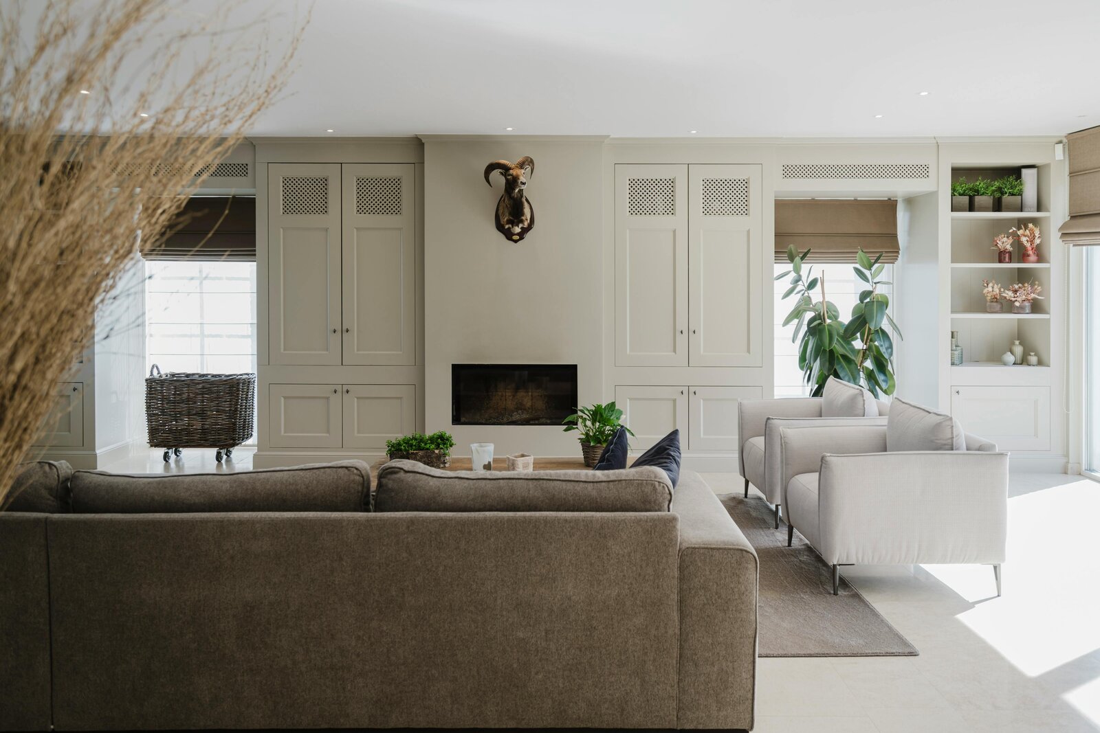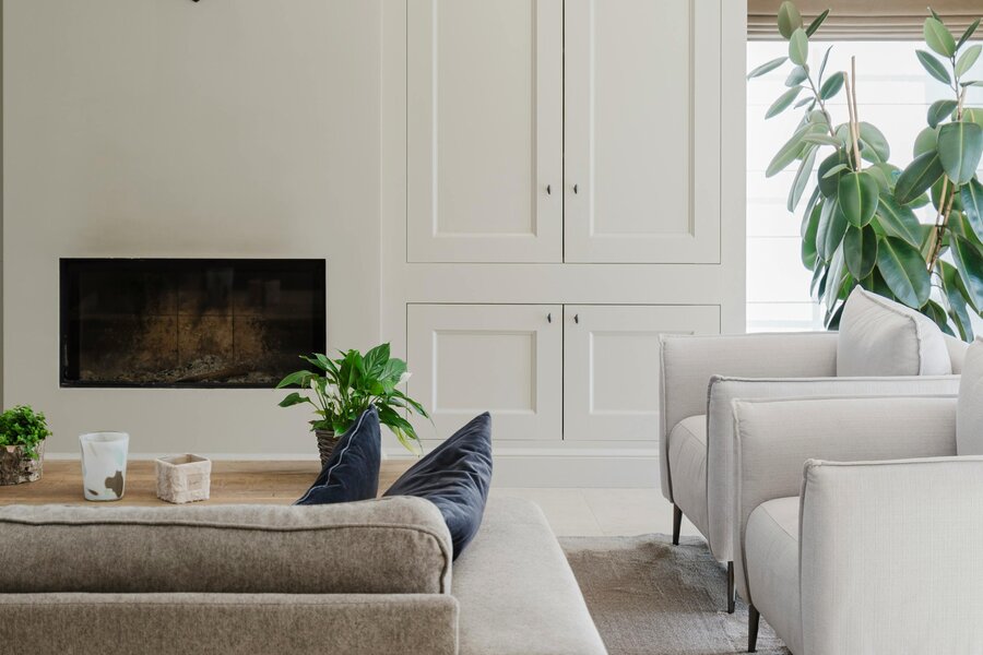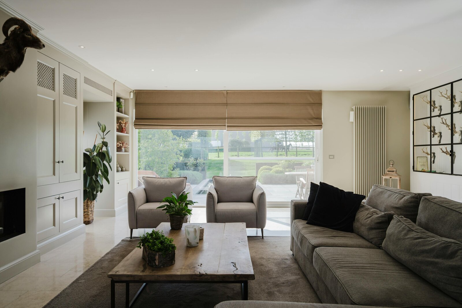 De inkomhal leidt naar de lichtrijke woonkamer met maatwerkkasten en een ingewerkte houthaard, die via grote schuiframen aansluit op het zonneterras en de tuin. De landelijke leefkeuken met eiland en kwalitatieve toestellen loopt over in een prachtige veranda met eiken gebinte en zicht op vijver en weides. Op het gelijkvloers bevindt zich tevens een aparte bureau- en wasruimte.
