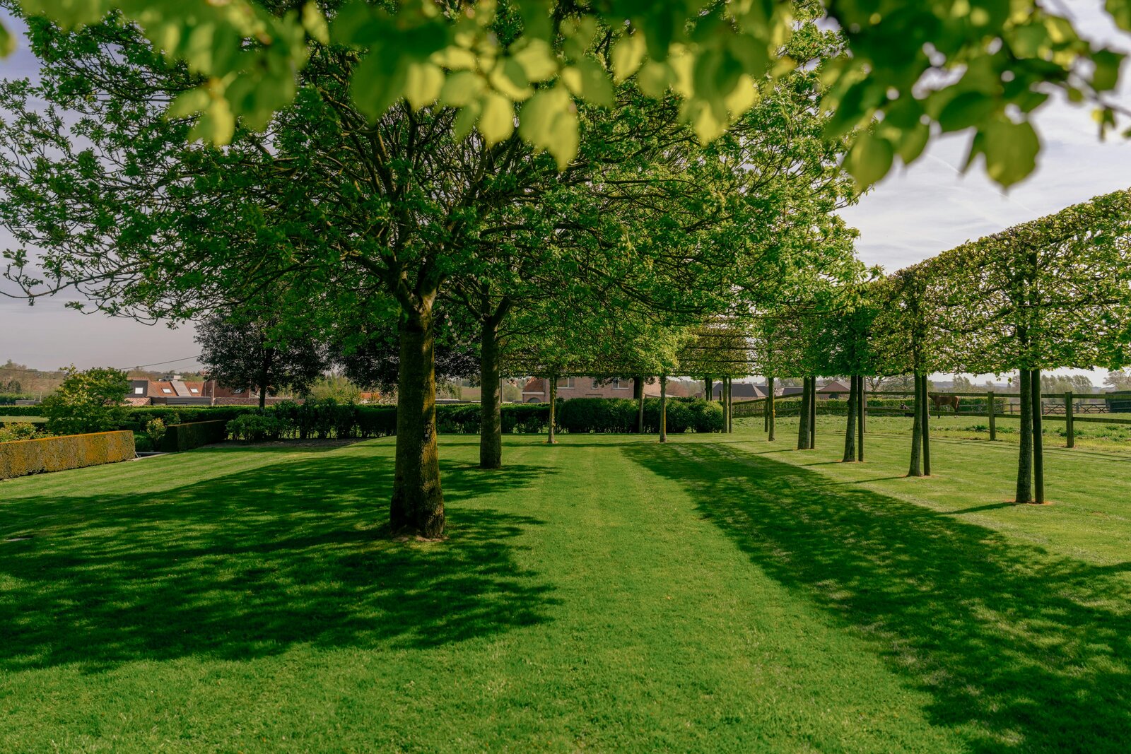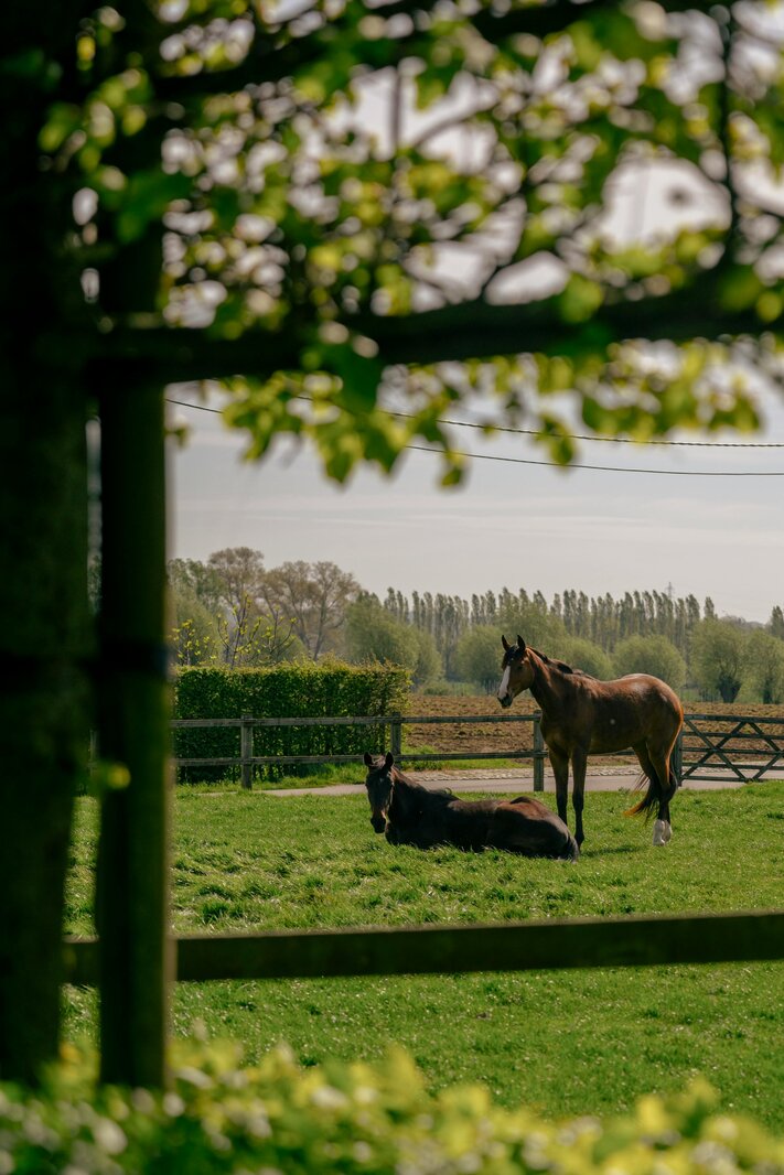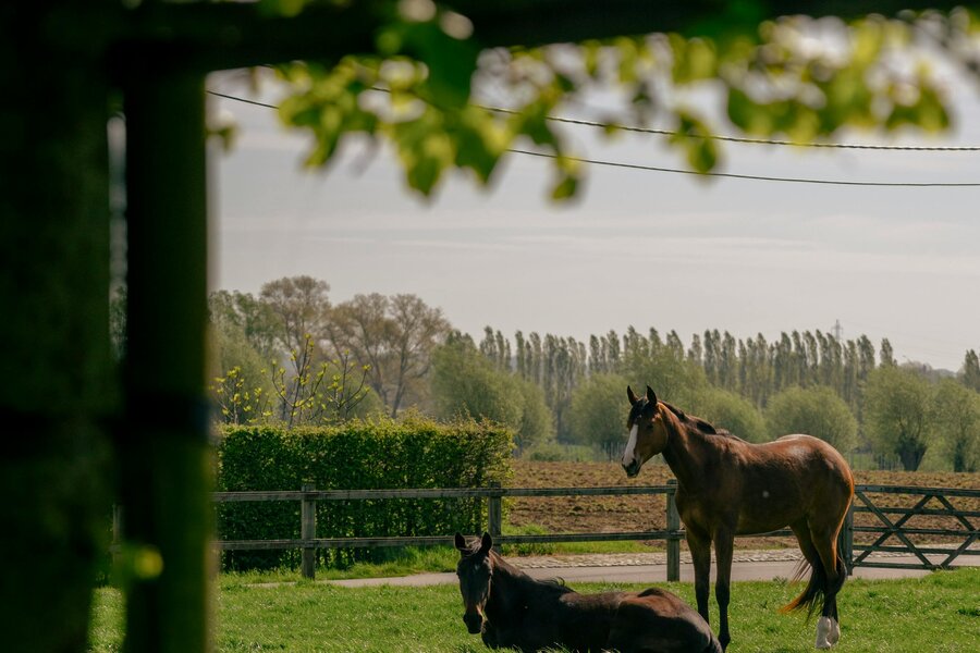 Boven zijn er vier volwaardige slaapkamers, waaronder een master met dressing, en een ruime badkamer met inloopdouche en dubbele lavabo. De tuin met terras, vijver en bomen biedt maximale privacy, aangevuld met een weide en twee paardenboxen.