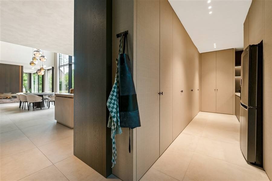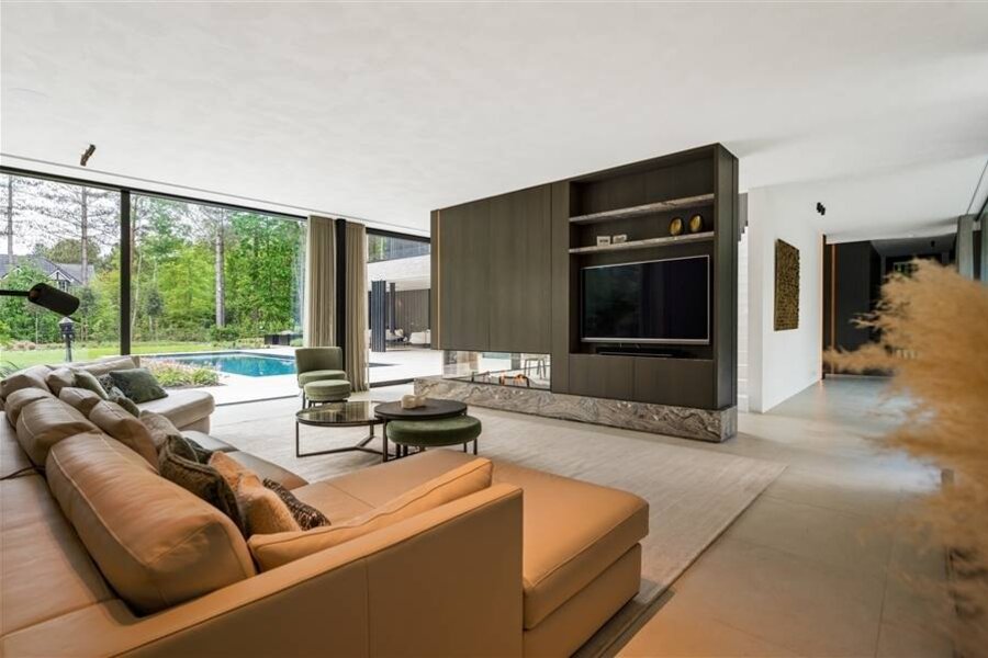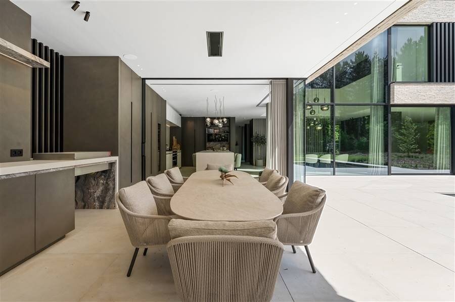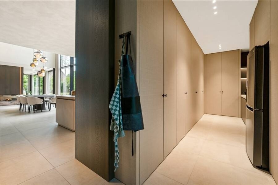 Bij binnenkomst in de centrale inkom betreedt u ineens het leefgedeelte met prachtige raampartijen naar tuin en terras. De grote leefruimte biedt veel mogelijkheden en omvat een zitkamer, eetkamer en een prachtige leefkeuken.Vanuit de keuken heeft u directe toegang tot de bijkeuken. Deze tweede keuken werd ingericht met een volledige kastenwand en diverse inbouwtoestellen. Zij inkom met eveneens een maatwerk kastenwand en toegang tot de kelder. Vanuit de leefkeuken geniet u van een prachtig zicht over de tuin en terrassen, waaronder het zeer ruime overdekte terras. Het bijzonder grote overdekte terras is een uitbreiding van de leefruimte met een volledig uitgeruste buitenkeuken en een design haardvuur.