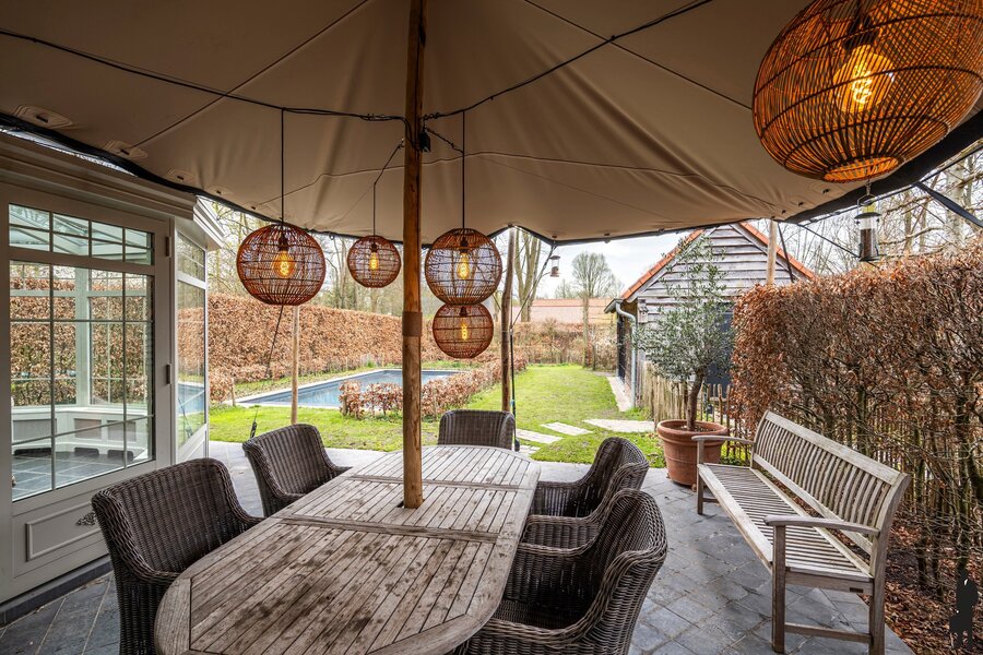 - een ruim terras met stijlvolle overkapping (stretchtent) en buitenverlichting: ideaal om lang te genieten van het buitenleven