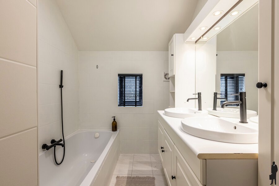 - een badkamer met ligbad, dubbele lavabo en handdoekradiator