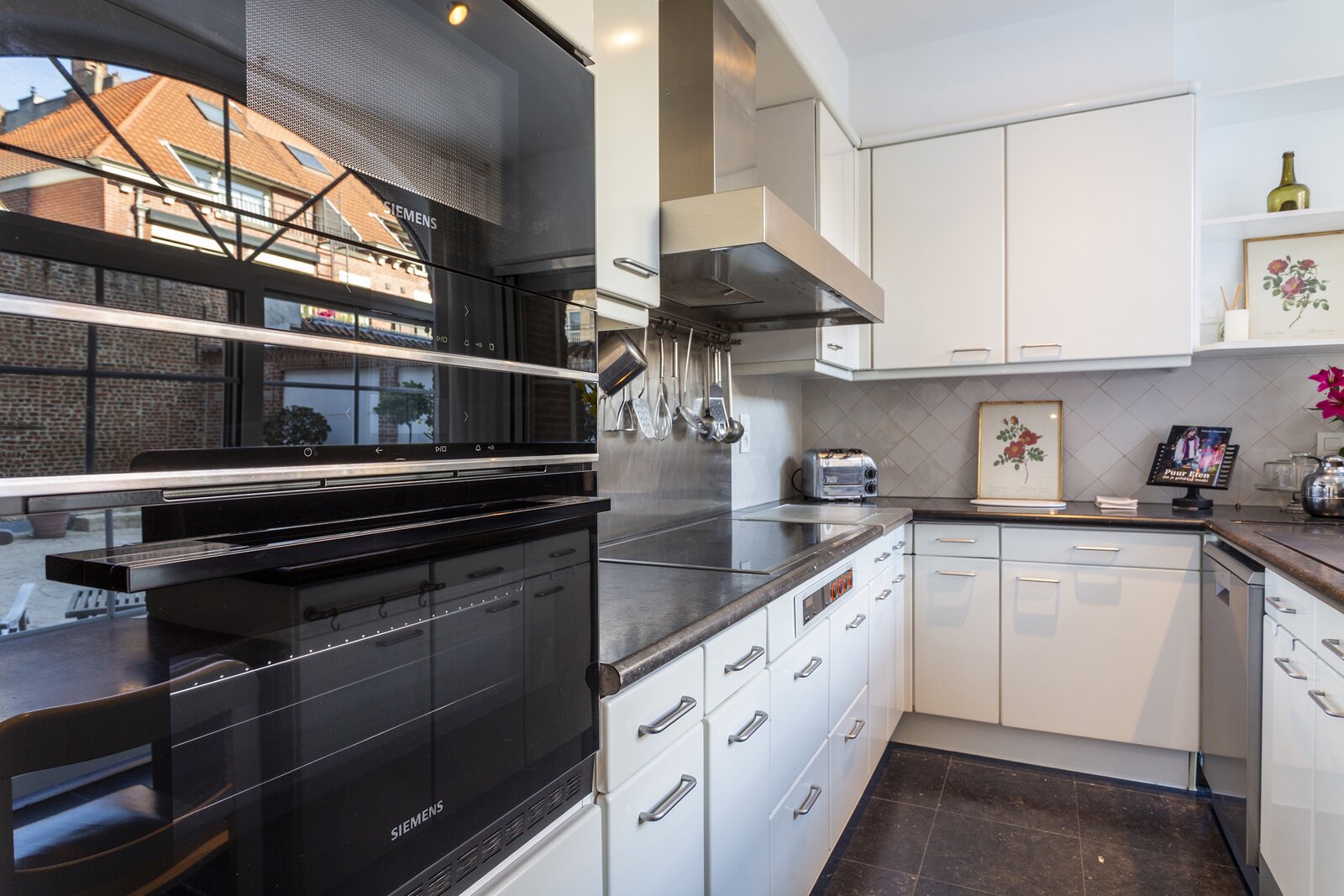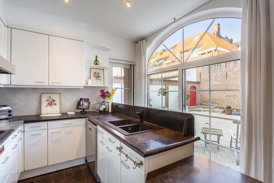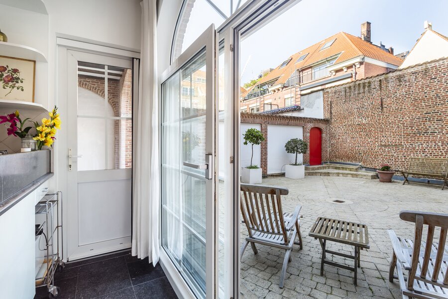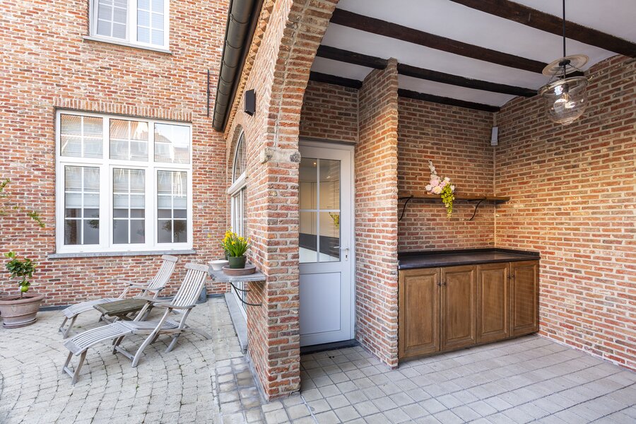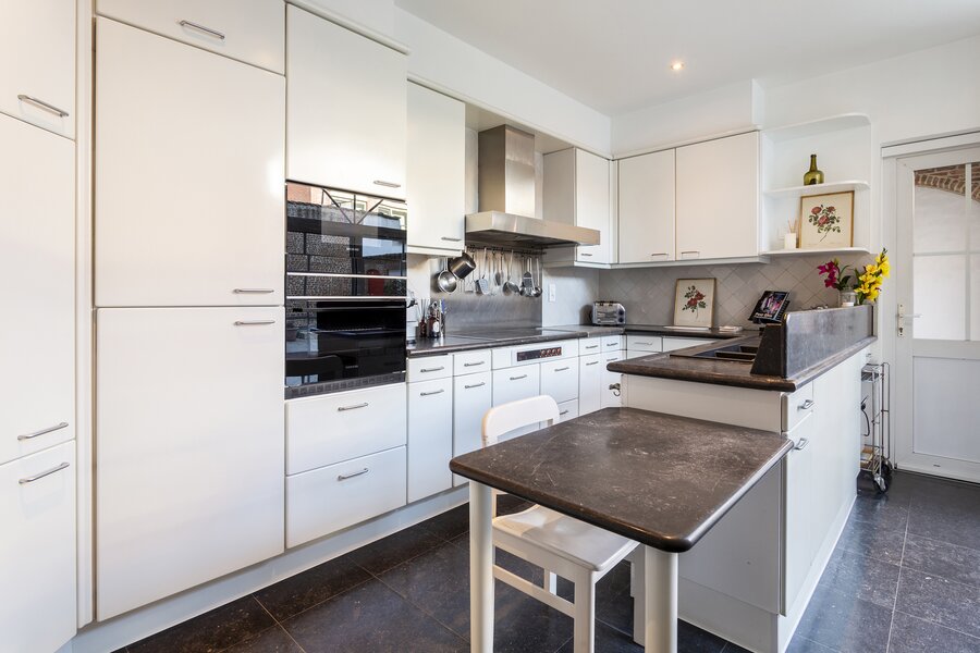 De afzonderlijke keuken is volledig uitgerust met alle hedendaagse toestellen, waaronder een oven, microgolfoven, inductiekookplaat en vaatwasser. Zowel de leefruimte als de keuken geven uit op het uitzonderlijk ruime terras, dat deels overdekt is en perfect is om het hele jaar door van te genieten.