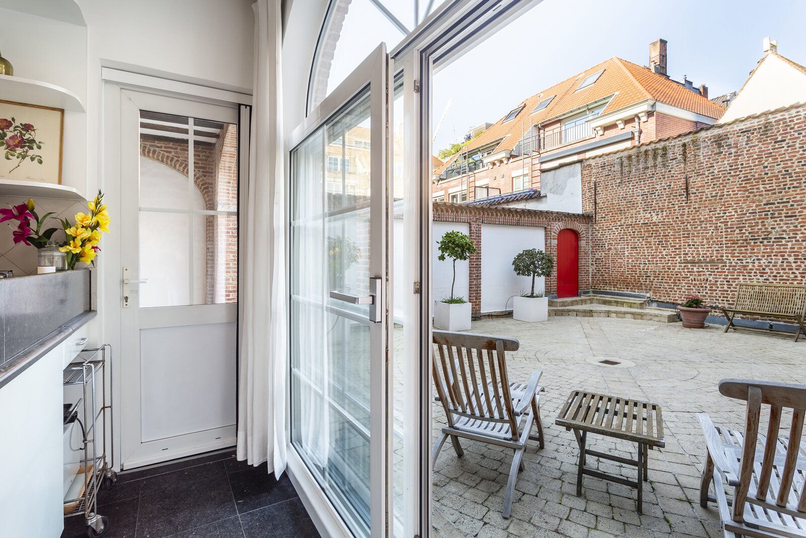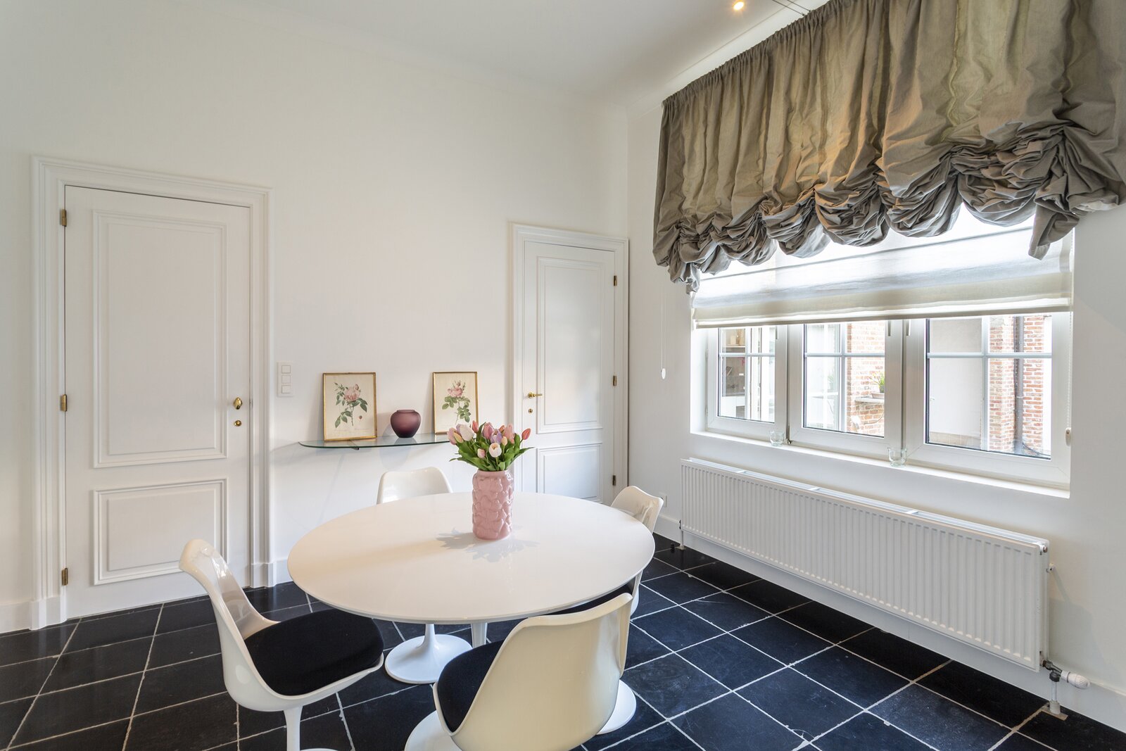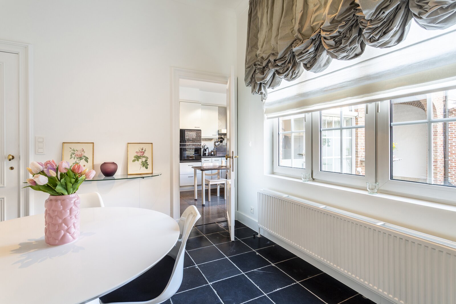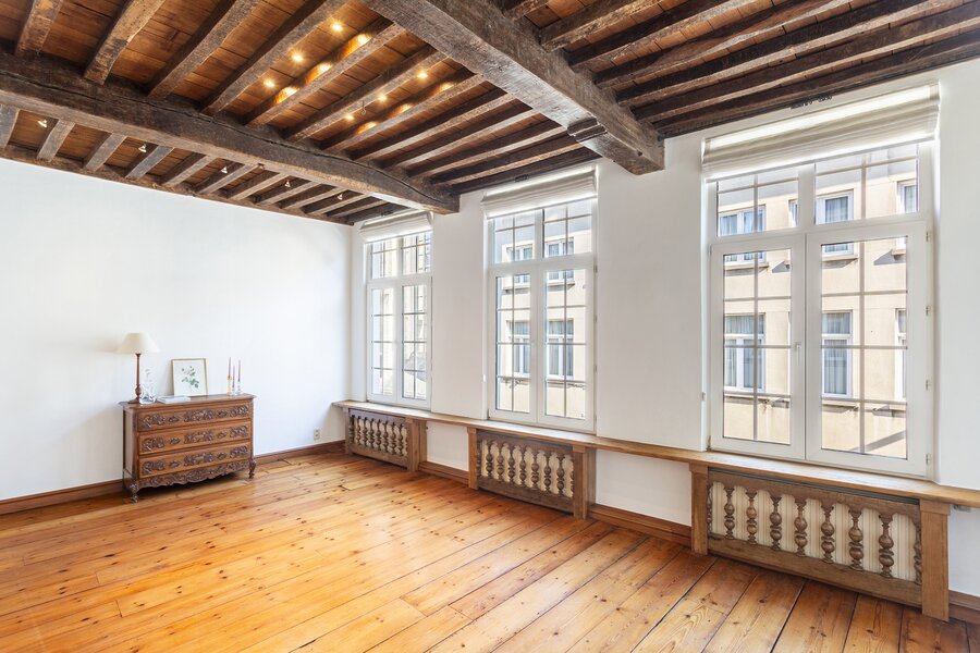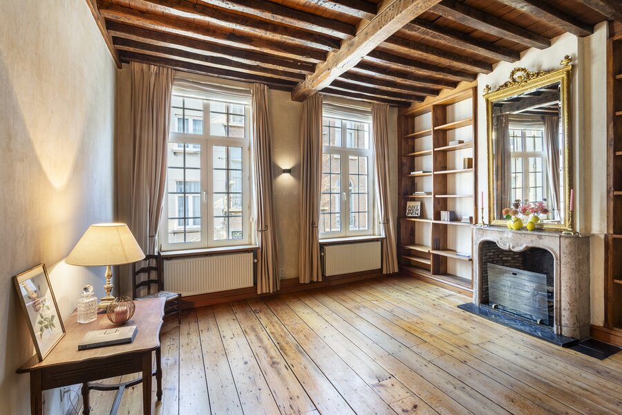 De lift in de gemeenschappelijke inkomhal op het gelijkvloers brengt u rechtstreeks tot in het appartement, wat zorgt voor optimaal comfort. Bij het betreden van het appartement komt u in een prachtige inkomhal die toegang geeft tot de indrukwekkende, tweedelige leefruimte. Deze bestaat uit een stijlvol salon en een eetkamer, beide gekenmerkt door authentieke houten vloeren en zichtbare balken die het karakter van de woning extra benadrukken. De functionerende open haard zorgt hier voor een warme en gezellige sfeer. Daarnaast bevindt zich een aparte eetruimte, ideaal als gezellige ontbijtkamer.