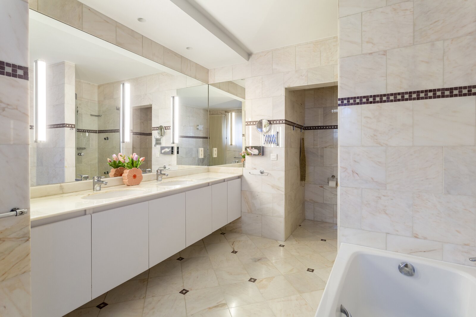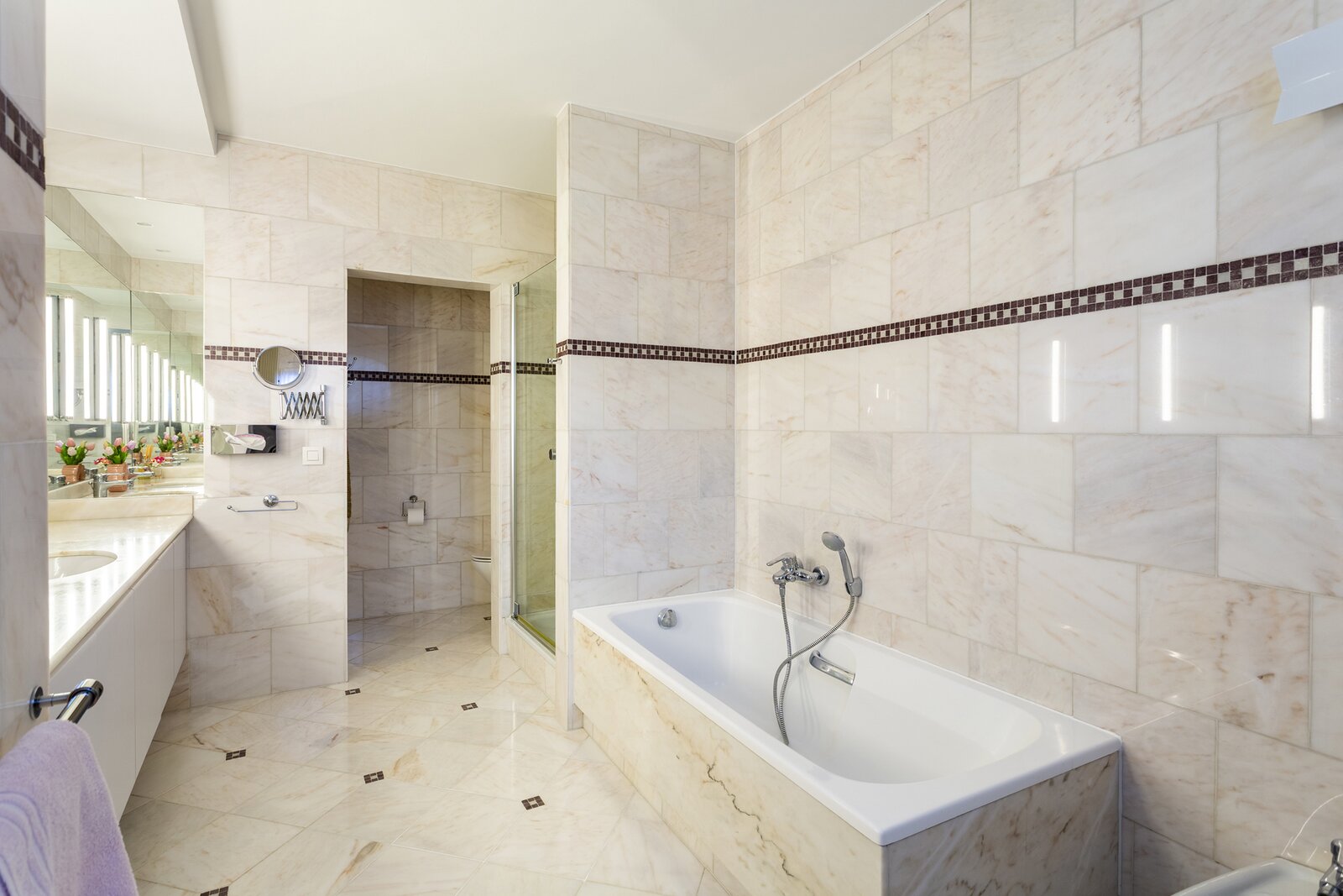 Via de trap of lift bereikt u de tweede verdieping, waar zich het nachtgedeelte bevindt. De master suite omvat een ruime slaapkamer, een dressing en een luxueuze badkamer uitgerust met douche, bad, dubbele lavabo, toilet en bidet. Daarnaast zijn er nog twee volwaardige slaapkamers, een tweede badkamer met douche en lavabo, een extra dressing, een apart toilet en een praktische berging.