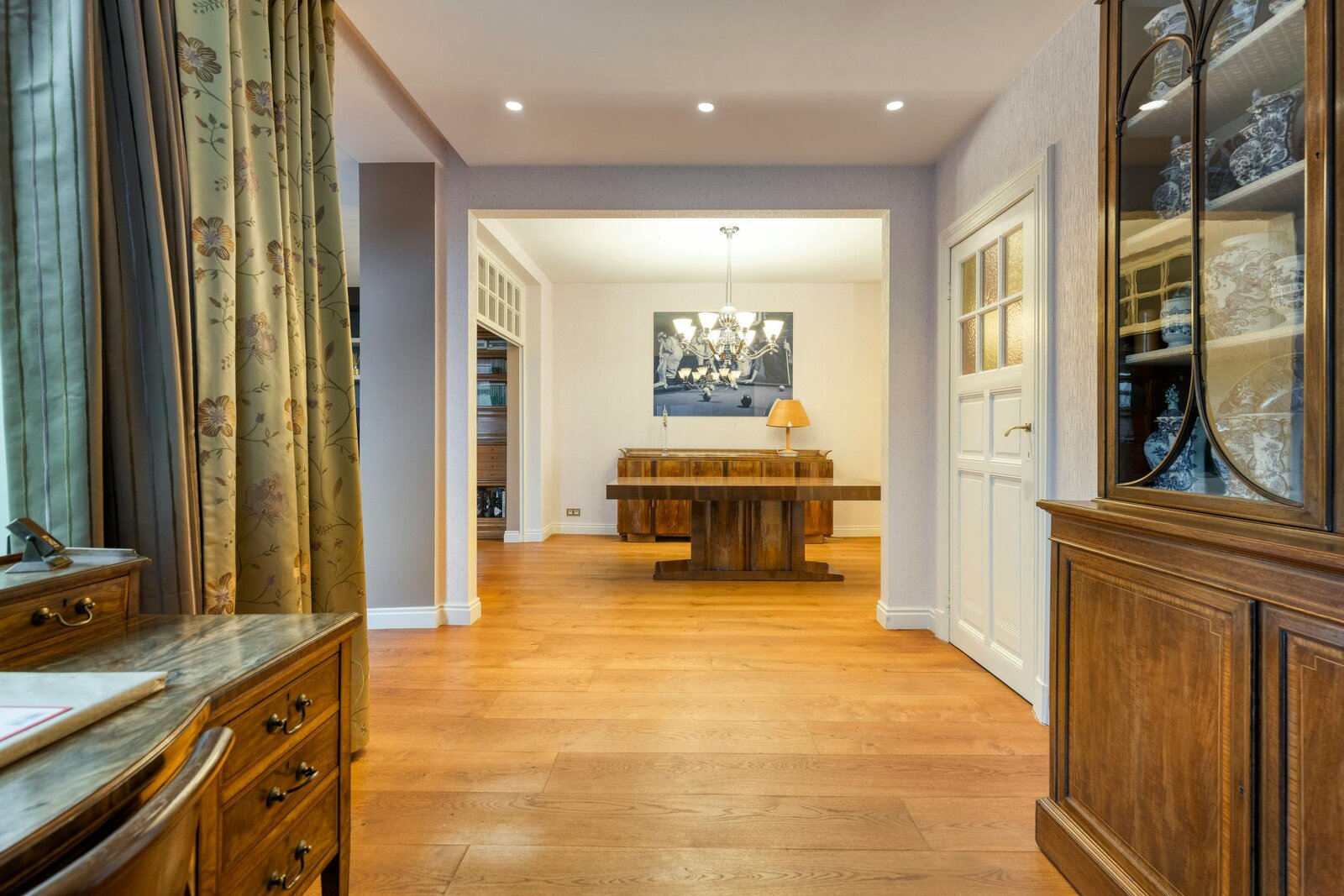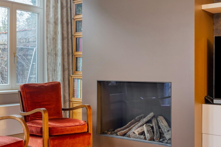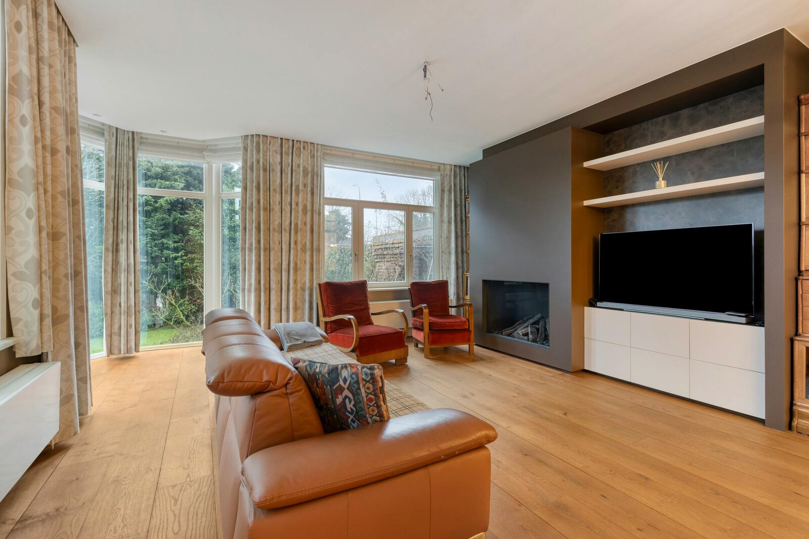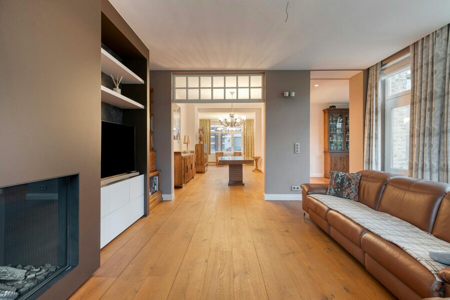 - ruime, lichtrijke woonkamer (65m²) met gashaard en zicht op de gunstig georiënteerde tuin (533m²);