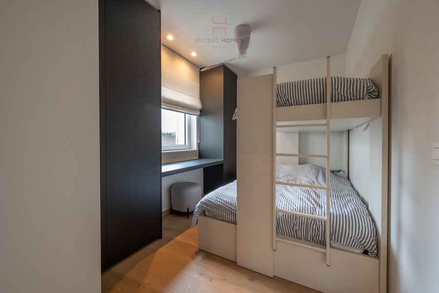 Het appartement beschikt over twee volwaardige slaapkamers, elk met ingemaakte kasten en een eigen douchekamer — ideaal voor gezinnen of gasten. Eén kamer heeft bovendien een handige bureelhoek.
