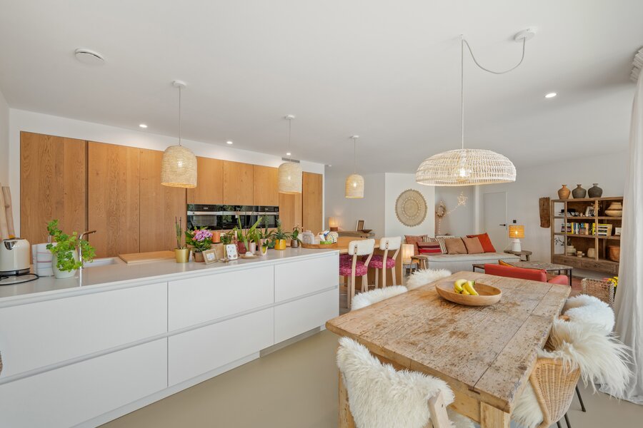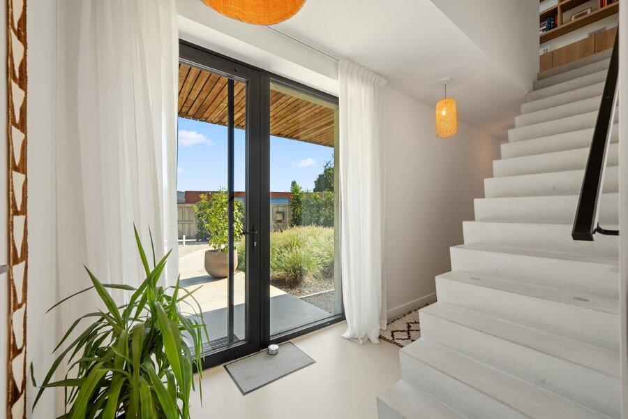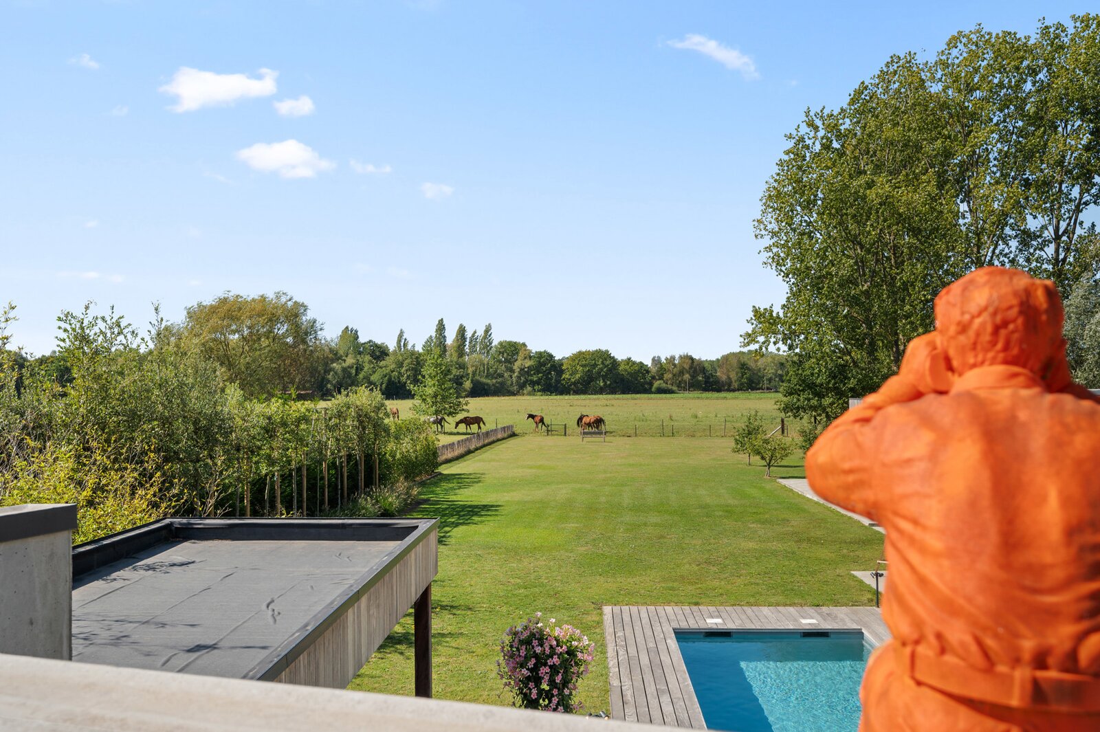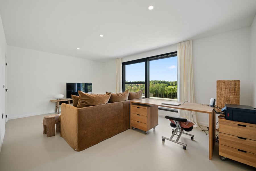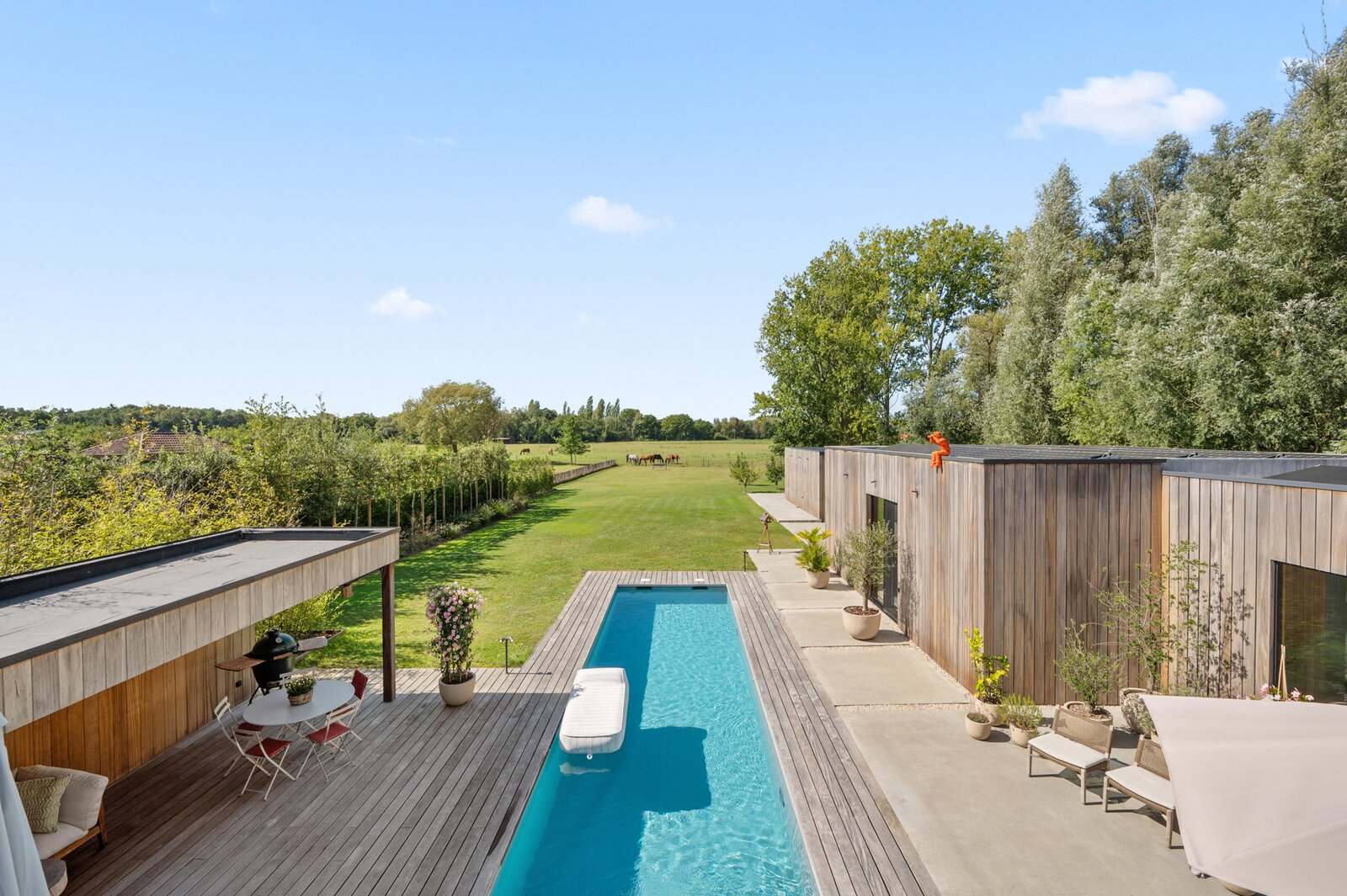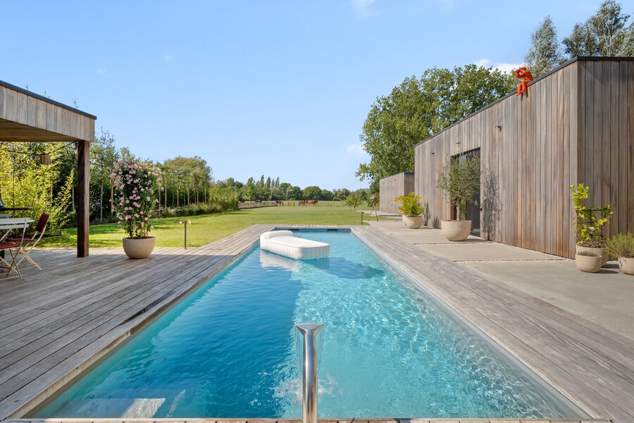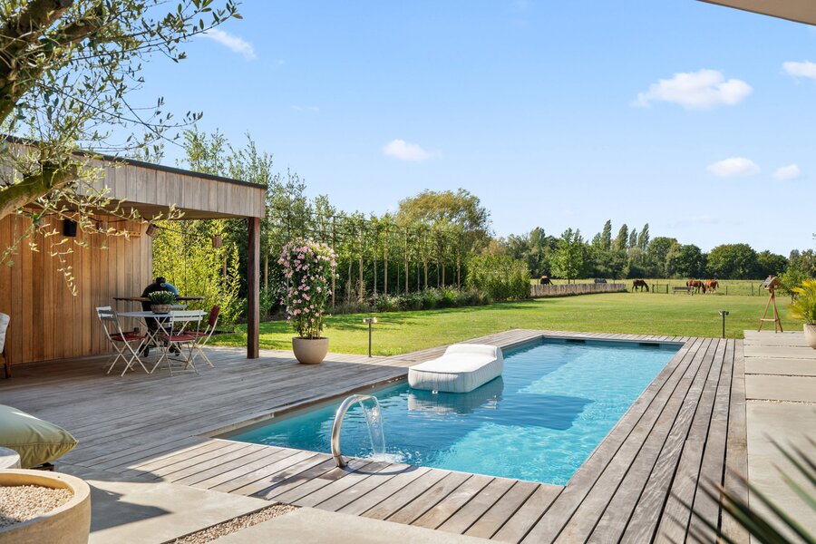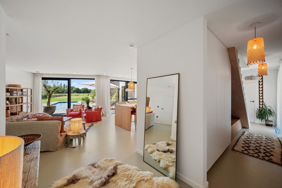 Deze moderne villa - BEN woning - bevindt zich op een perceel van 27a61ca in een rustige buurt en biedt een prachtig uitzicht op de achterliggende weilanden. Bij het betreden van de woning komt u in de inkomhal met ingebouwde kasten en een gastentoilet. Van hieruit bereikt u de lichtrijke leefruimte van 70 m², waar meteen een vakantiegevoel naar boven komt. De open keuken, volledig uitgerust met Miele-toestellen, kijkt uit op het zwembad en de diepe tuin. Vanuit de inkomhal is er toegang tot de technische ruimte, wasplaats, diepvries en bergruimte.