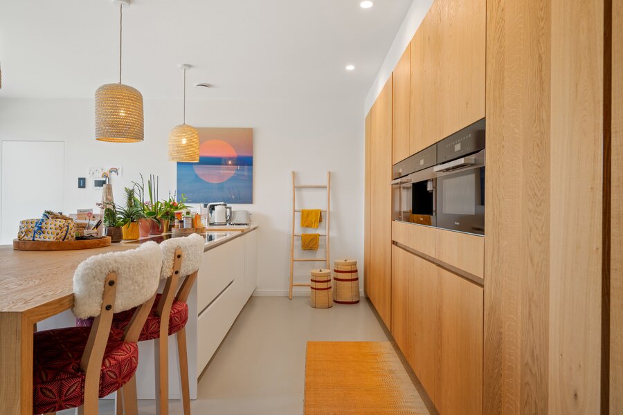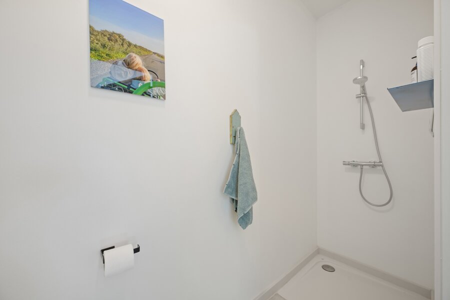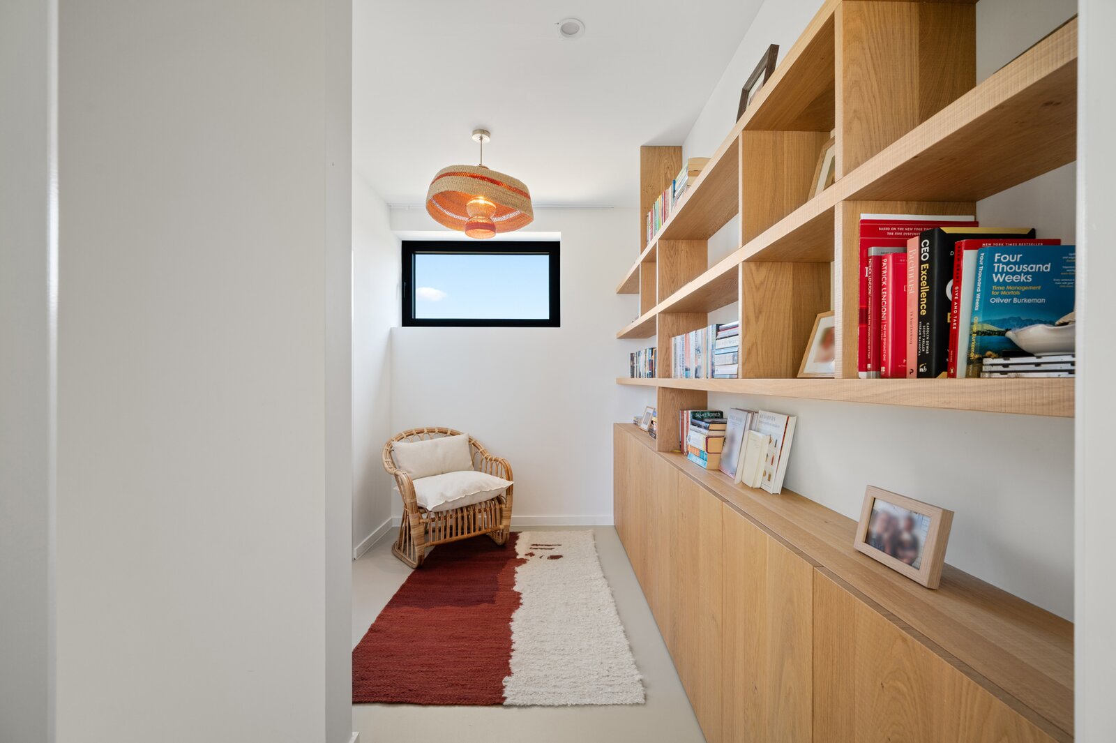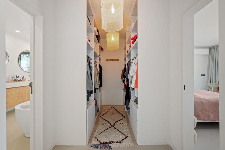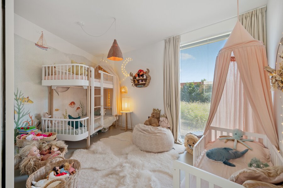 Op het gelijkvloers bevinden zich twee slaapkamers. Eén kamer, nu kinderkamer, kan ook perfect dienen als bureau, terwijl de andere kamer is uitgerust met ingebouwde dressing en eigen badkamer met ligbad, douche en dubbele lavabo. De woning beschikt over vloerverwarming en aan de achterzijde zijn overal automatische zonneschermen voorzien.