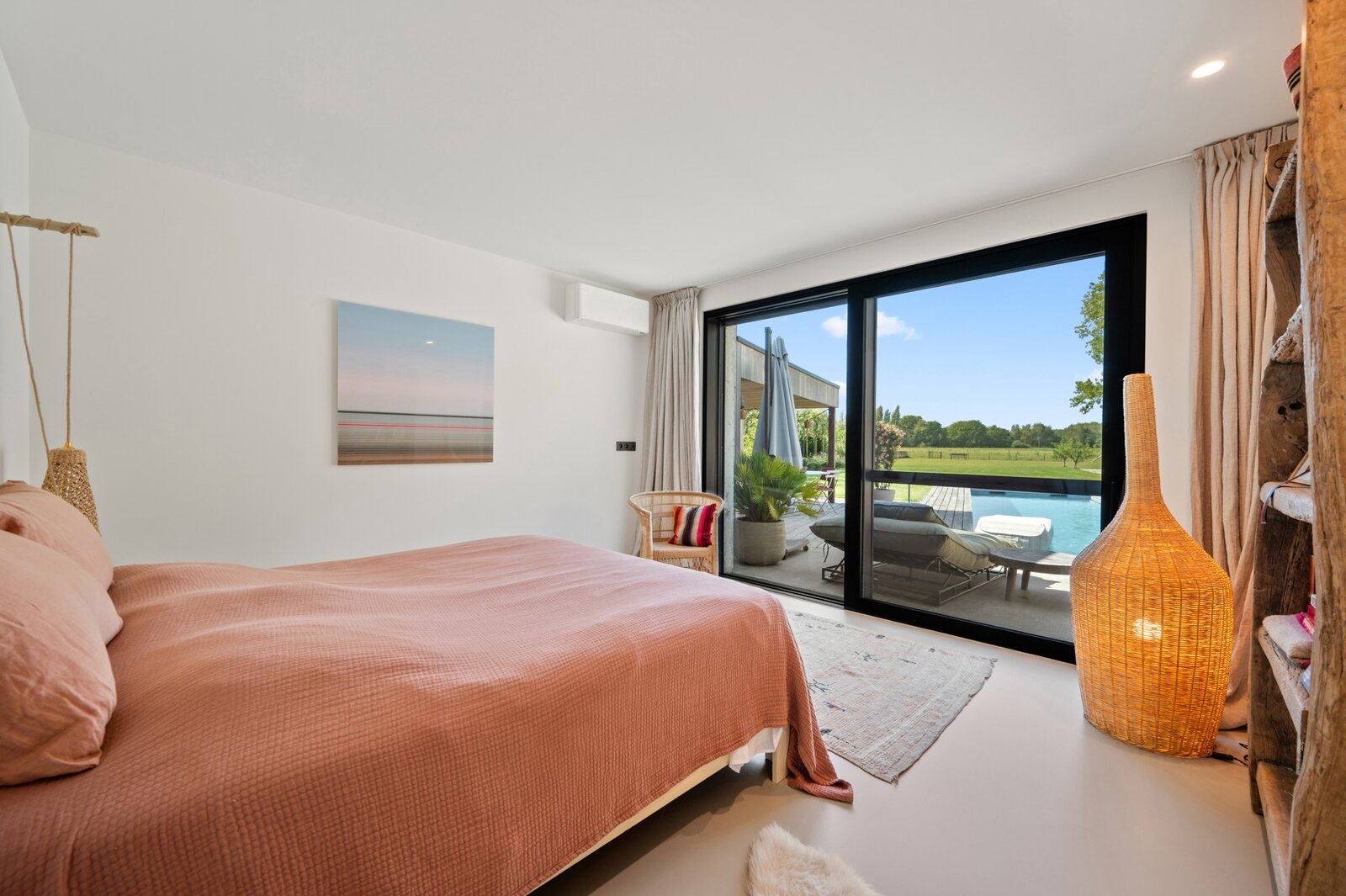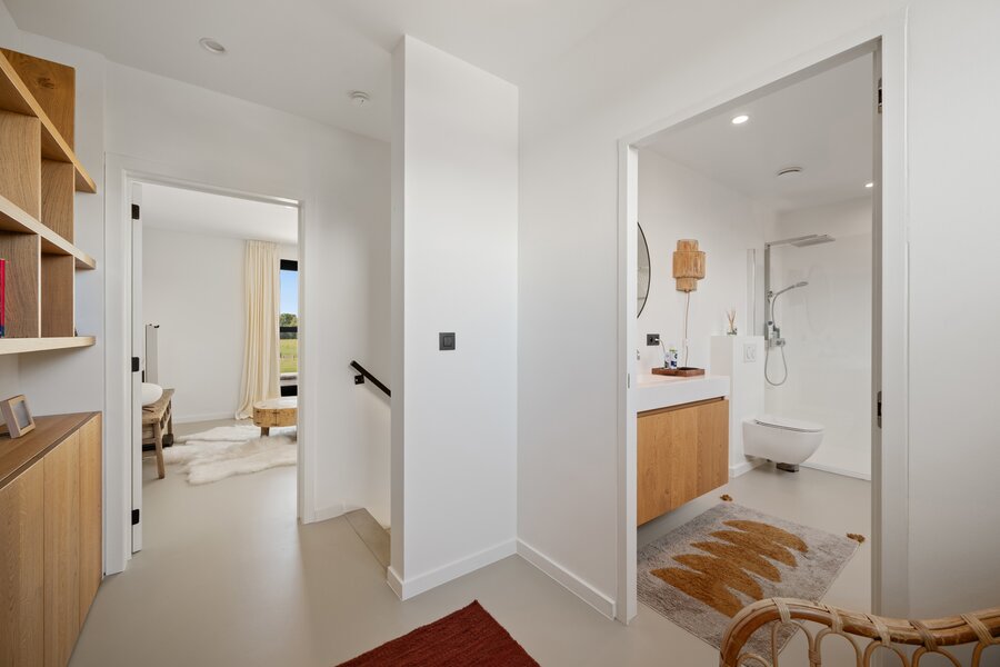Op de eerste verdieping bevindt zich de ruime masterslaapkamer (20 m²) met ingebouwde kast en een prachtig zicht op tuin, zwembad en omliggende velden. Aansluitend is er een badkamer met douche, lavabo en apart toilet. De nachthal beschikt over ingemaakte kasten en schappen.