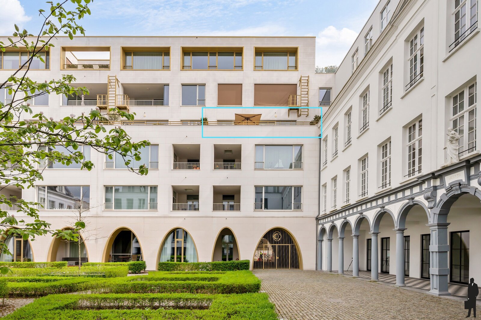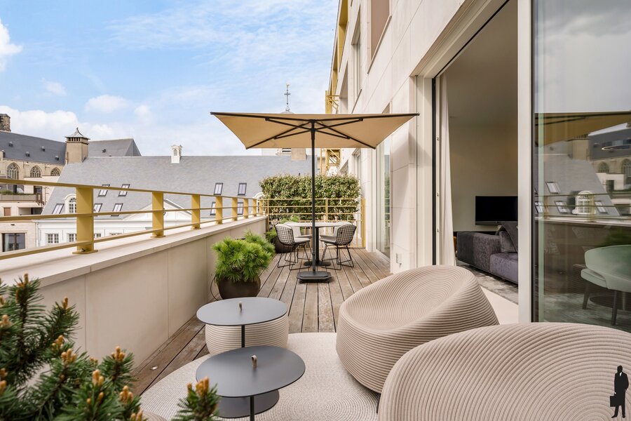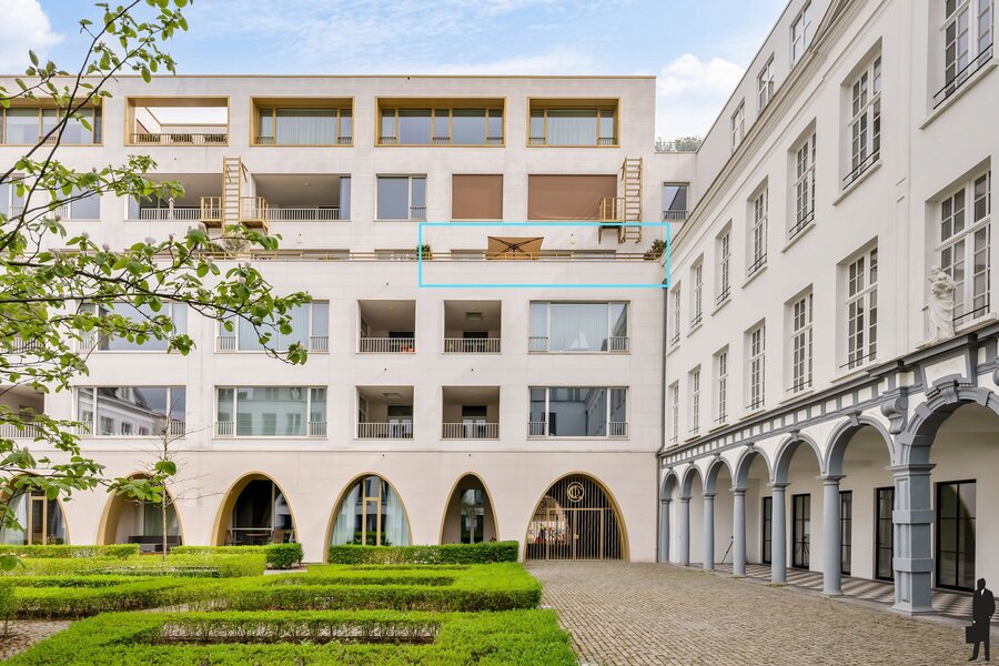 De lichtrijke leefruimte met volledig geïnstalleerde open keuken sluit naadloos aan op het indrukwekkende terras van maar liefst 23 m². Dankzij de gunstige oriëntatie geniet u hier in alle rust van een prachtig, rustgevend zicht op de aangelegde binnentuin, die vroeger dienstdeed als speelplaats.