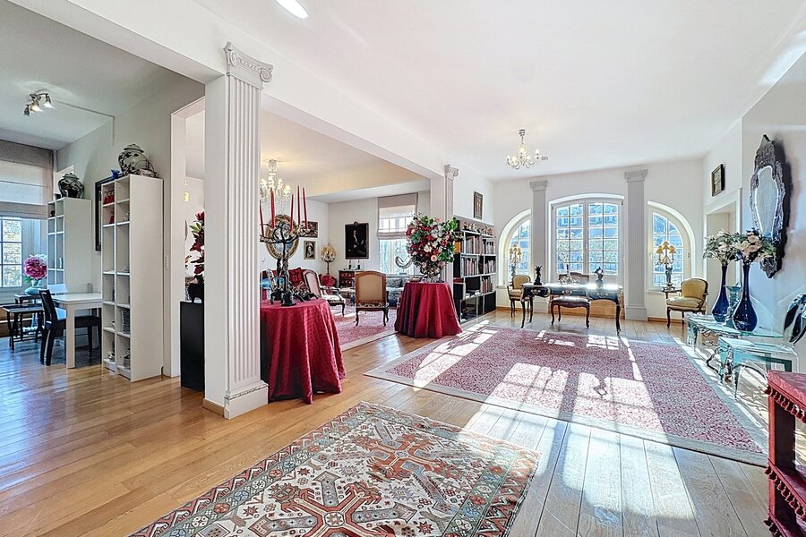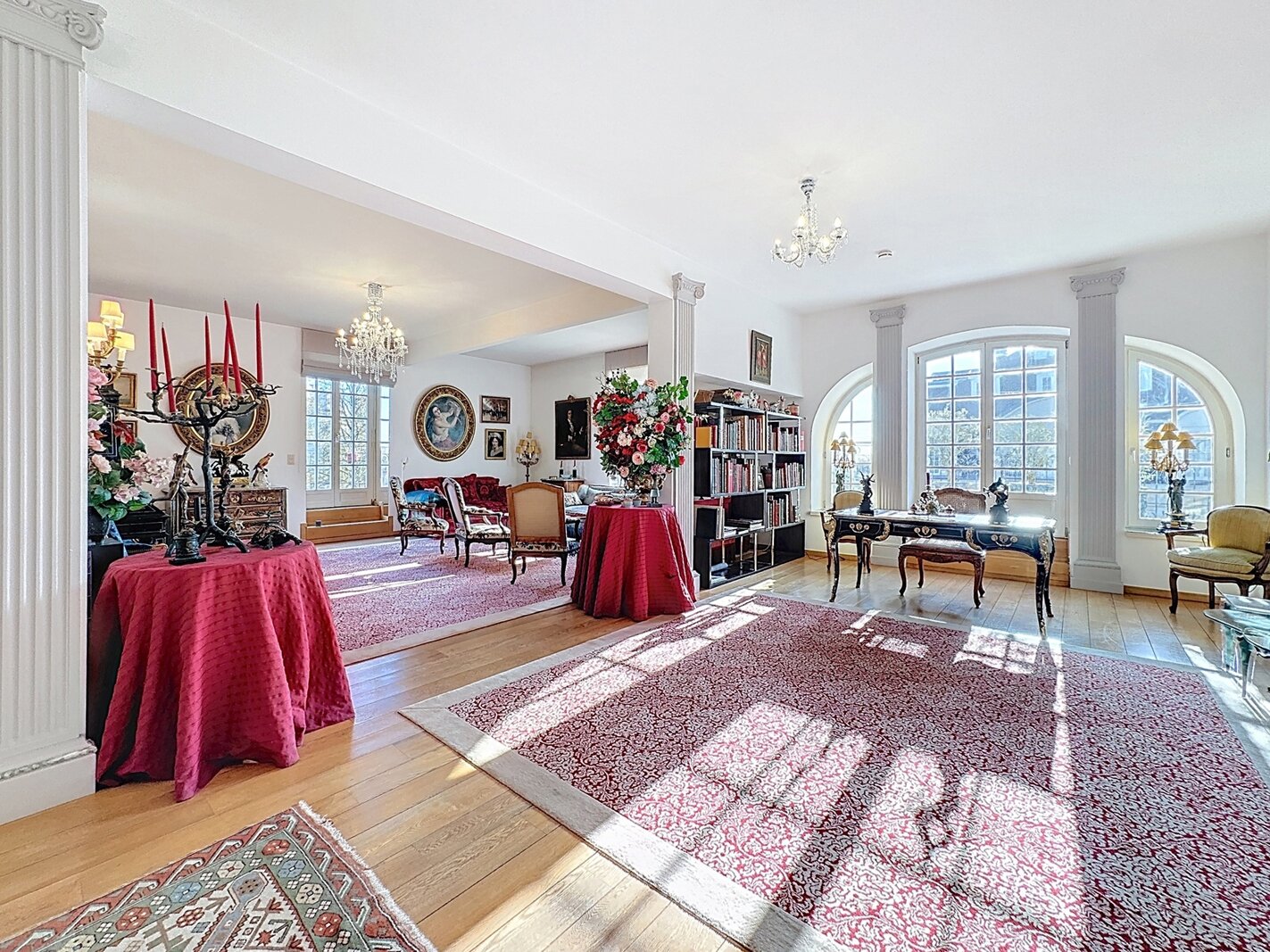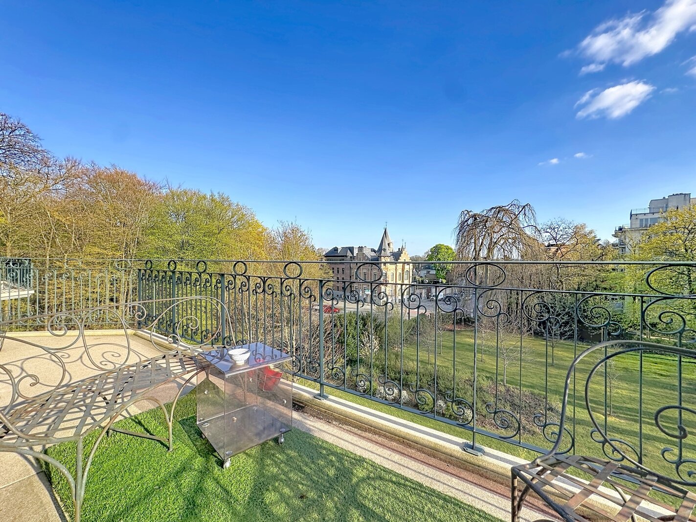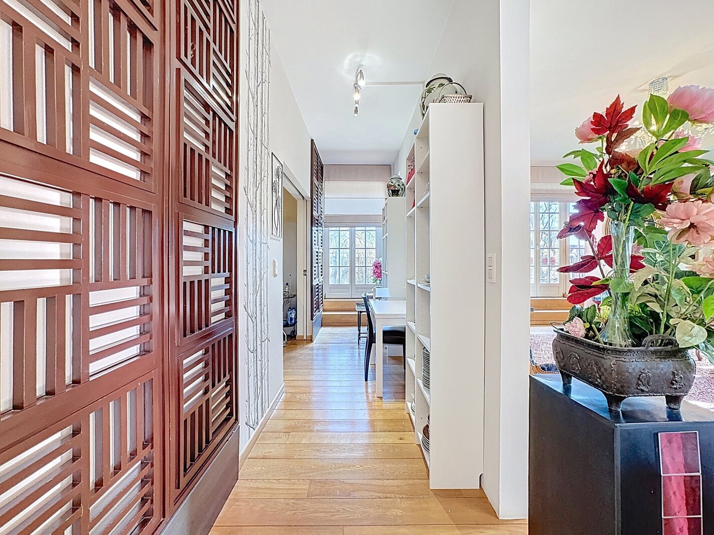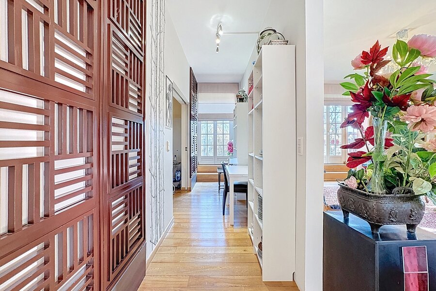 Gelegen op de 3e verdieping van de residentie Hyde Park, aan de rand van het Bois de la Cambre, spreekt dit eigendom van ±219 m² (appartement van ±184 m² en aangrenzende studio van ±35 m²) aan door zijn royale volumes en opmerkelijke lichtinval, in een groene omgeving.