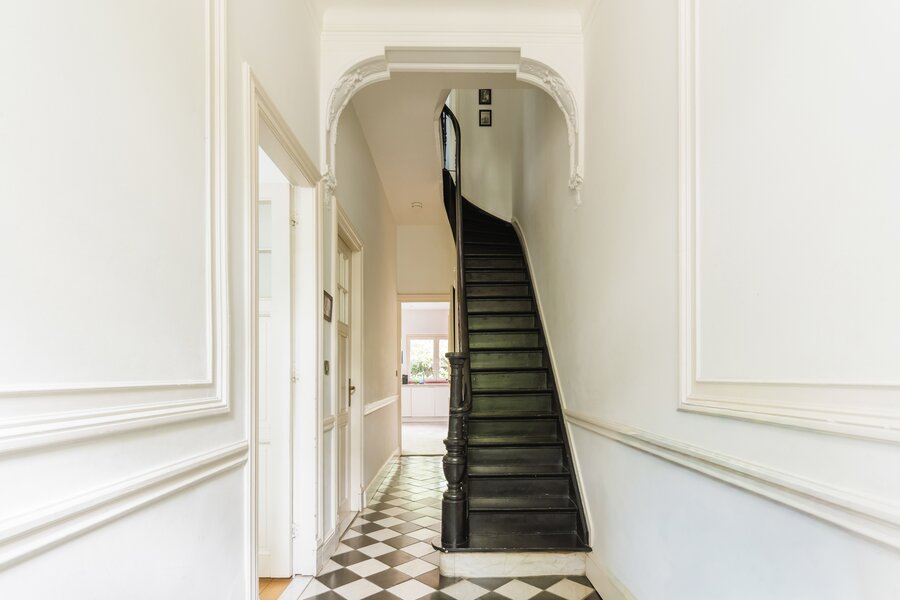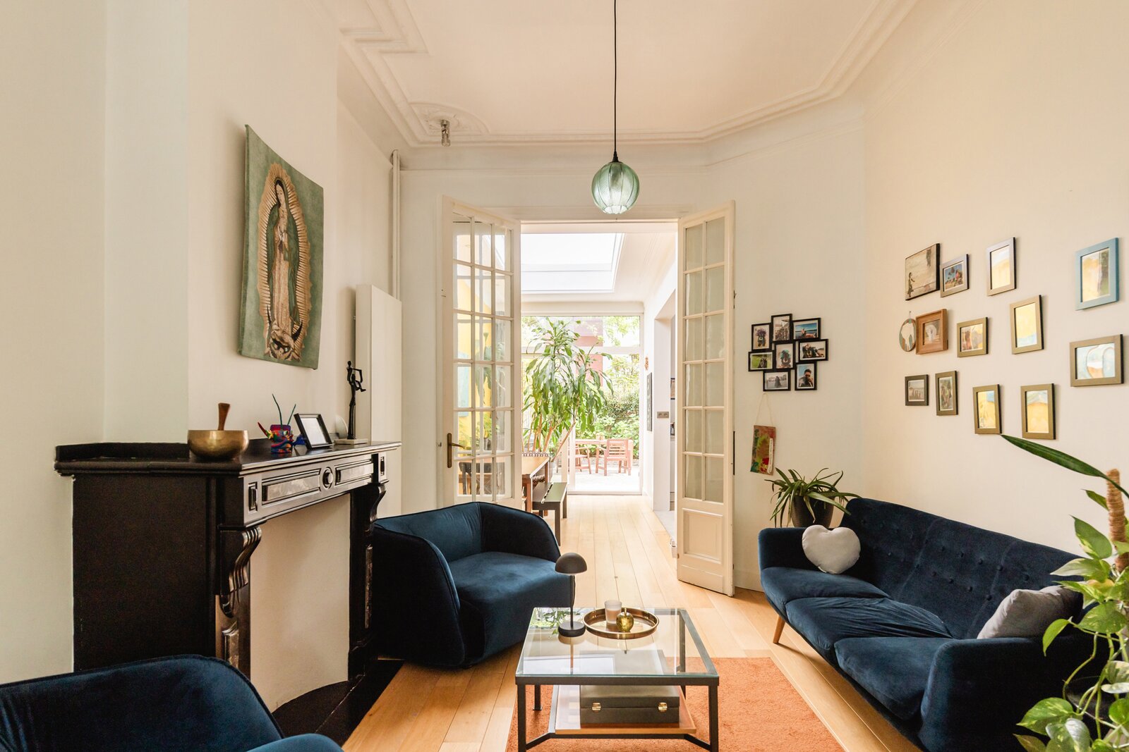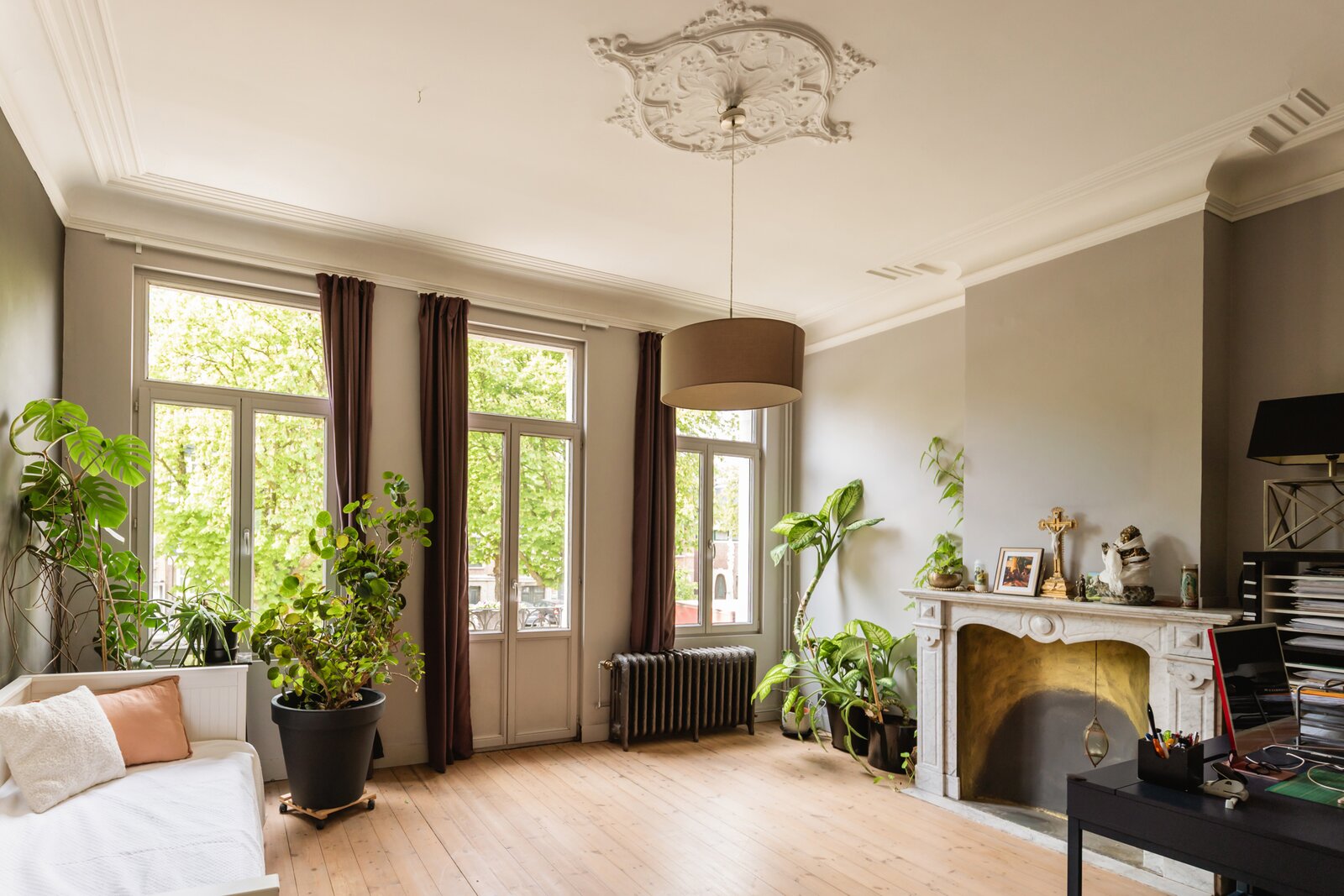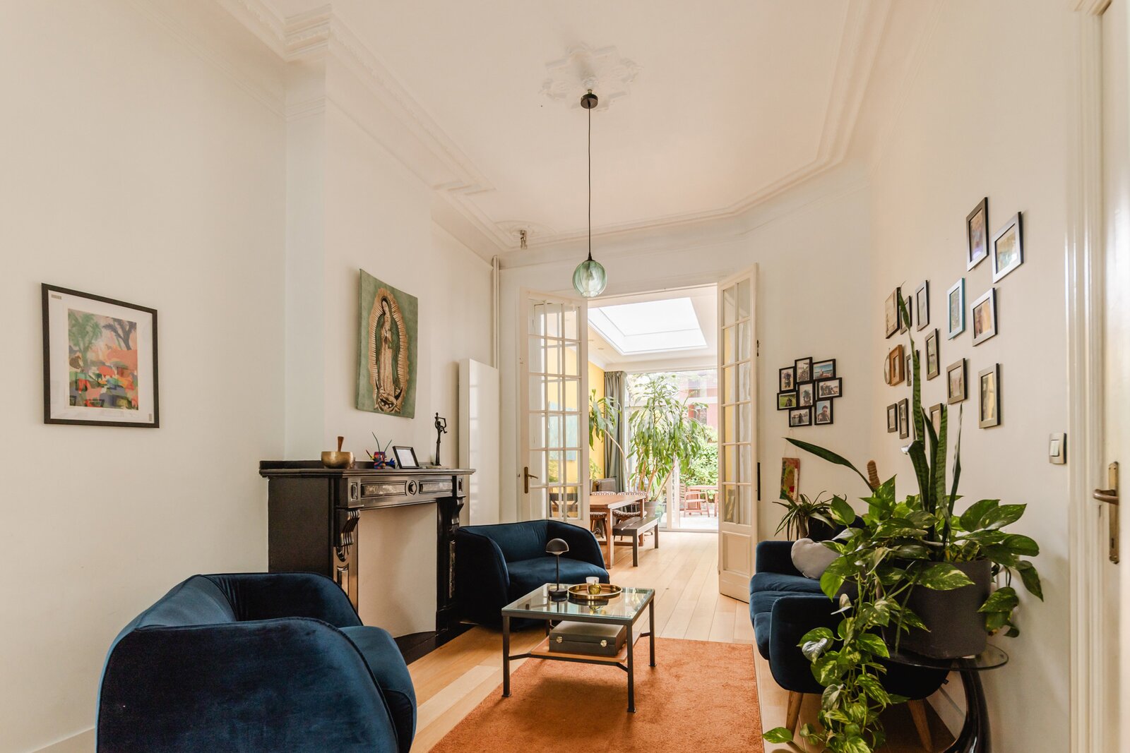 Wat direct opvalt, is de stijlvol gerenoveerde voorgevel met balkon in smeedwerk en fijne voortuin, ideaal voor fietsen. De nieuwe, houten voordeur baadt in de sfeer van weleer. Via de gang met hoge plafonds en moulures kom je in de gezellige leefruimte op parket. Mooi bewaarde binnendeuren, sierlijke boog en marmeren schouwmantels.