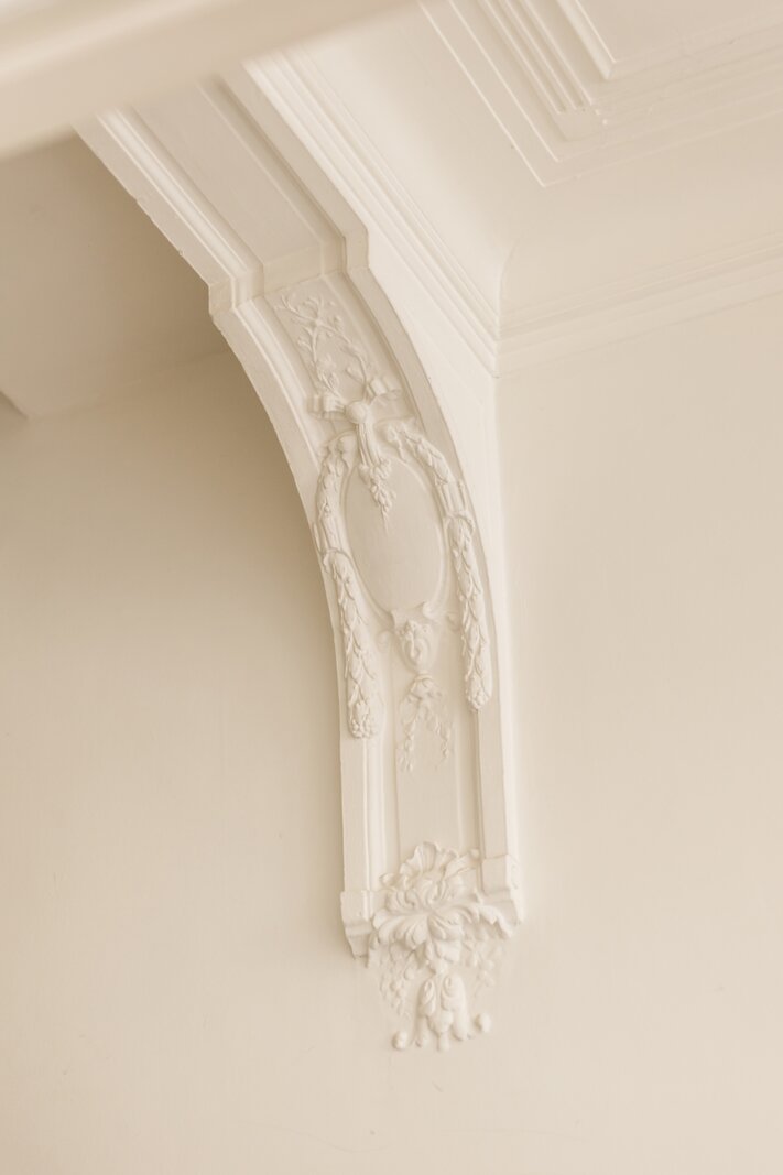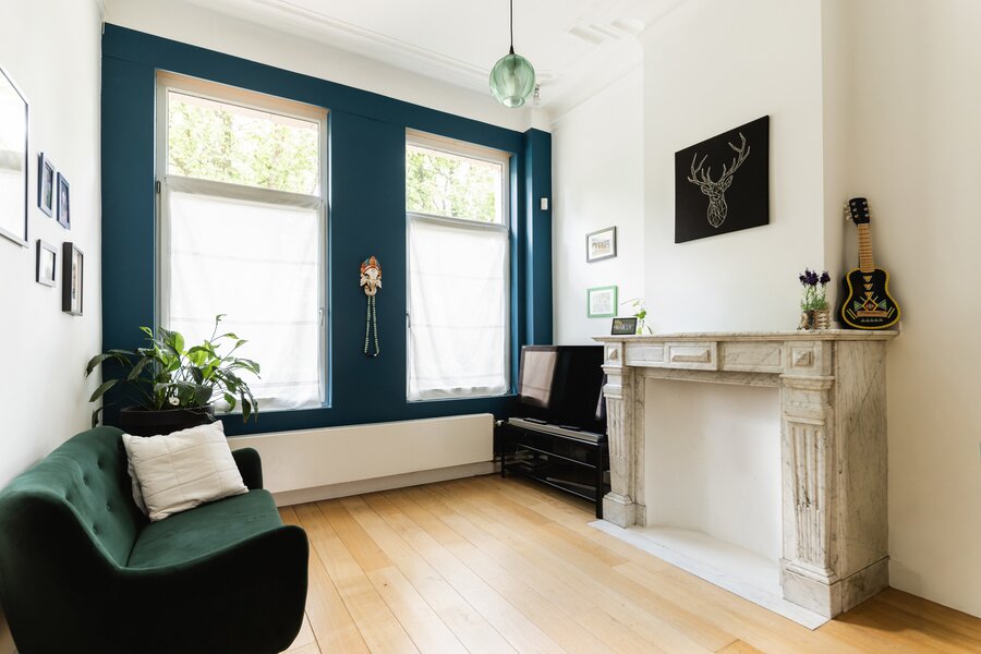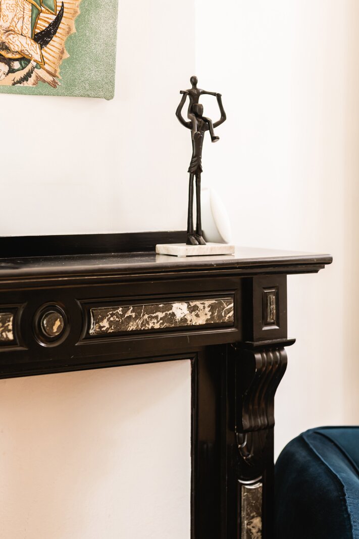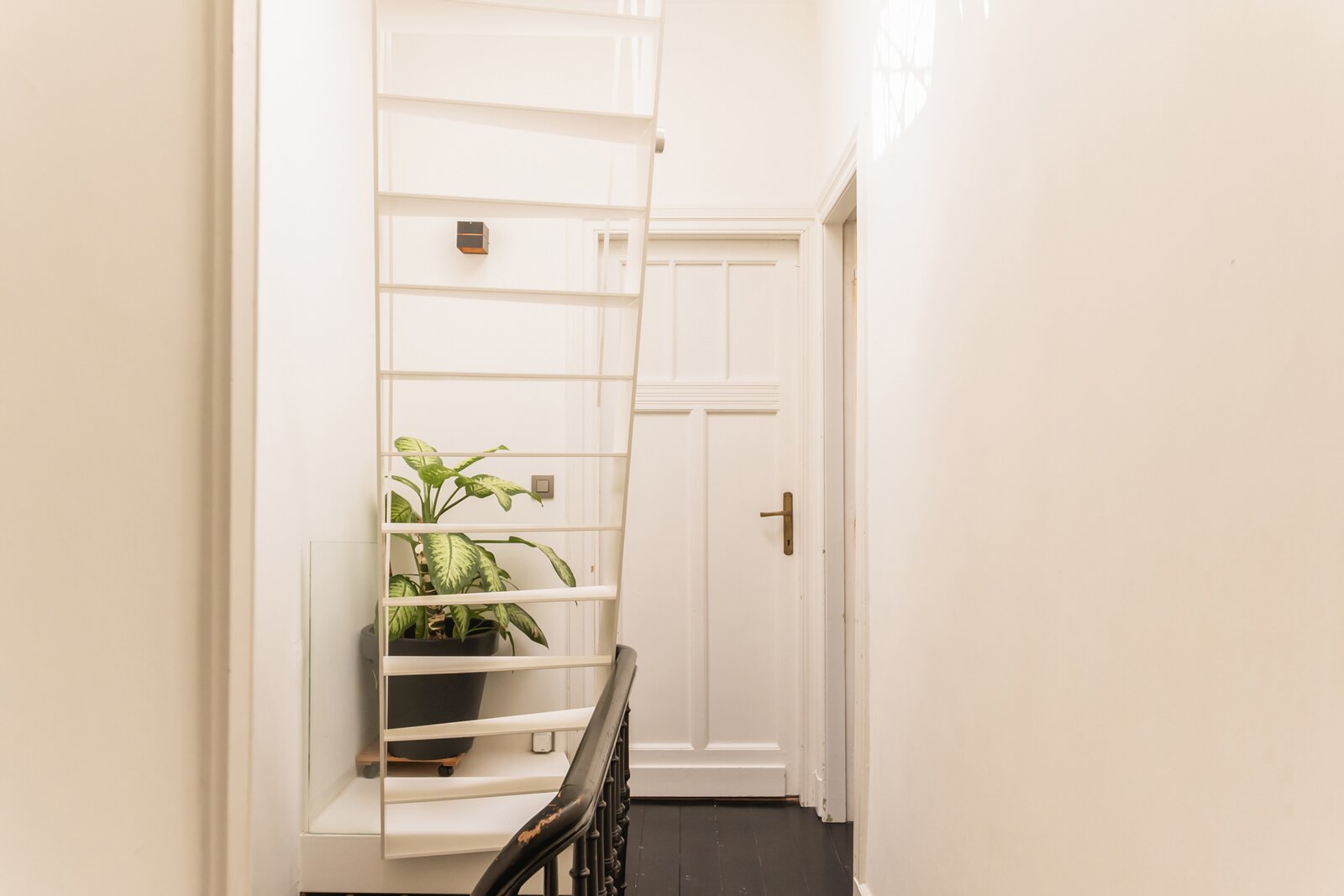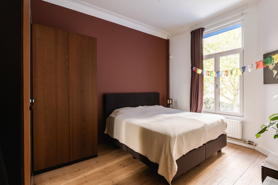 Wat direct opvalt, is de stijlvol gerenoveerde voorgevel met balkon in smeedwerk en fijne voortuin, ideaal voor fietsen. De nieuwe, houten voordeur baadt in de sfeer van weleer. Via de gang met hoge plafonds en moulures kom je in de gezellige leefruimte op parket. Mooi bewaarde binnendeuren, sierlijke boog en marmeren schouwmantels.