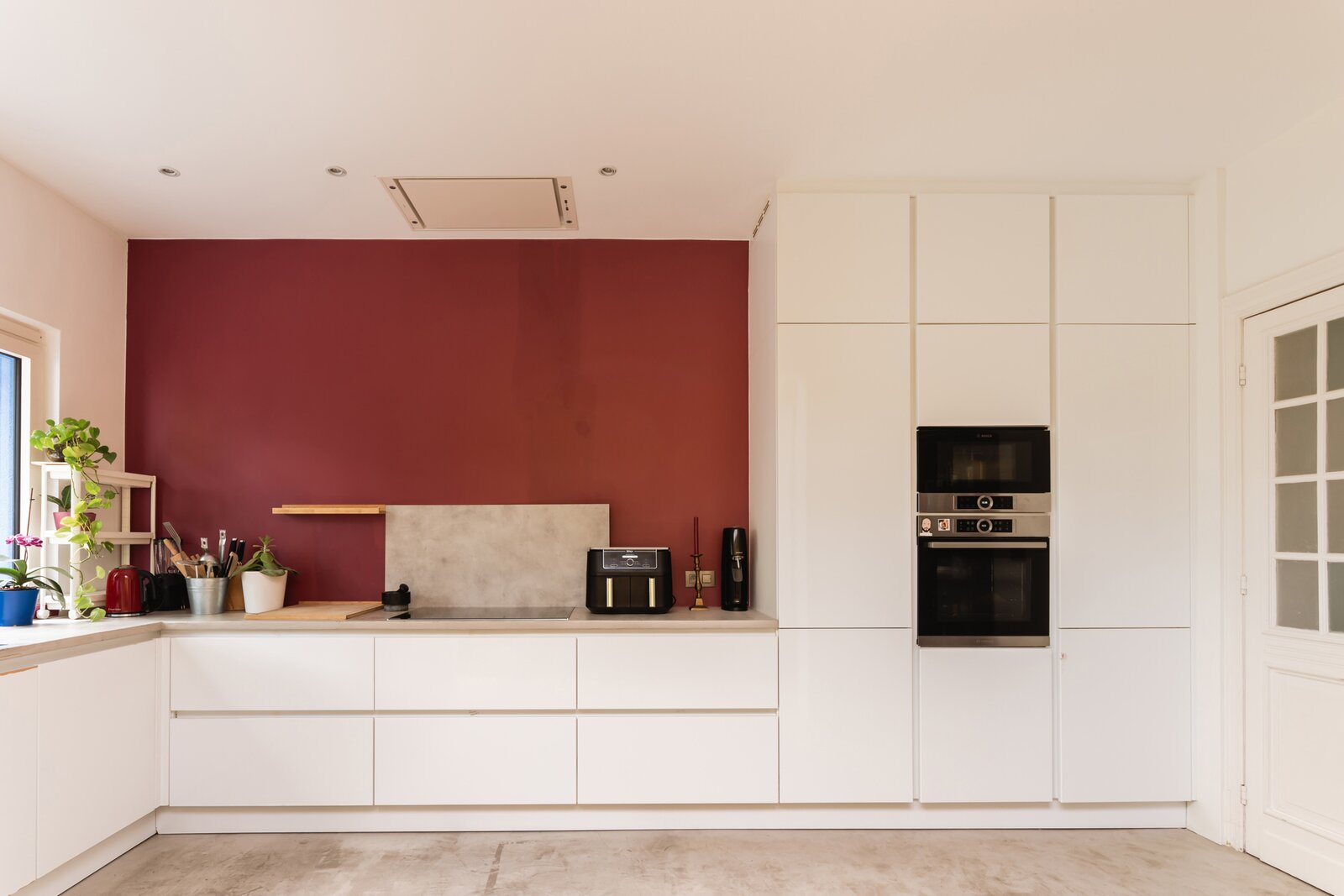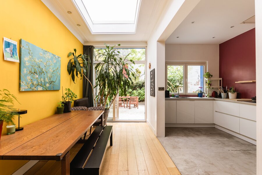 Klassieke indeling met vooraan salon, achteraan de zonovergoten eetkamer met lichtkoepel en ernaast de grote, open keuken. Via de grote raampartijen, bereik je de charmante, onderhoudsvriendelijke tuin. Verder op het gelijkvloers: gastentoilet en toegang tot de droge kelder.