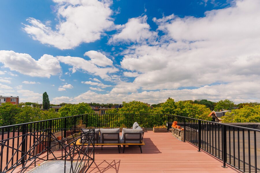 Op +2: drie slaapkamers en tweede badkamer (lavabo, douche, toilet). Moderne trap naar het giga, volledig omheinde dakterras in bankirai – hier is het heerlijk toeven met weids zicht op de groene boomrijen van de Elisabethlaan. Dankzij een zeer gunstig EPC B is dit huis energetisch futureproof. Optioneel drie autostaanplaatsen @ 25.000 euro/stuk op 300 meter.