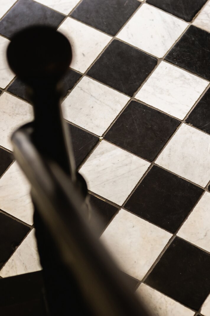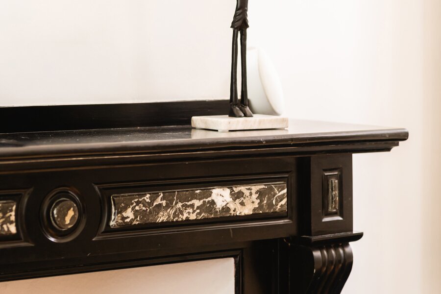 Elegante, authentieke trap naar +1, met vooraan één slaapkamer, opnieuw met marmeren schouwmantel en extra ruimte voor dressing of bureau, en de tweede slaapkamer, ook op de nog originele plankenvloer en de badkamer (dubbele lavabo, bad, toilet, inloopdouche).