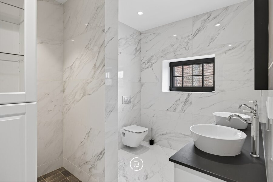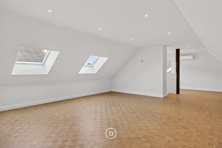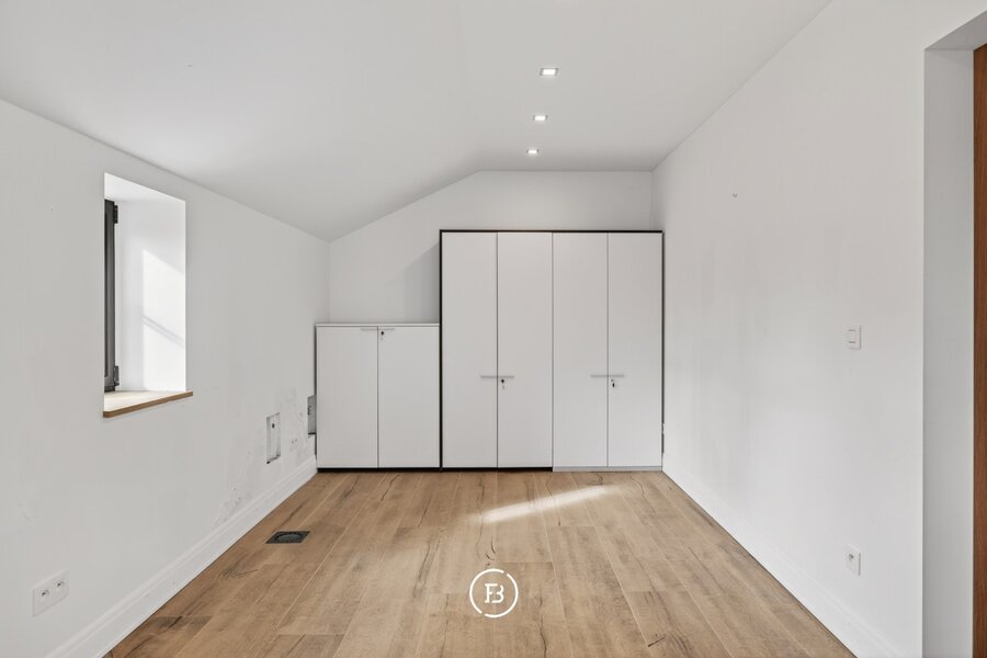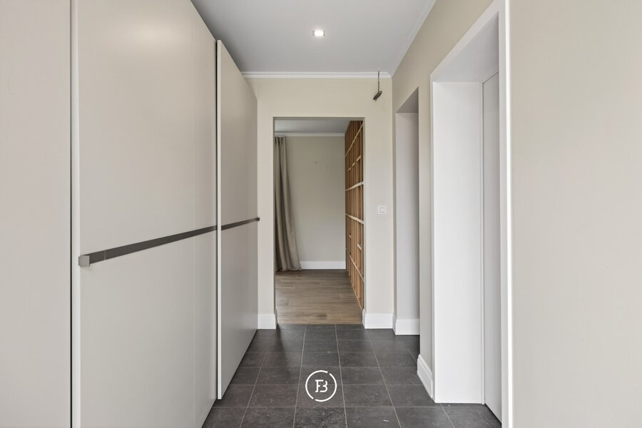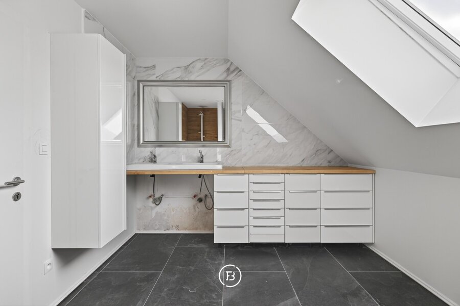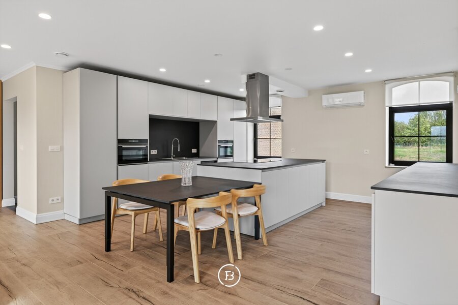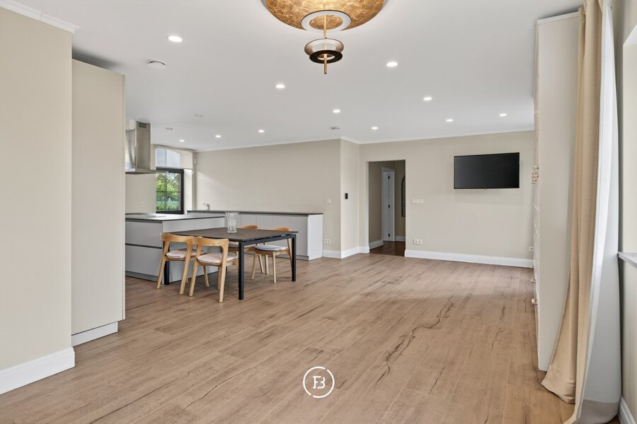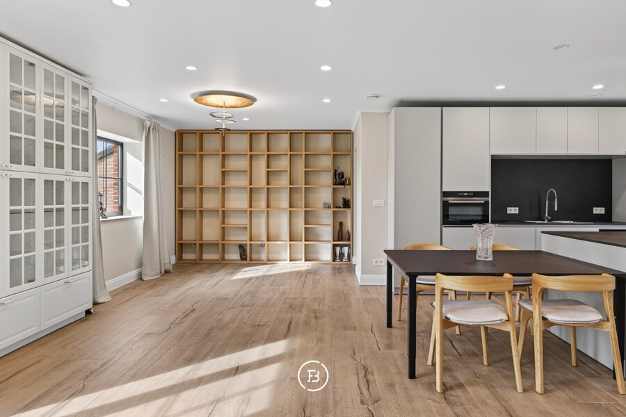 De woning beschikt over drie volwaardige slaapkamers en twee badkamers, waarvan één met een vrijstaand bad en één met een ruime inloopdouche. De leefruimte is open en licht, met een opvallende maatkast die zorgt voor extra karakter. De keuken sluit hier naadloos op aan en is volledig uitgerust, met voldoende plaats voor een eethoek.