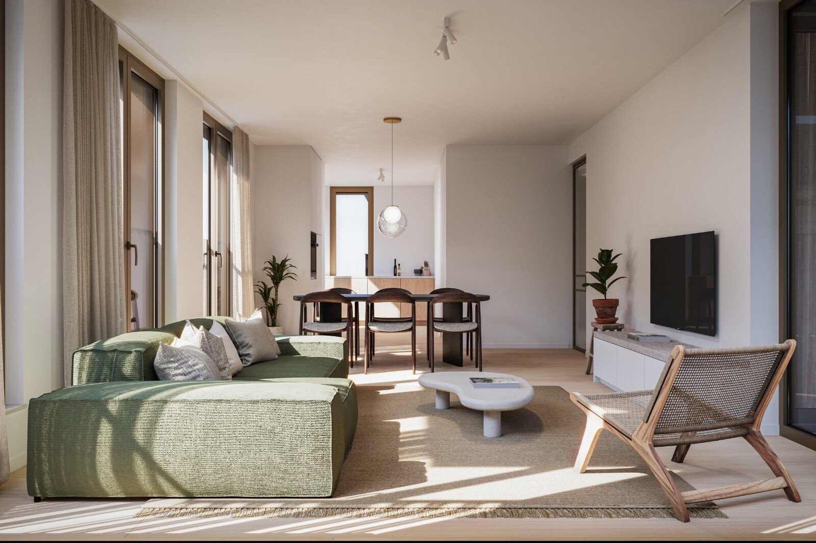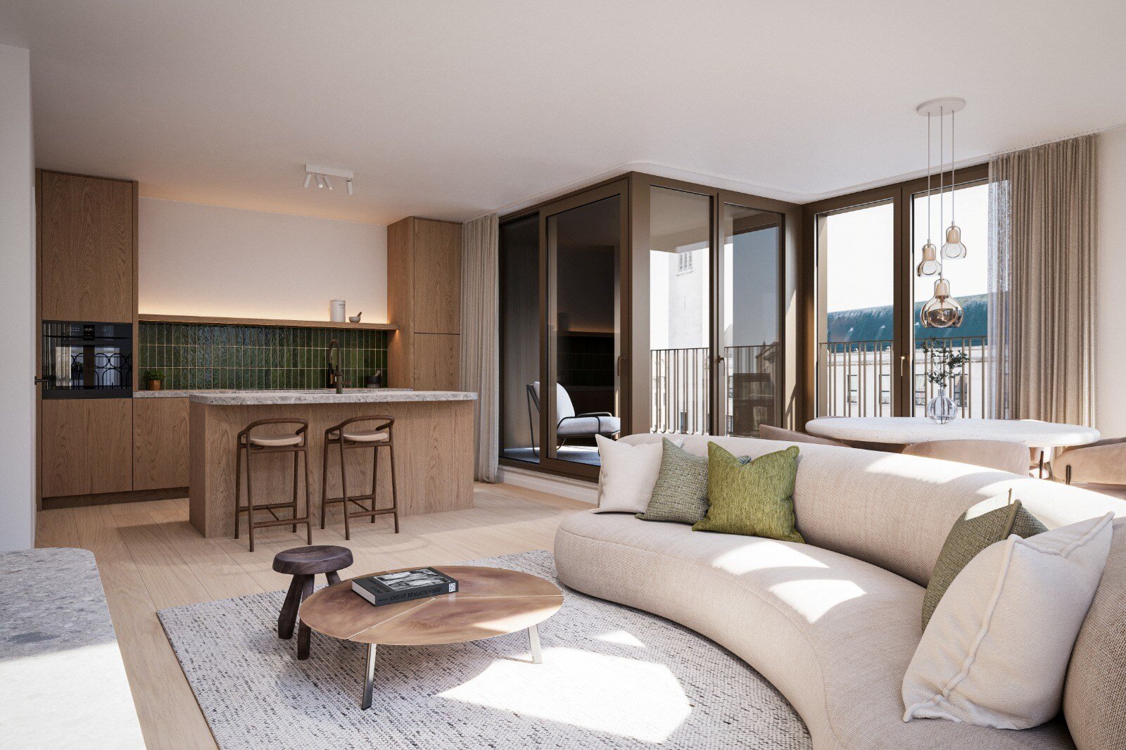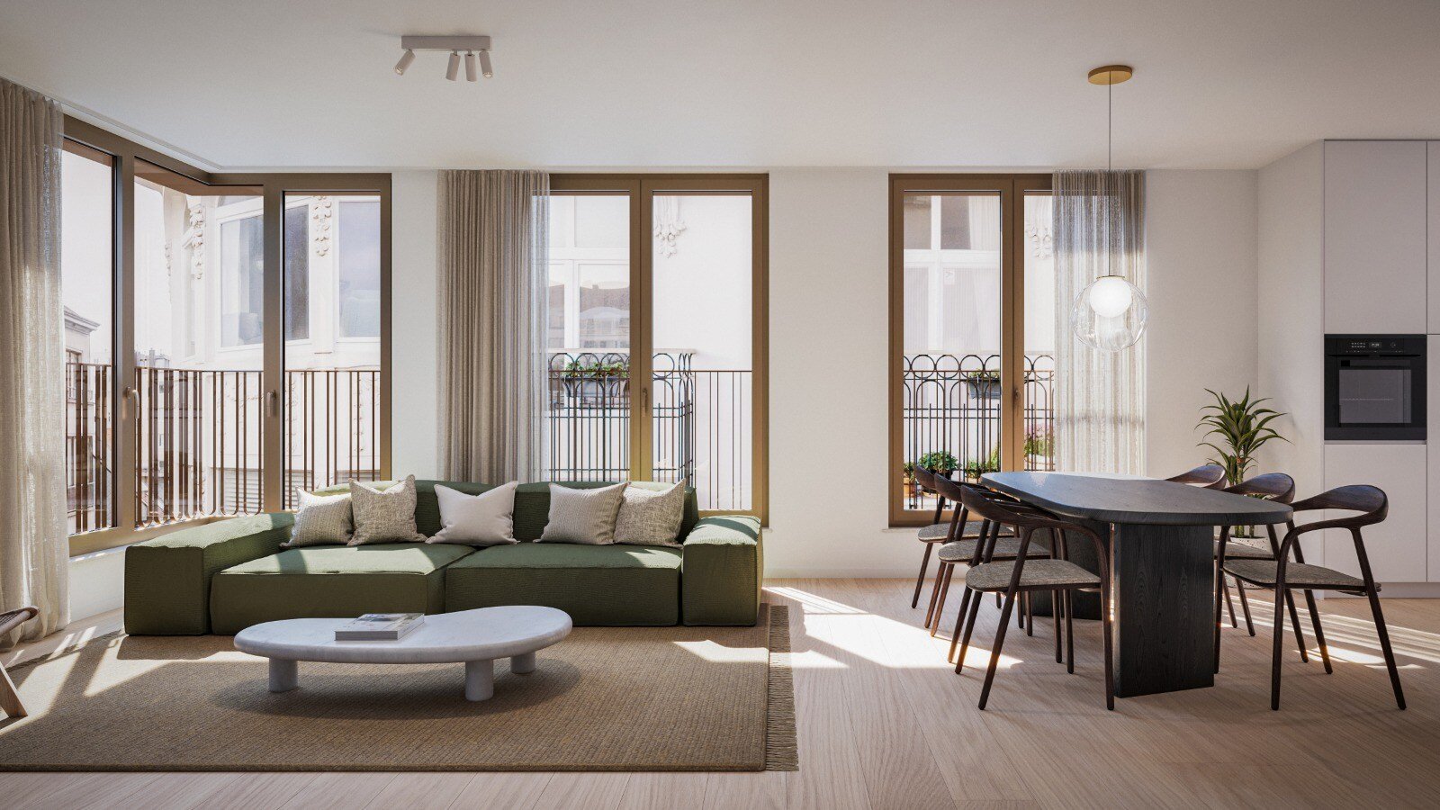 Het project omvat vijf ruime appartementen en een uitzonderlijk penthouse duplex. Elke woonst beschikt over een zuidwestgericht terras van minimaal 6 m² met een prachtig open zicht op het Wapenplein. Dankzij de optimale oriëntatie geniet je hier volop van zon, licht en levendigheid. Vanuit de hogere verdiepingen en het penthouse ervaar je bovendien een subtiele glimp van zeezicht, wat het unieke kustgevoel extra versterkt.