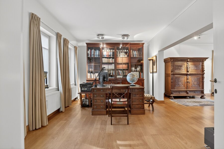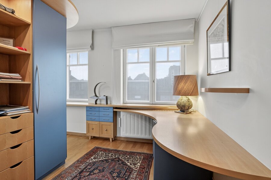 Aan de voorzijde bevindt zich een praktisch bureel, ideaal voor vrije beroepers of wie wonen en werken graag combineert.