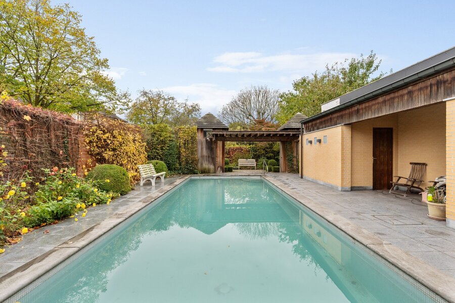 De aangelegde tuin met zwembad en poolhouse vormt een echt rustpunt, een plek waar ontspanning en gezelligheid samenkomen.