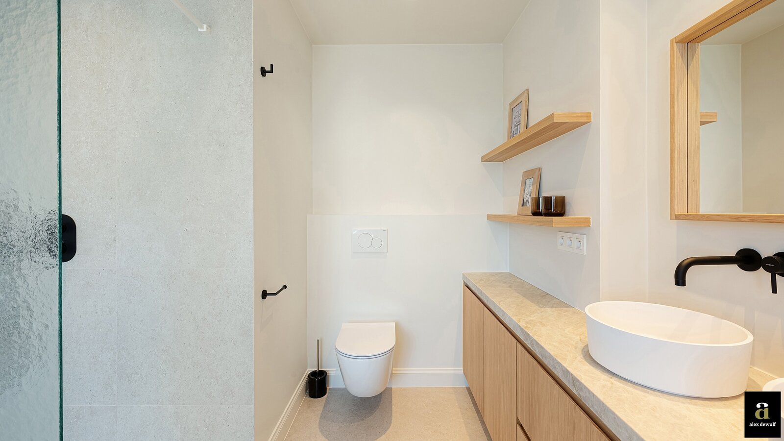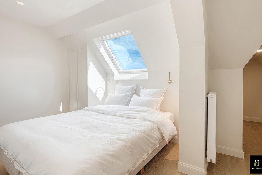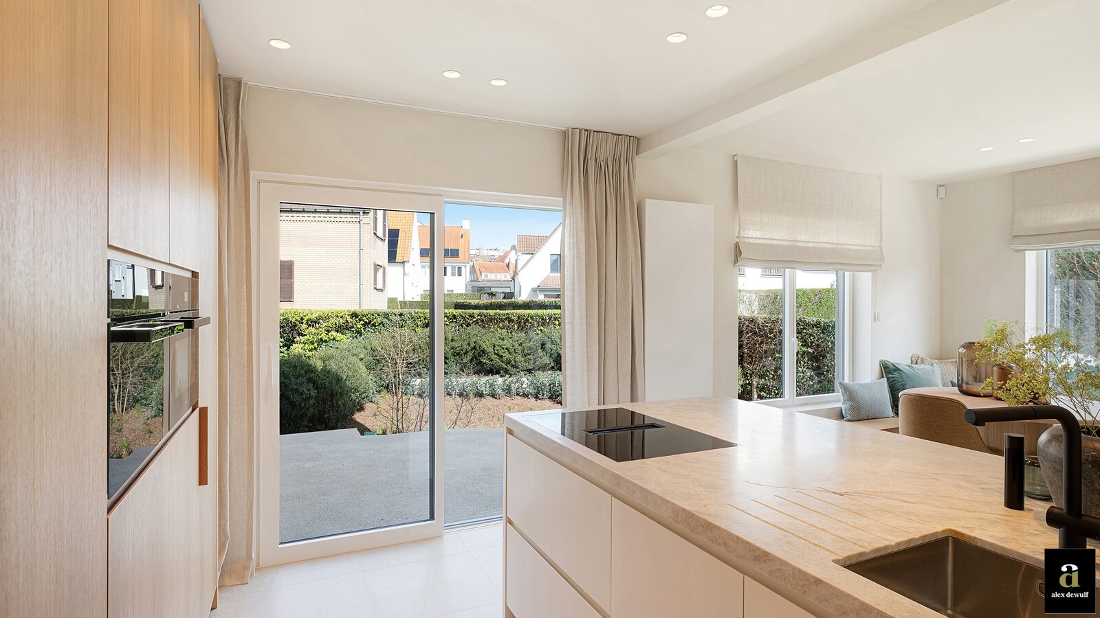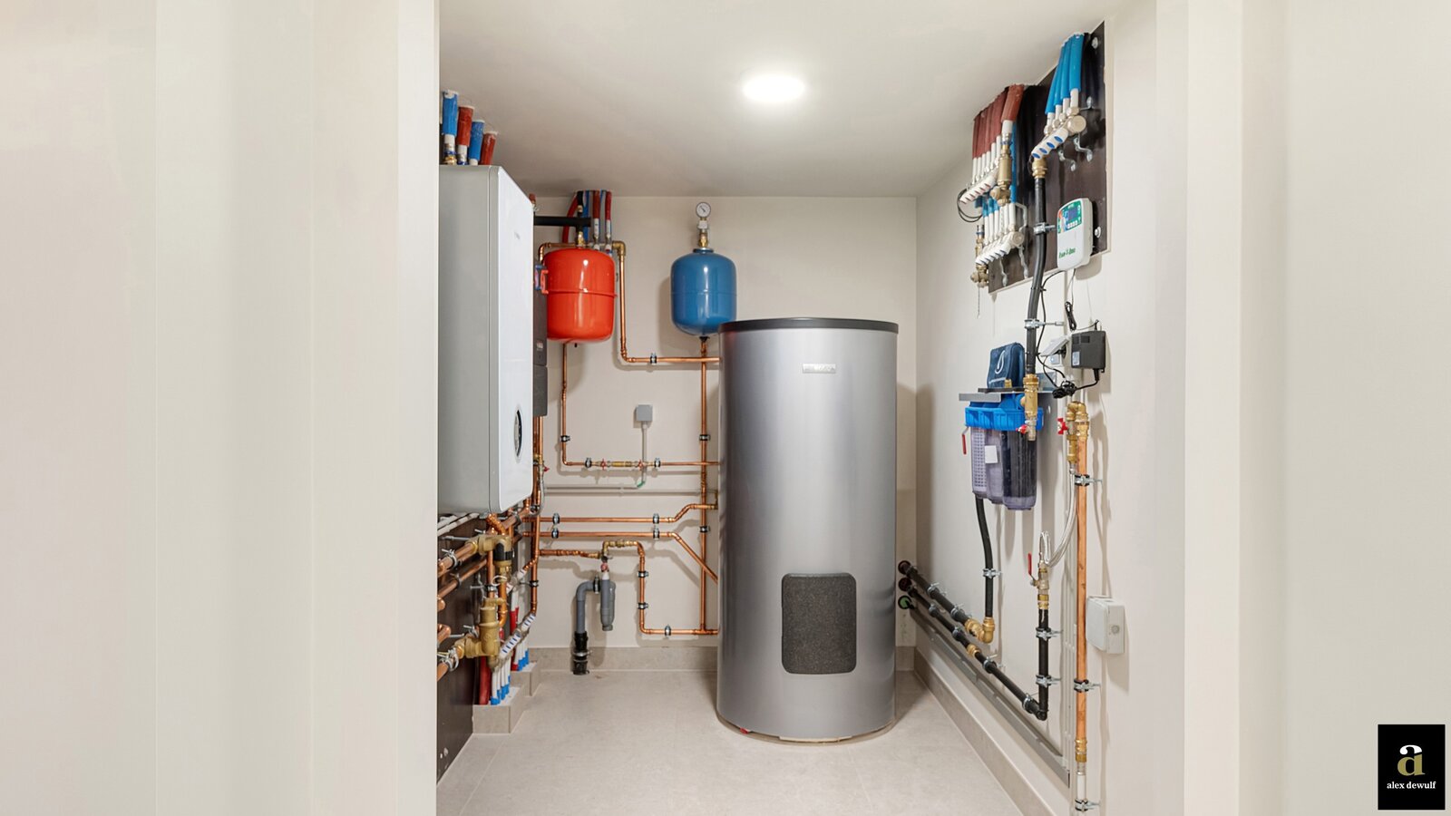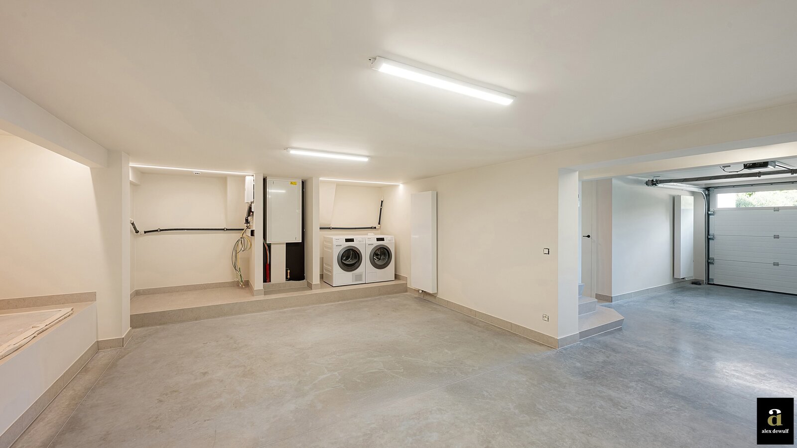 Indeling: Bij het binnenkomen wordt u verwelkomd in een elegante inkomhal die de sfeervolle zithoek aan de straatzijde scheidt van de open leefkeuken aan de tuinzijde. Deze keuken is verfijnd afgewerkt met eiken fineer en volledig uitgerust met kwalitatieve toestellen en dubbele ovens. De villa beschikt over vijf volwaardige slaapkamers, allen voorzien van riante maatkasten. De master suite geniet van een luxueuze ensuite badkamer met ligbad, inloopdouche en toilet; daarnaast zijn er nog drie extra badkamers aanwezig.