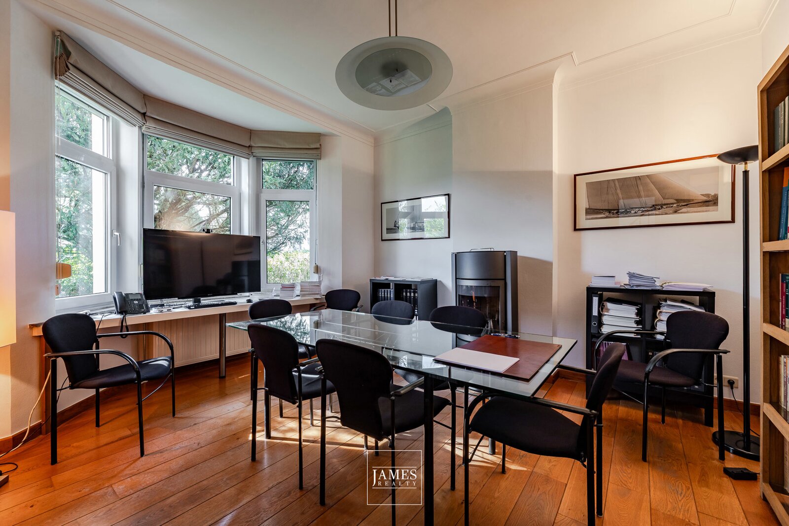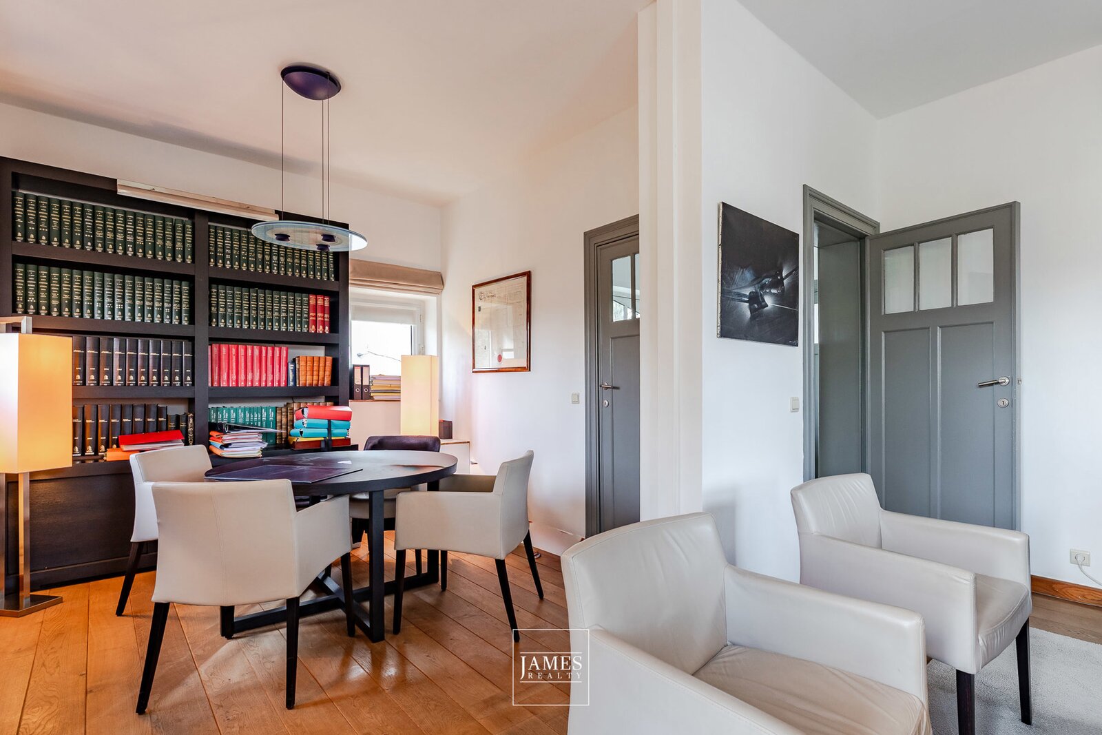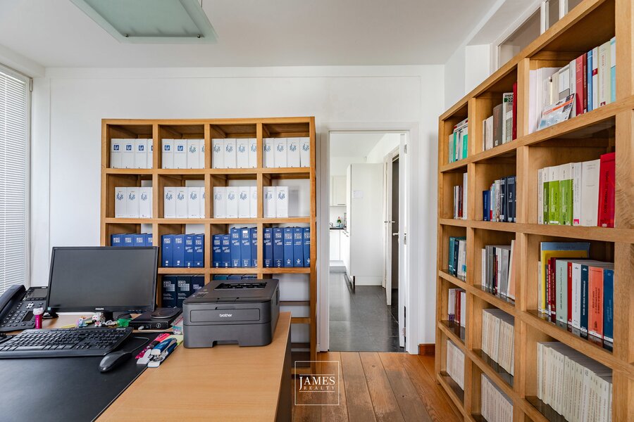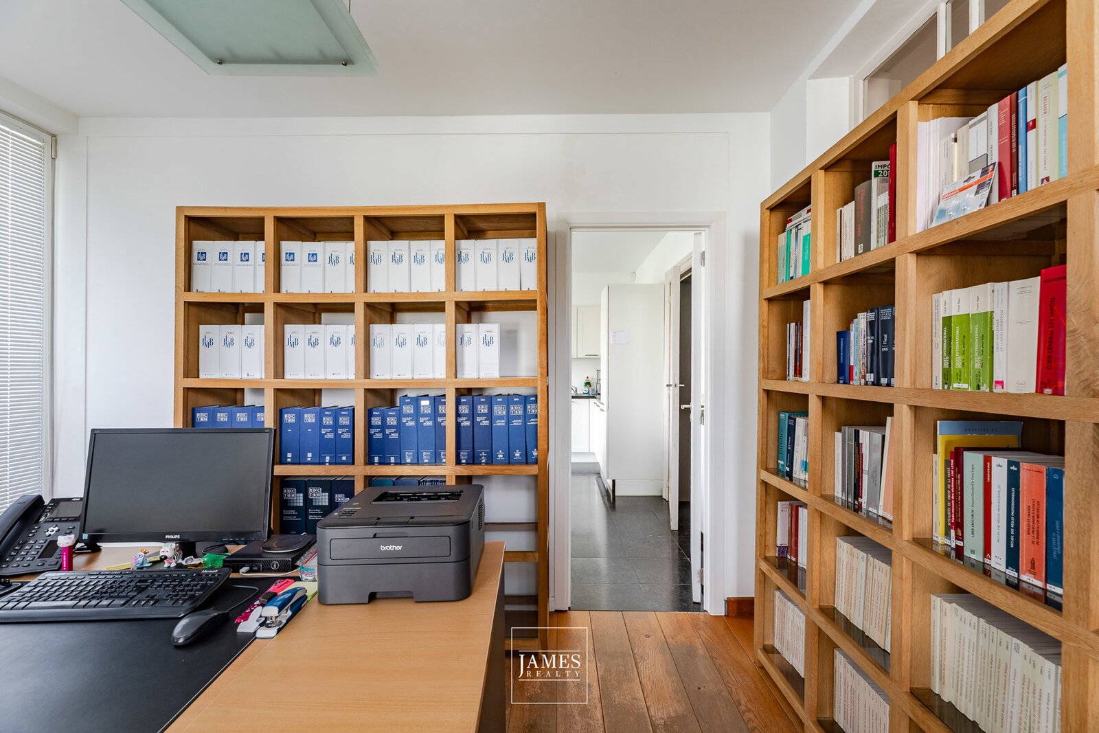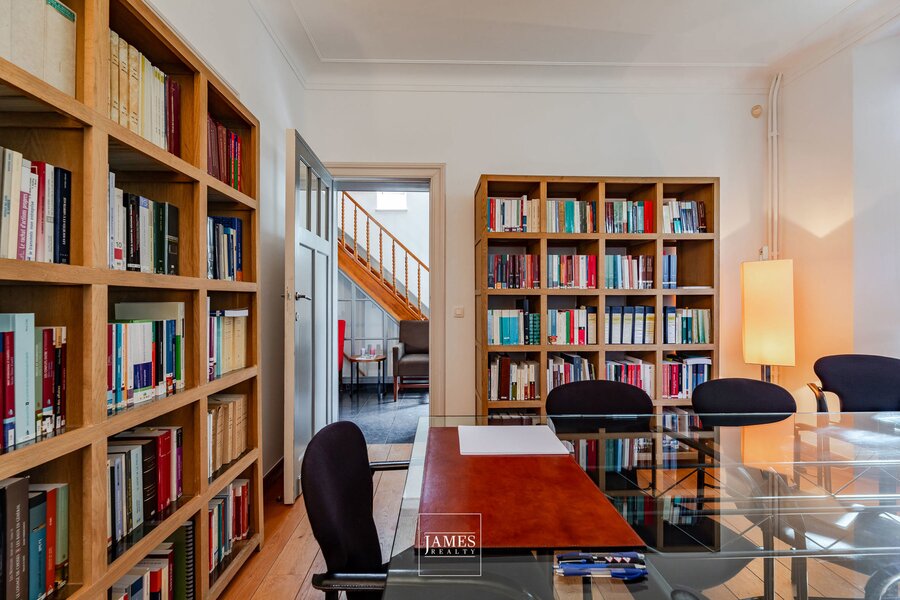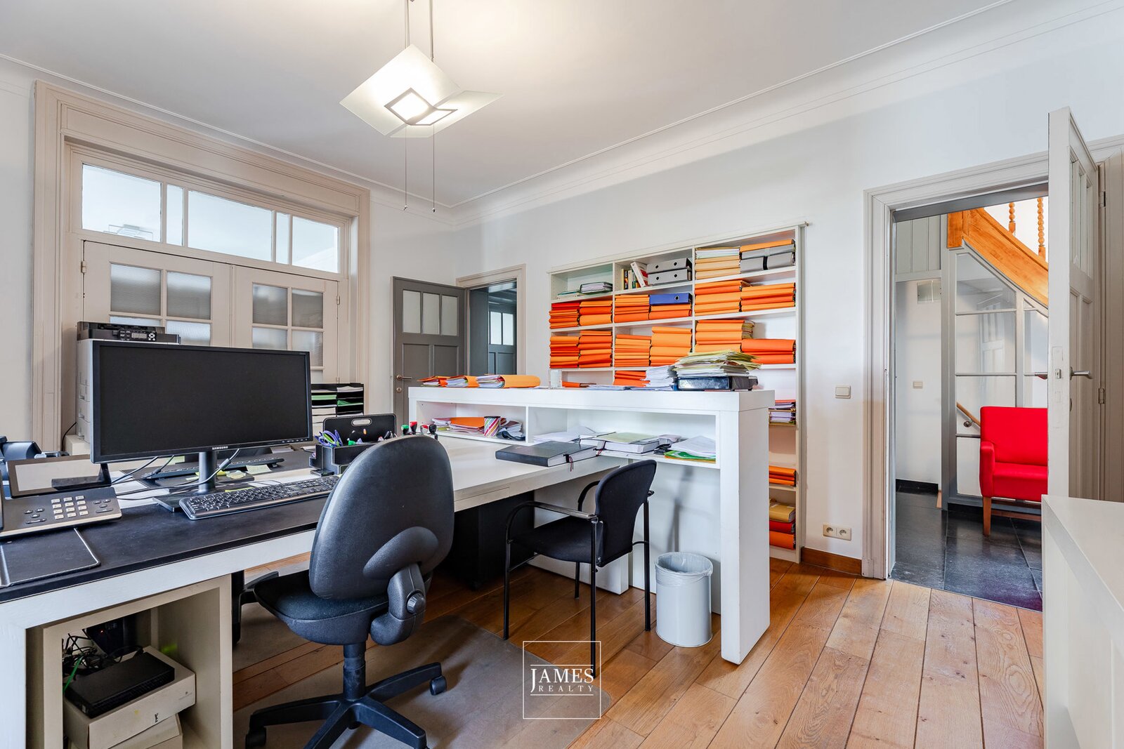 Het tuinniveau omvat momenteel verschillende werkruimtes (kantoren, archiefruimte, nevenruimtes), perfect geschikt voor professionele activiteiten. Het verhoogde gelijkvloers aan straatzijde bestaat uit een enfilade van mooie ontvangstruimtes, momenteel ingericht als kantoren, een keuken en een aangenaam terras.