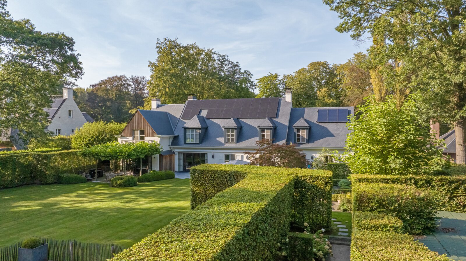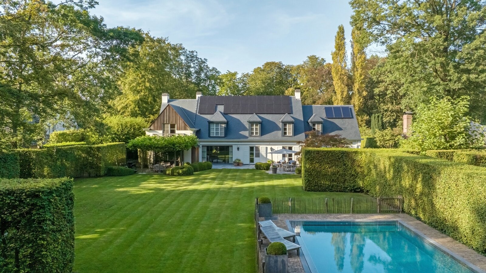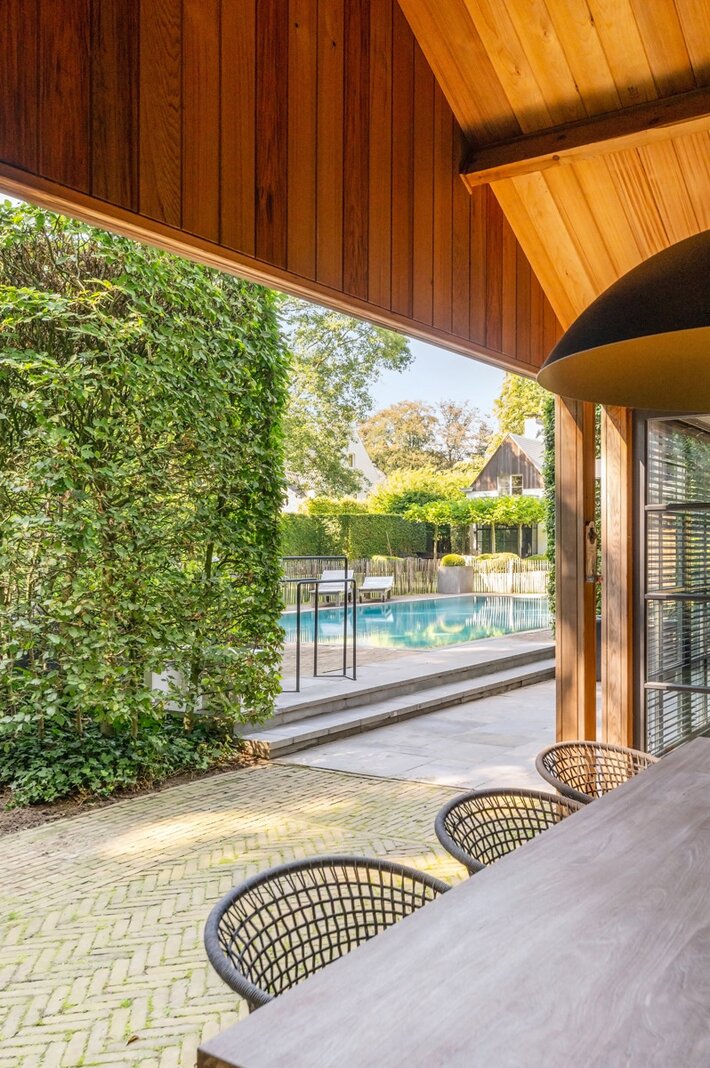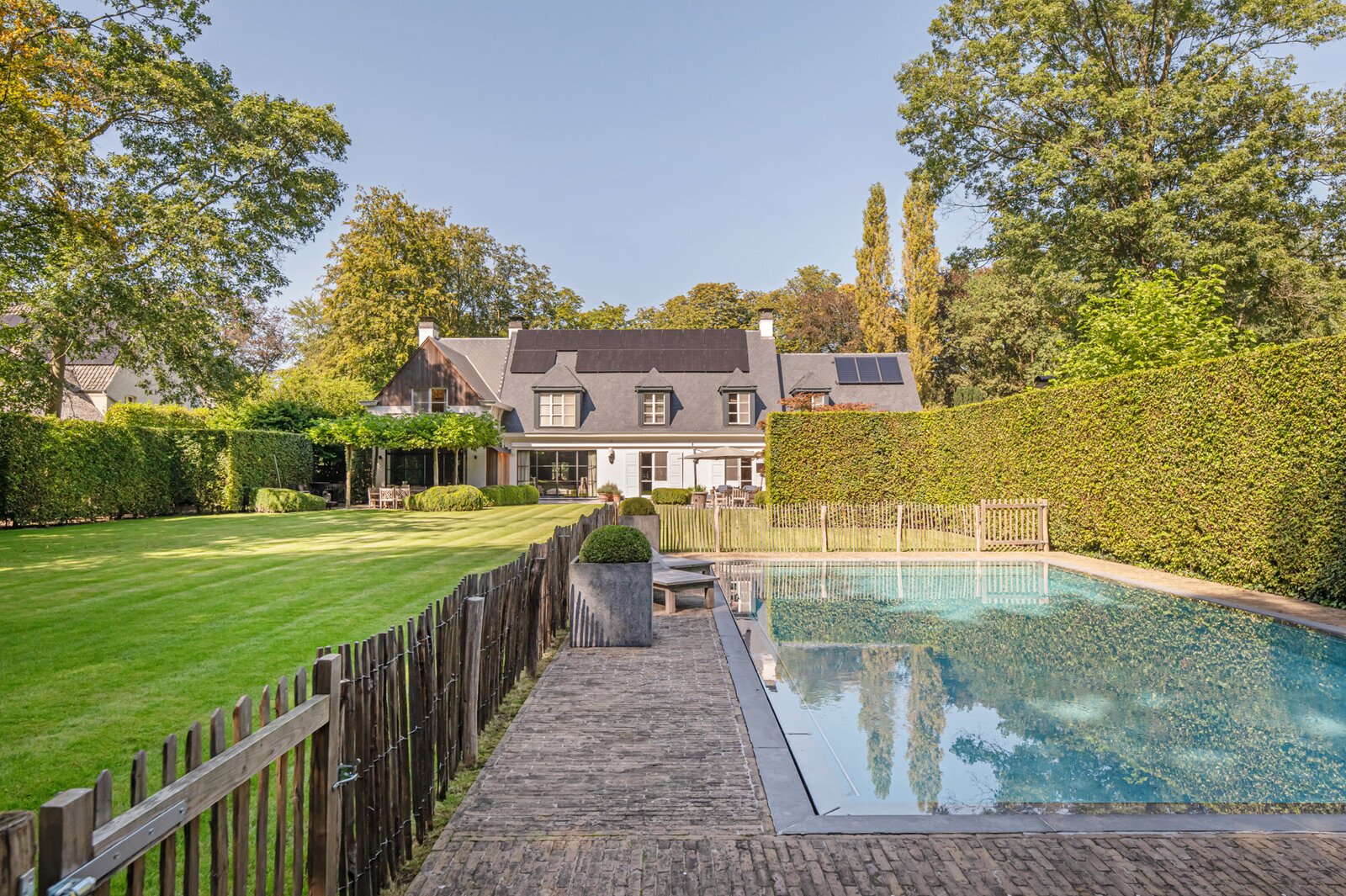 Er is een elegant ingericht bureau op de begane grond, een keuken met eetkamer, een royale eetkamer met een aparte openhaard/BBQ en een ruime salon met open haard, ideaal voor entertainment. De woning beschikt over een garage voor 2 auto's en een volledig vernieuwd dak met natuurleien (in 2023). De vloeren en parketten zijn prachtig bewaard gebleven, en de woning is uitgerust met domotica voor ultiem comfort. Buiten kunt u genieten van een luxueuze levensstijl met een poolhouse inclusief keuken, douche, sauna en geïntegreerde BBQ, naast een overloopzwembad van 12 x 5,5 meter. Het zwembad is omringd door een prachtig aangelegde tuin met een Japanse visvijver.