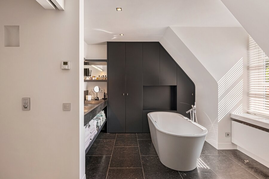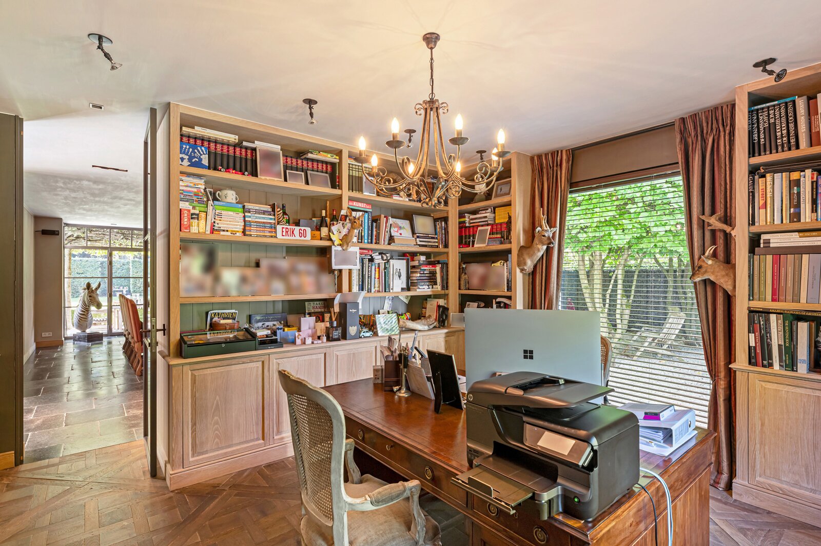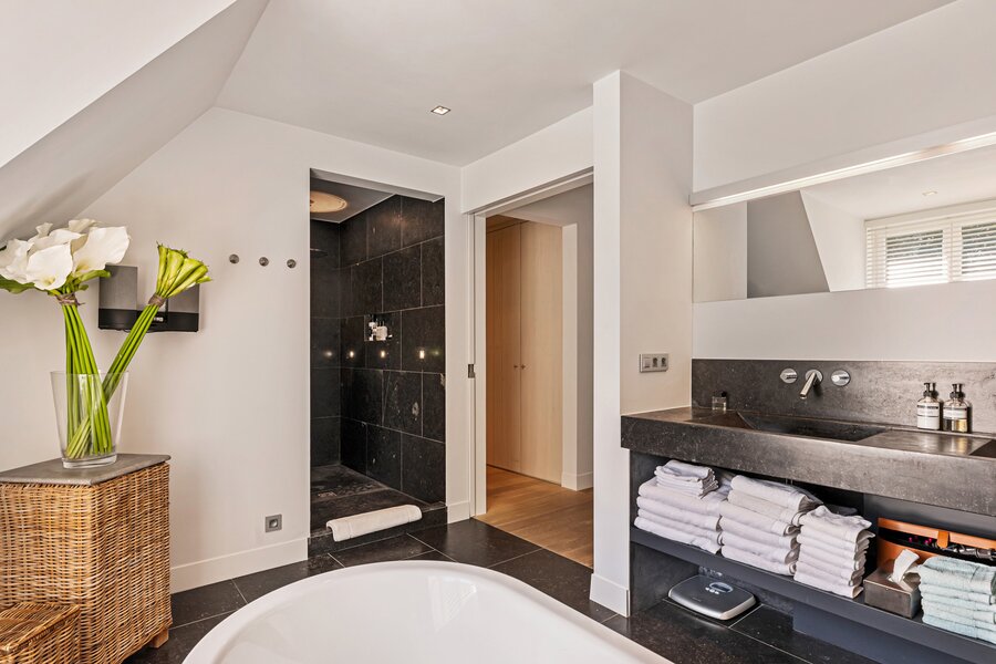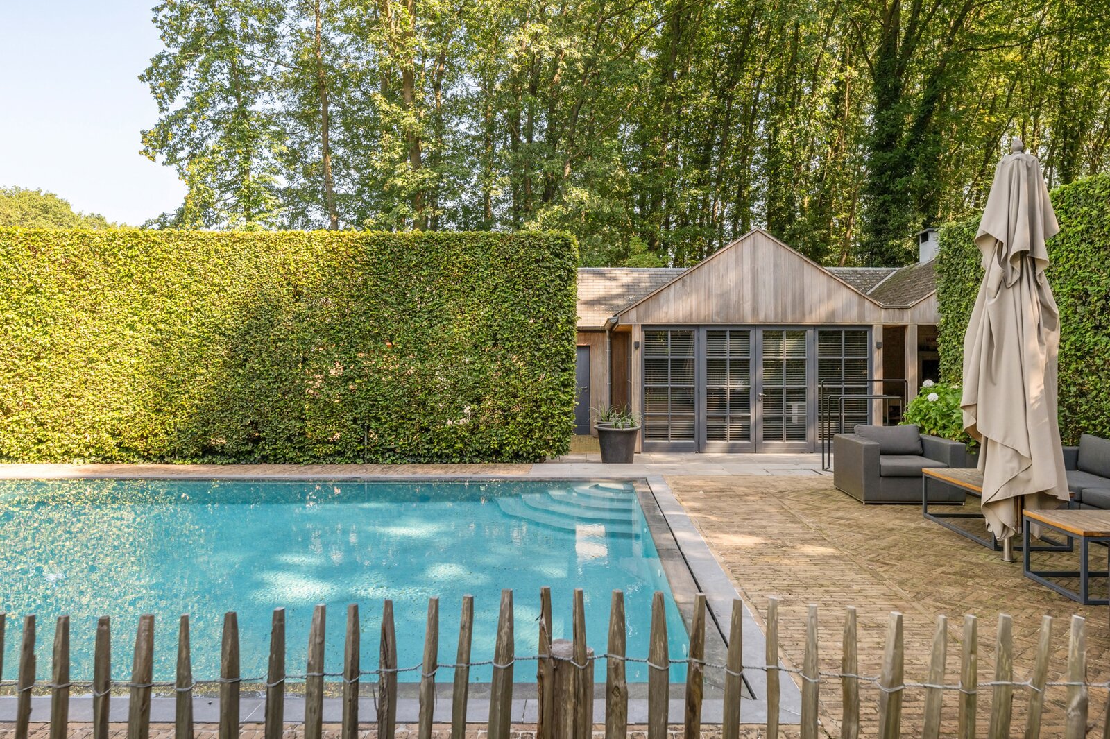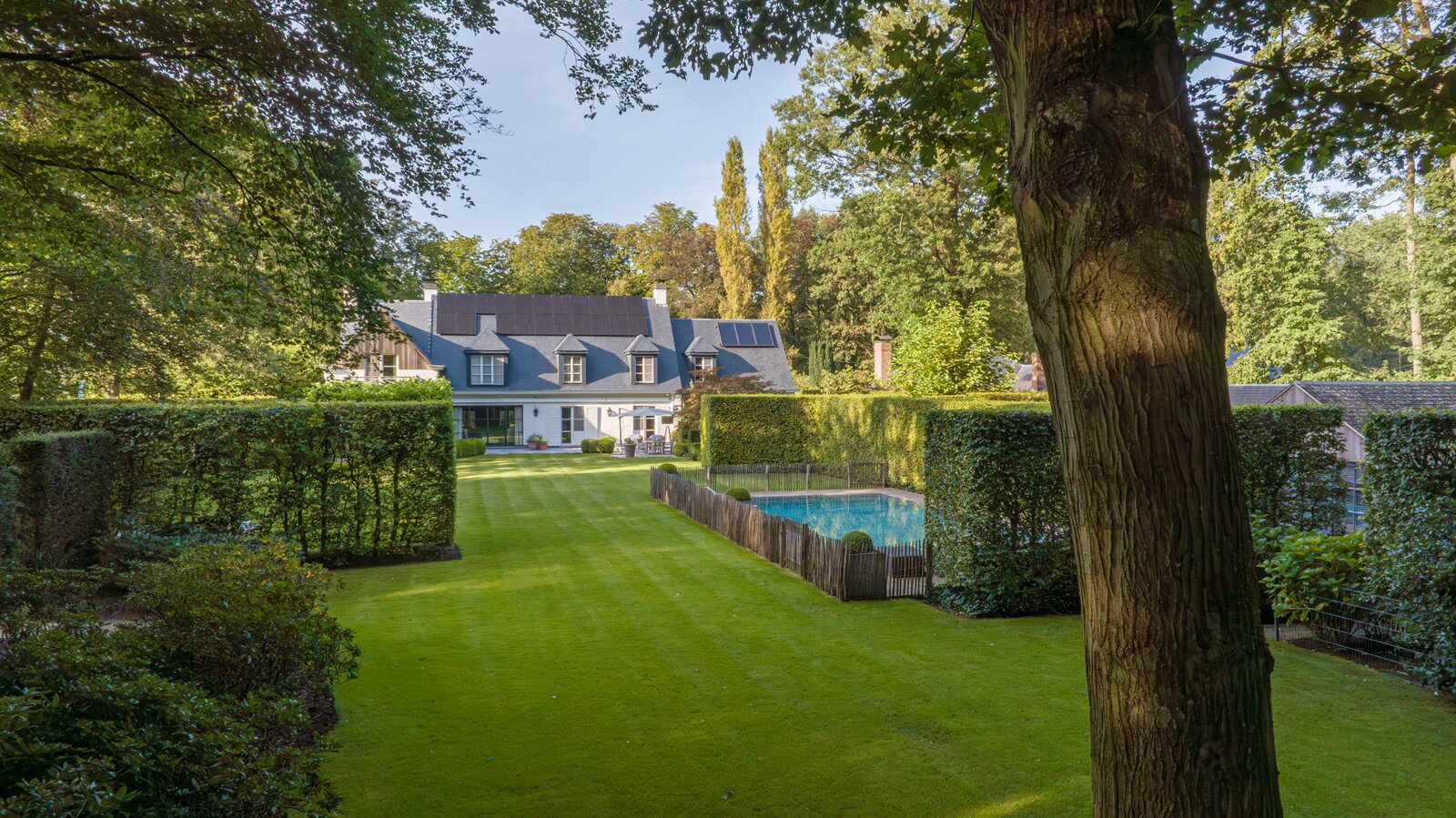 Er is een elegant ingericht bureau op de begane grond, een keuken met eetkamer, een royale eetkamer met een aparte openhaard/BBQ en een ruime salon met open haard, ideaal voor entertainment. De woning beschikt over een garage voor 2 auto's en een volledig vernieuwd dak met natuurleien (in 2023). De vloeren en parketten zijn prachtig bewaard gebleven, en de woning is uitgerust met domotica voor ultiem comfort. Buiten kunt u genieten van een luxueuze levensstijl met een poolhouse inclusief keuken, douche, sauna en geïntegreerde BBQ, naast een overloopzwembad van 12 x 5,5 meter. Het zwembad is omringd door een prachtig aangelegde tuin met een Japanse visvijver.