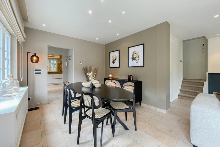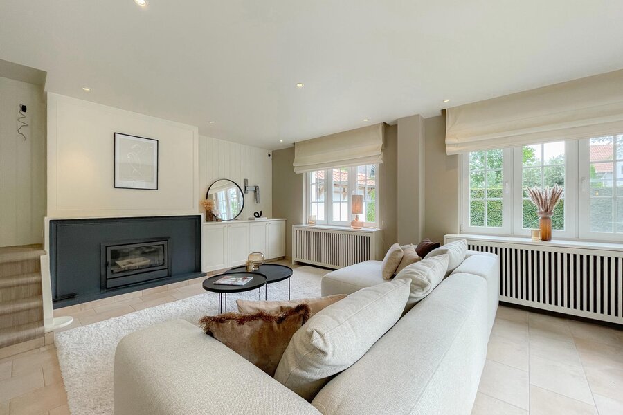 Samenstelling: Inkomhal met gastentoilet. Aangename zithoek met open haard, met aansluitend een lichtrijke eetkamer. Beide ruimtes geven uit op het terras en de perfect georiënteerde tuin. Afzonderlijke keuken met gezellige ontbijthoek, voorzien van alle hedendaagse comfort. Berging. Vanuit de woonkamer vertrekt de trap richting 1e verdieping.