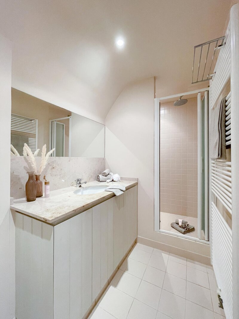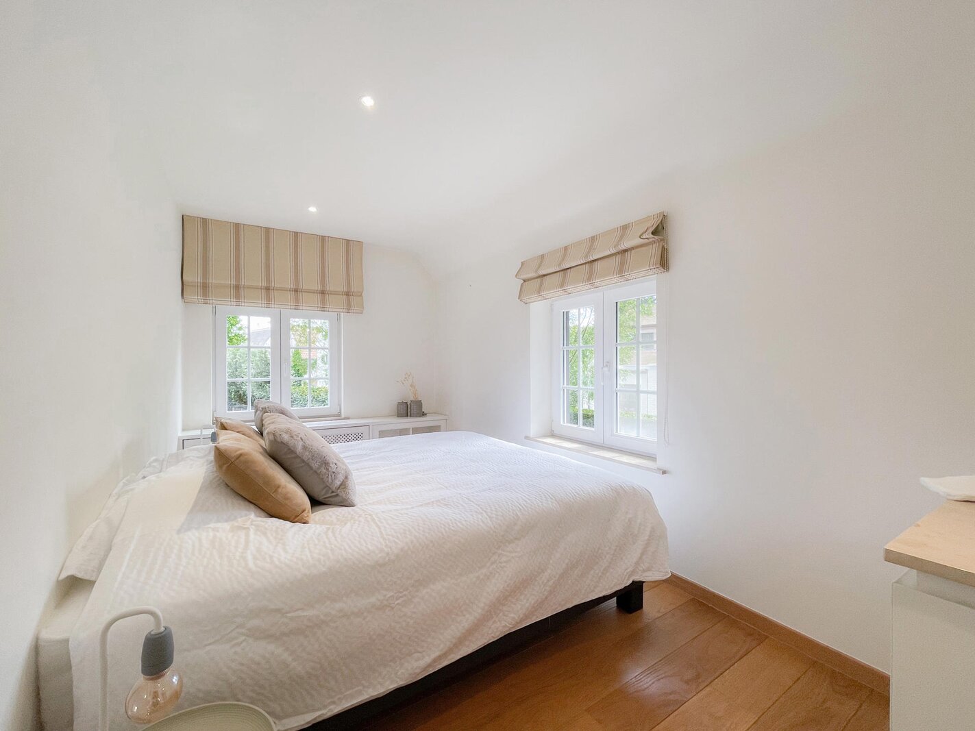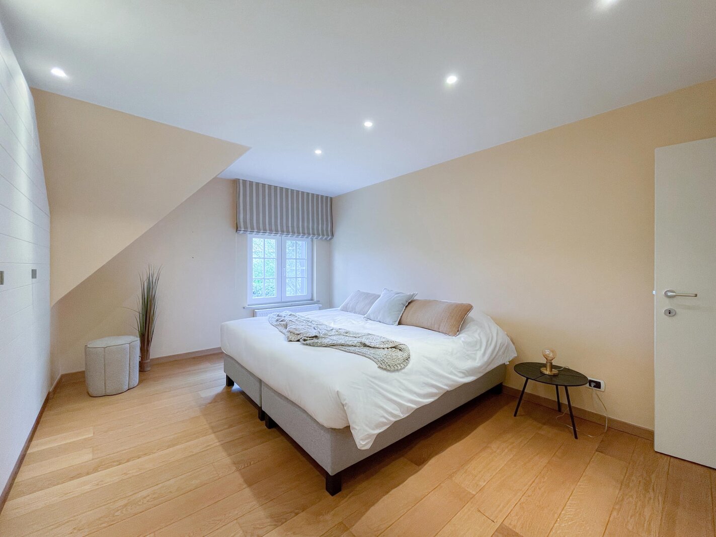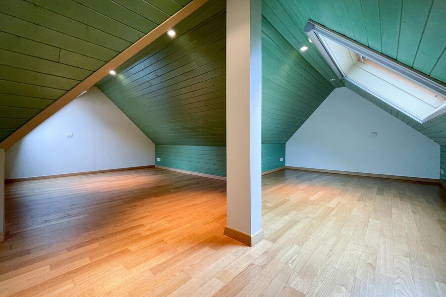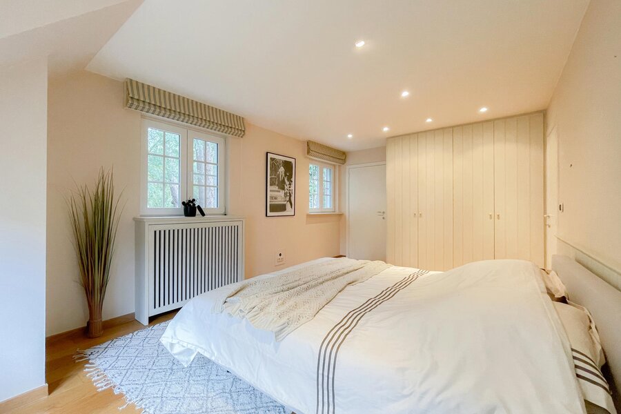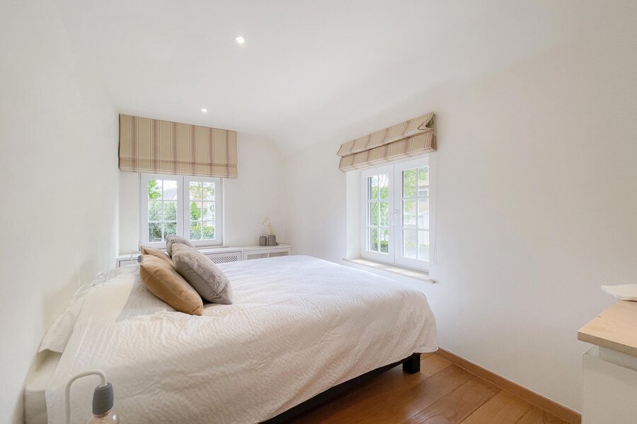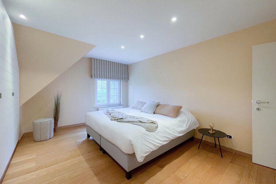 Op de 1e verdieping bevindt zich de nachthal / tv-hoek / bureelruimte. De master bedroom beschikt over een ensuite badkamer, bestaande uit ruime douche, lavabo en toilet. Ingemaakte kasten. Slaapkamer 2 en 3 beschikken eveneens over tal van ingemaakte kasten. Er is een afzonderlijke badkamer met ruime douche en lavabo. Apart toilet.