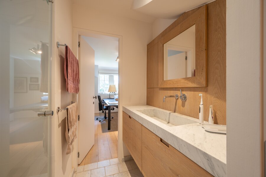 Ruime inkomhal met vestiaire en gastentoilet. Ruime living met open haard (gas) uitgevend op zuidgericht terras met zicht op de prachtige tuin met zwembad. Aansluitend TV-salon en bureau. Eetkamer met aansluitend volledig ingerichte keuken met ontbijthoek. Dubbele garage met wasplaats. Eerste verdieping: Ruime masterbedroom uitgevend op terras met uitzicht op de tuin en het zwembad, voorzien van dressing en ensuite badkamer (dubbele lavabo, ligbad, douche, toilet). Slaapkamer 2 met douchekamer. Slaapkamer 3 met douchekamer en aansluitend een privatieve living met kitchenette, die eveneens apart toegankelijk is via een buitentrap (ideaal voor conciërge of nanny). Tweede verdieping: Slaapkamer 4 en 5. Aparte badkamer voorzien van lavabo, ligbad en douche. Technische ruimte. De villa is volledig onderkelderd met home cinema, een wasplaats, technische ruimte en verschillende polyvalente ruimtes. Mogelijkheid tot wijnkelder. Buitenparking met plaats voor meerdere wagens.