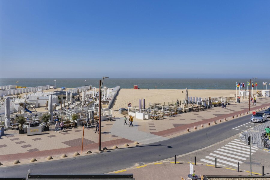 Indeling: inkomhal met vestiaire en toilet, mooie leefruimte met zit- en eethoek en volledig uitgeruste open keuken. Prachtige zichten op de zee én het plein (7 meter gevelbreedte!). Nachthal, 3 dubbele slaapkamers waarvan één master met dressing en douchekamer, tweede afzonderlijke douchekamer.