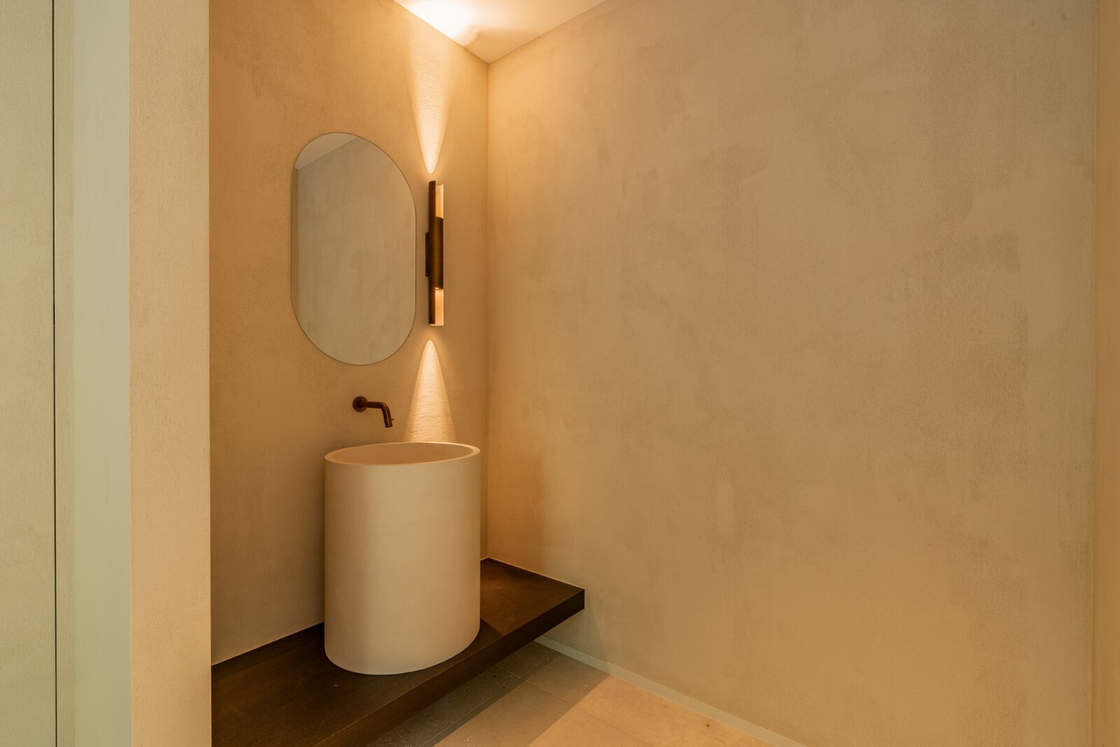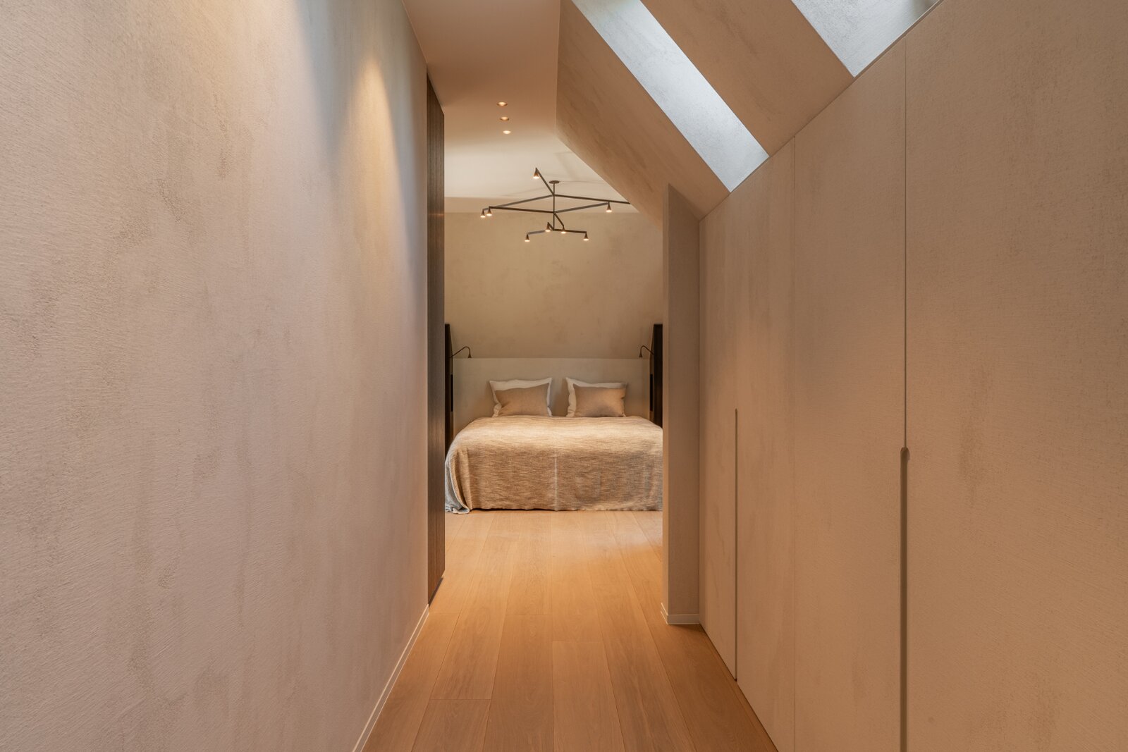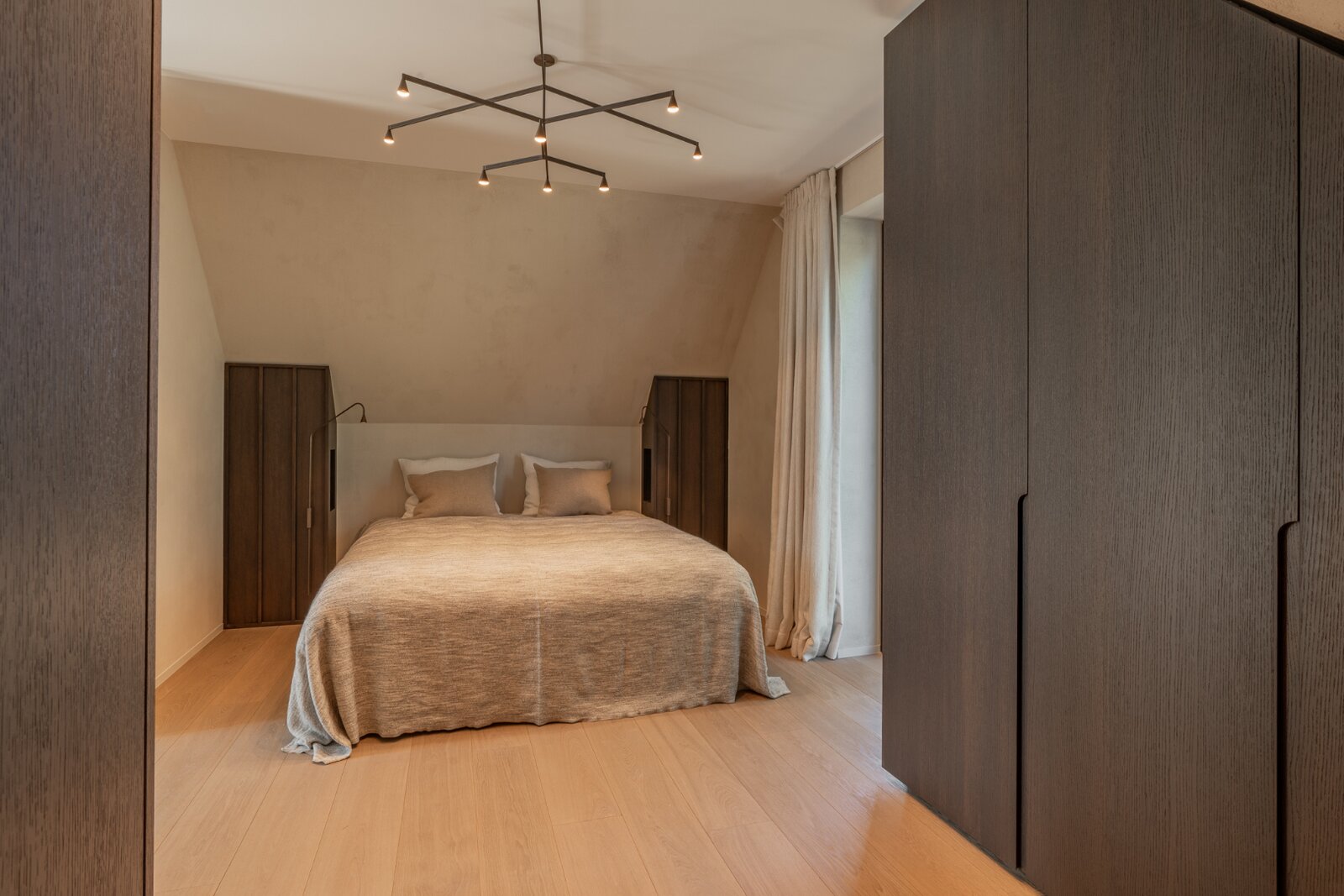 Op de 1ste verdieping: Nachthal met toilet en berging. Masterbedroom met ensuite badkamer (dubbele lavabo, bad, douche en apart toilet) en uitgevend op een zuidgericht terras. Slaapkamer 2 met ingemaakte kasten en ensuite douchekamer (dubbele lavabo en douche). Slaapkamer 3 met ingemaakte kasten en ensuite douchekamer (lavabo en douche). Slaapkamers 4 en 5 elk voorzien van ingemaakte kasten. Aparte badkamer voorzien van dubbele lavabo, ligbad en inloopdouche. Apart toilet.