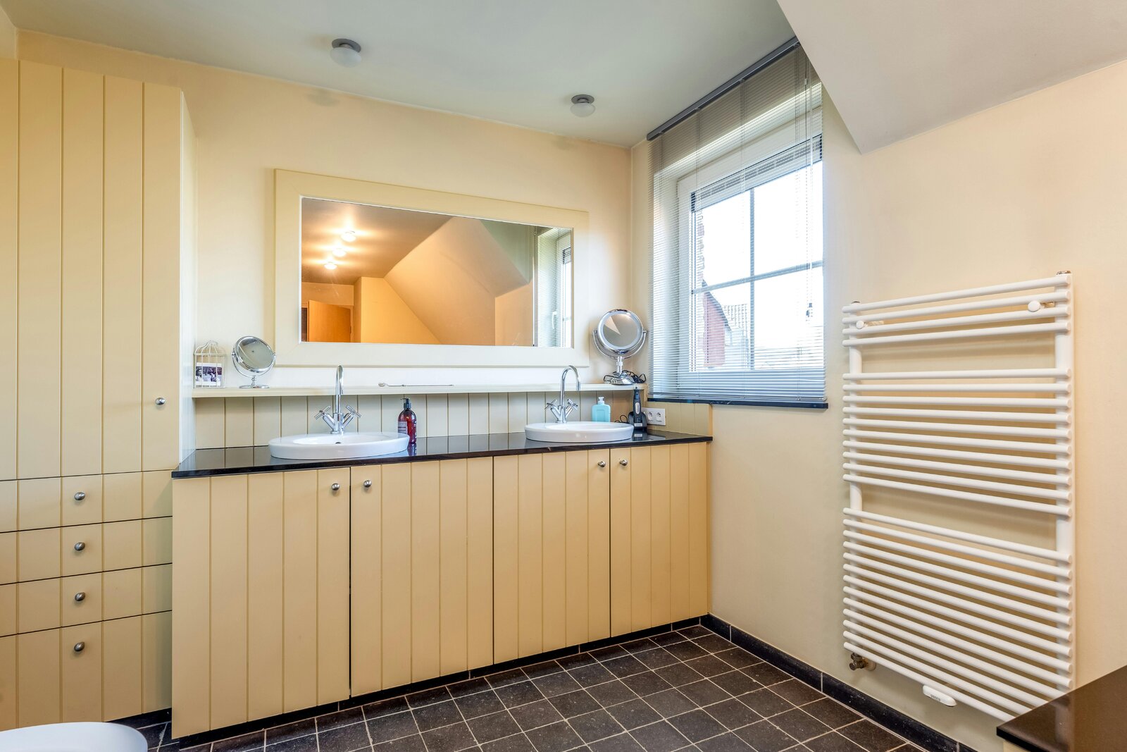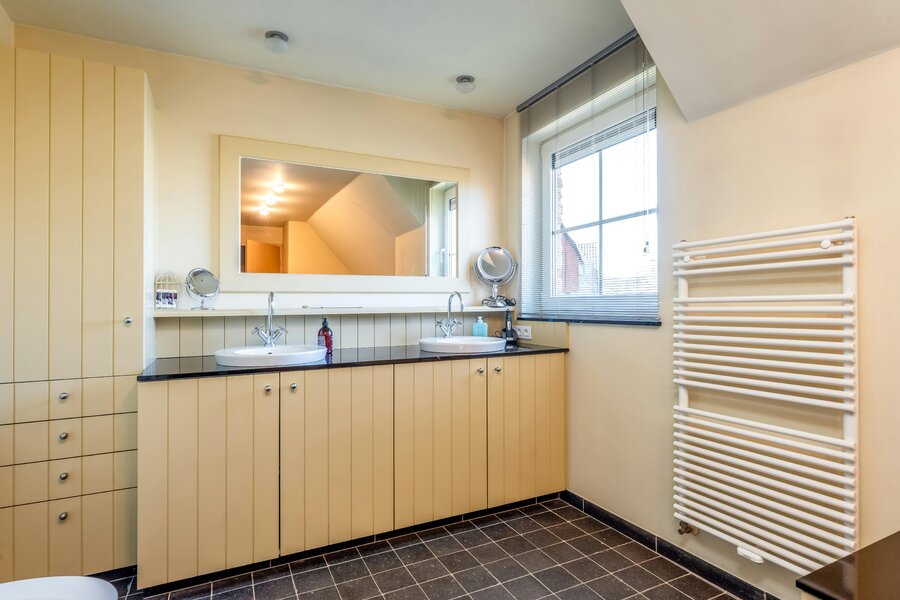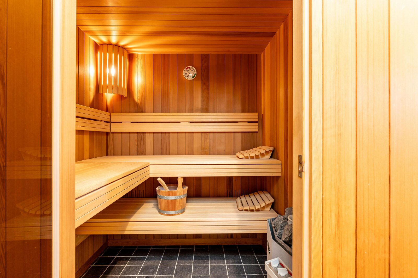 - badkamer bestaande uit ligbad, dubbele wastafel en ingebouwde sauna