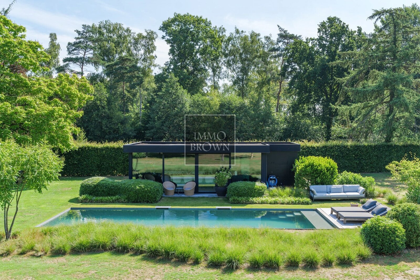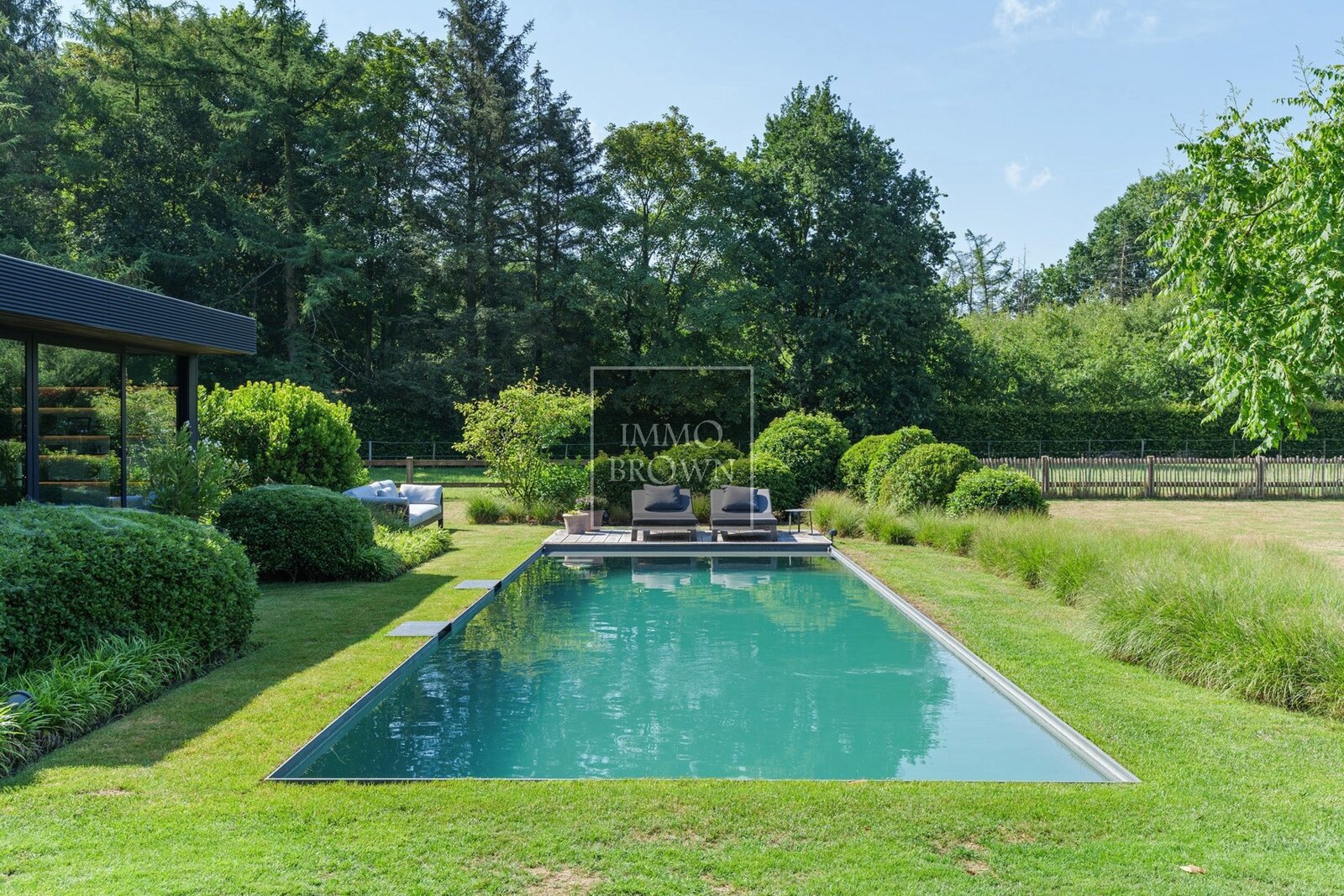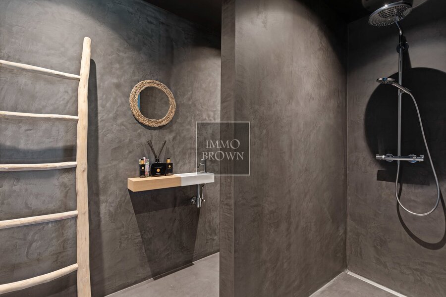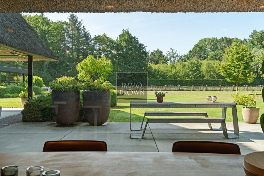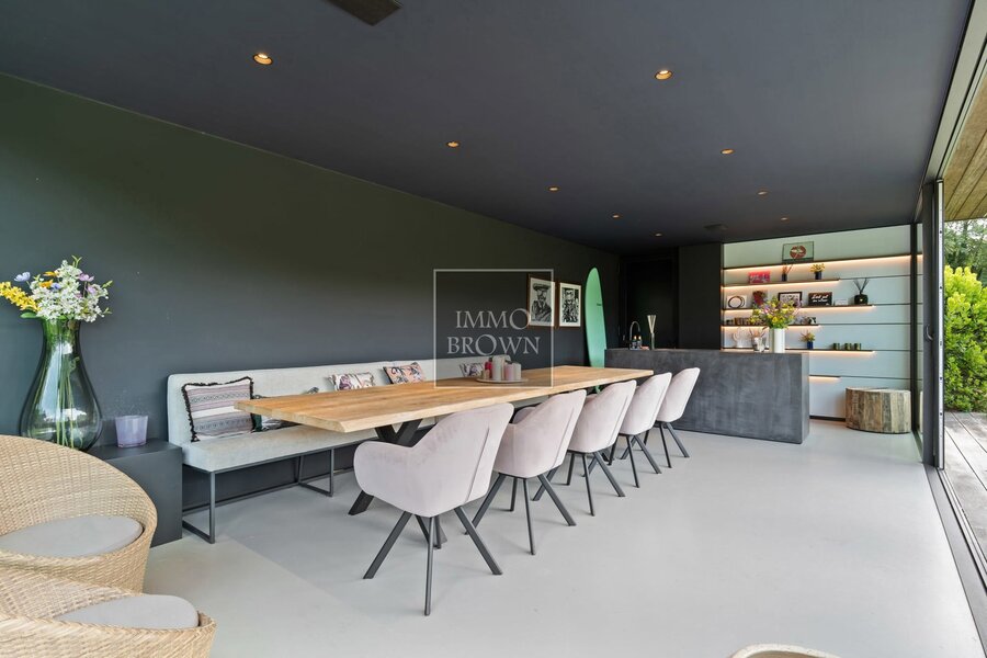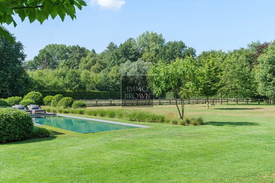 Wat deze villa uitzonderlijk maakt, is de buitenbeleving. De tuin loopt naadloos over in het natuurdomein en vormt een oase van rust en privacy. Centraal in de tuin ligt een natuurlijk zwembad, dat op een ecologische manier wordt gefilterd. Het bijhorende poolhouse biedt een luxueuze plek om te ontspannen, met zicht op het groen en volledige privacy.