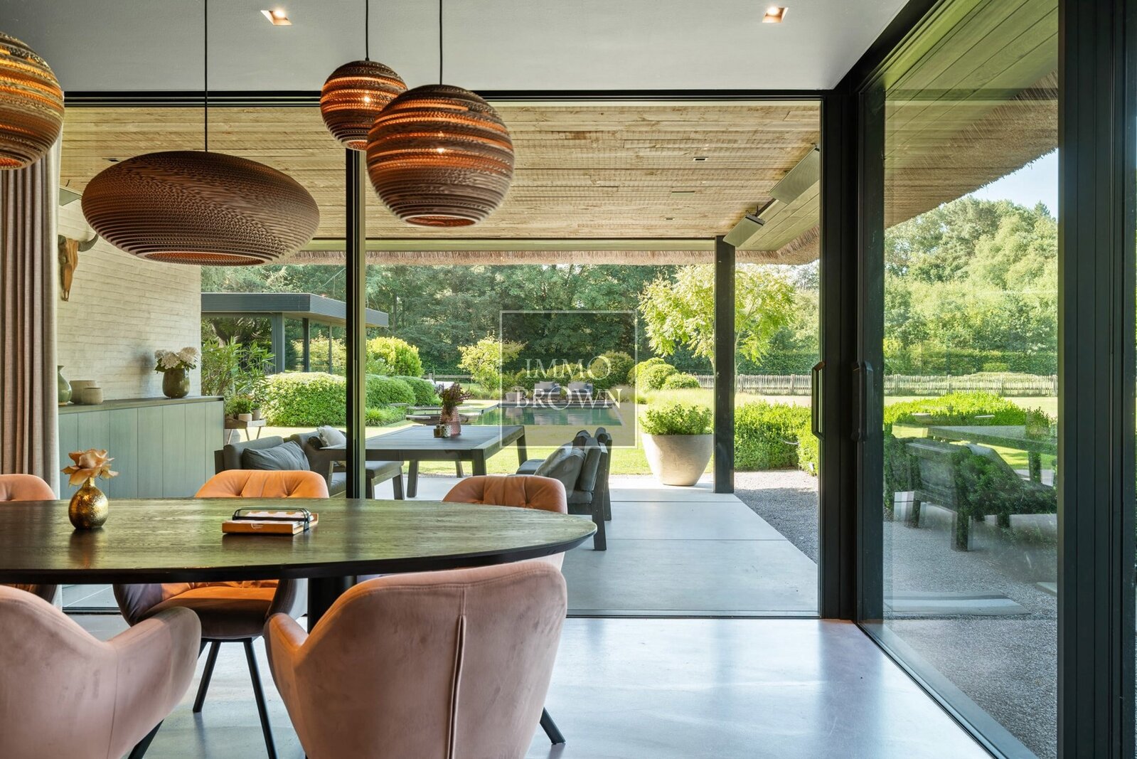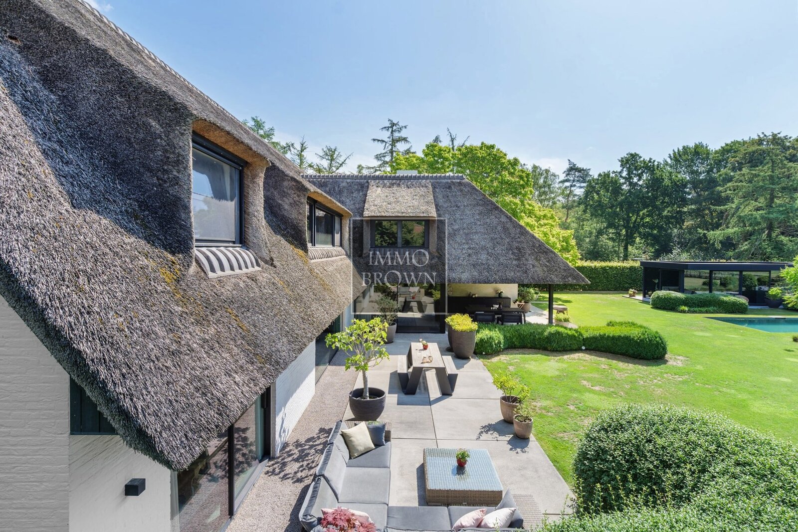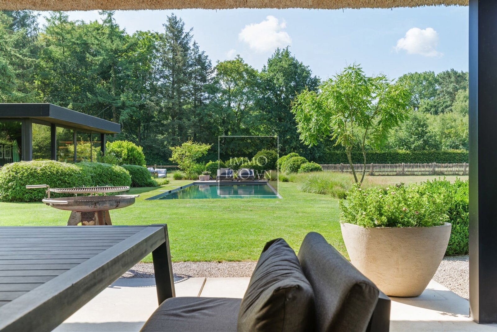 Wat deze villa uitzonderlijk maakt, is de buitenbeleving. De tuin loopt naadloos over in het natuurdomein en vormt een oase van rust en privacy. Centraal in de tuin ligt een natuurlijk zwembad, dat op een ecologische manier wordt gefilterd. Het bijhorende poolhouse biedt een luxueuze plek om te ontspannen, met zicht op het groen en volledige privacy.