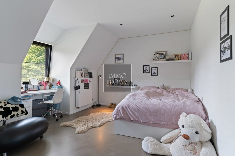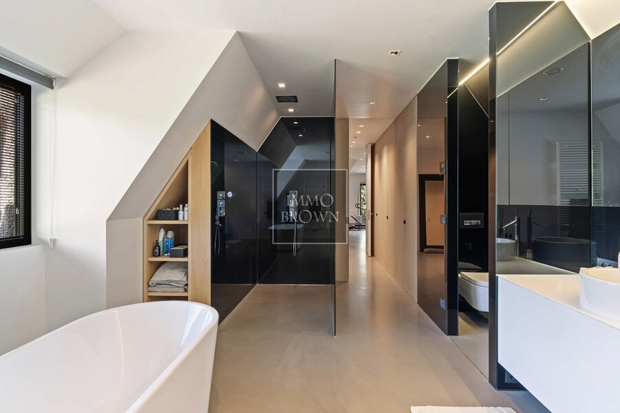 Bij het binnenkomen word je meteen ondergedompeld in een gevoel van ruimte en licht. Via de ruime inkomhal kom je terecht in de ruime leefruimte met gashaard met aansluitend de eetplaats die geniet van een prachtig zicht op de groene tuin. Vervolgens vormt de industriële keuken het kloppende hart van de woning. Met haar robuuste afwerking, hoogwaardige toestellen en een gezellige open haard is dit de ideale plek voor wie houdt van koken en samen zijn. De aansluitende leefruimte straalt een warme sfeer uit, met een ingebouwde gashaard en grote raampartijen die uitkijken op de omliggende natuur. De woning beschikt over vier volwaardige slaapkamers, elk met een uniek uitzicht en een doordachte indeling. De drie badkamers zijn stijlvol afgewerkt en bieden alle comfort. Doorheen de hele woning is er vloerverwarming aanwezig, wat zorgt voor een aangenaam binnenklimaat.